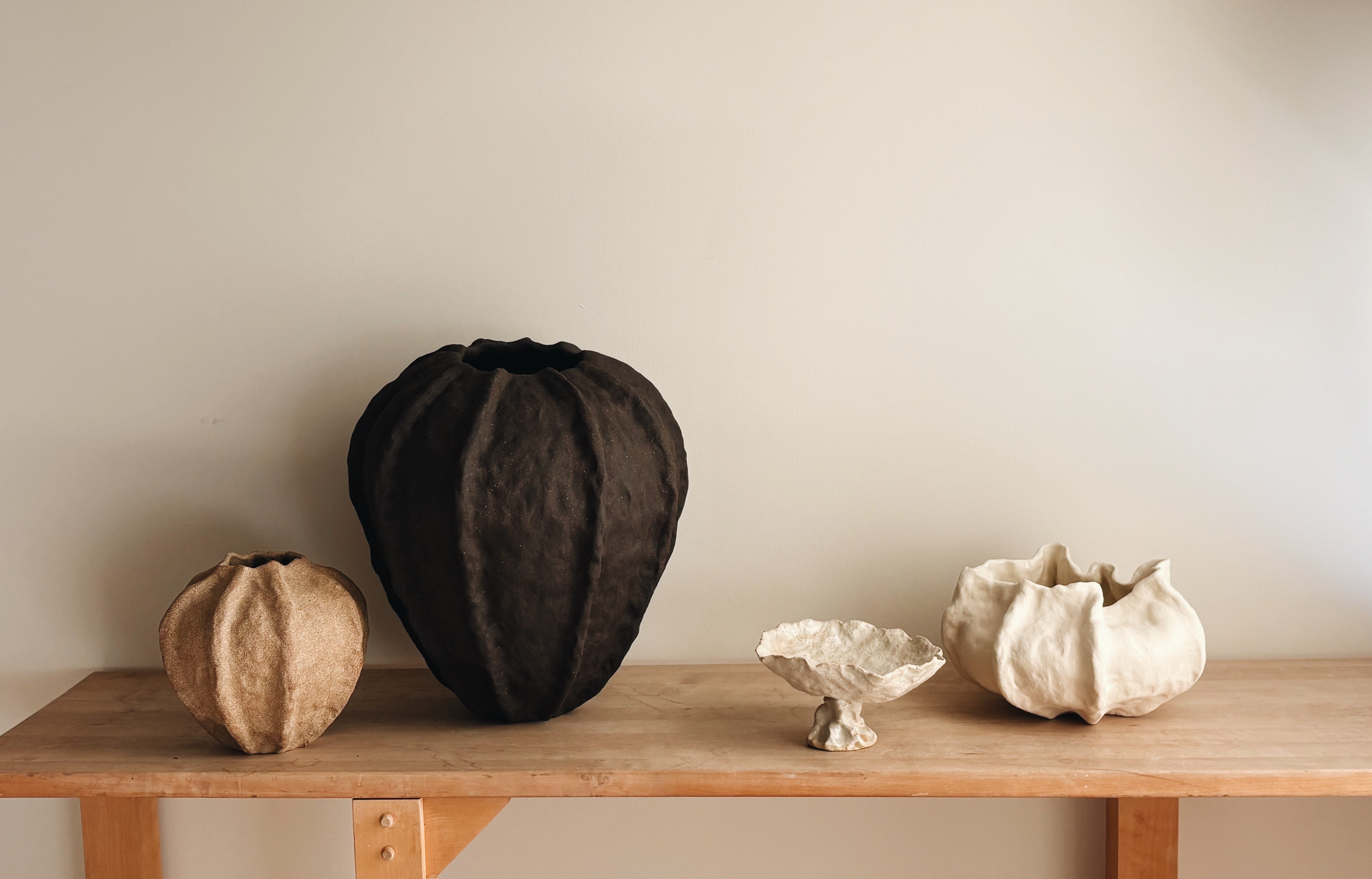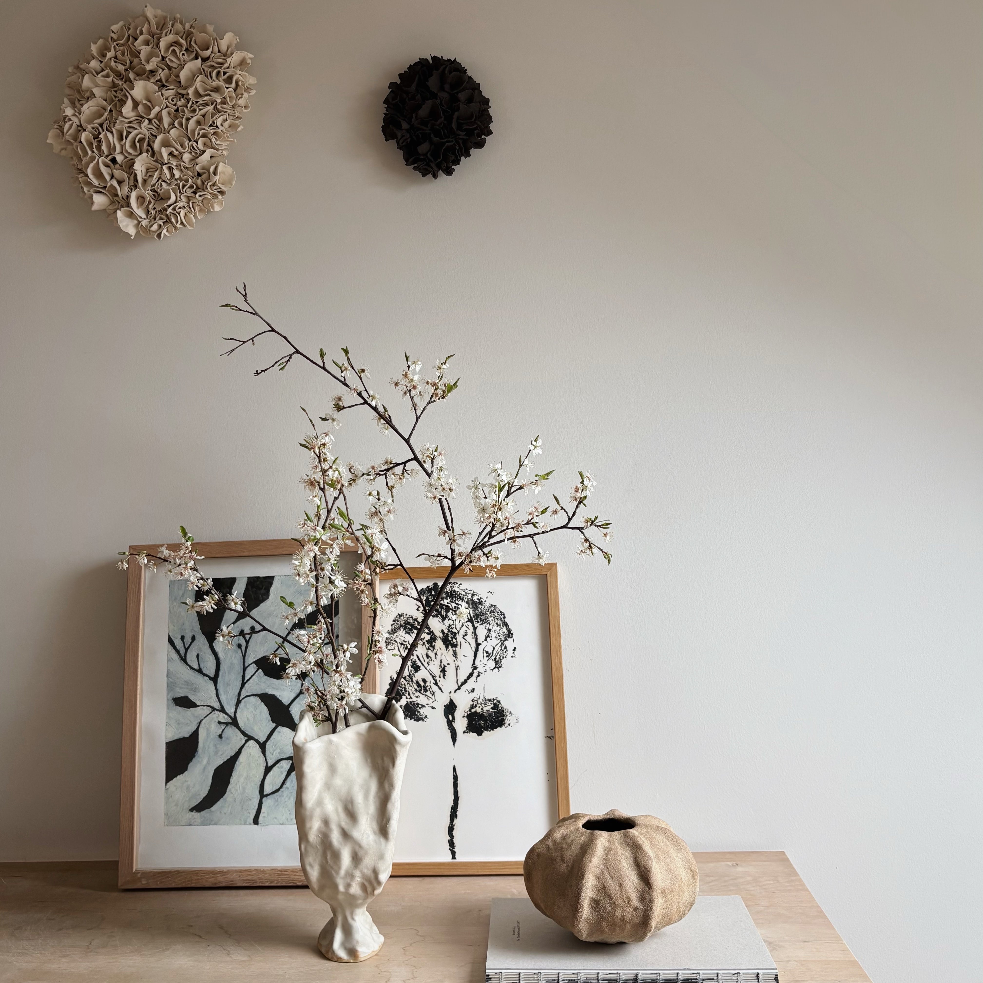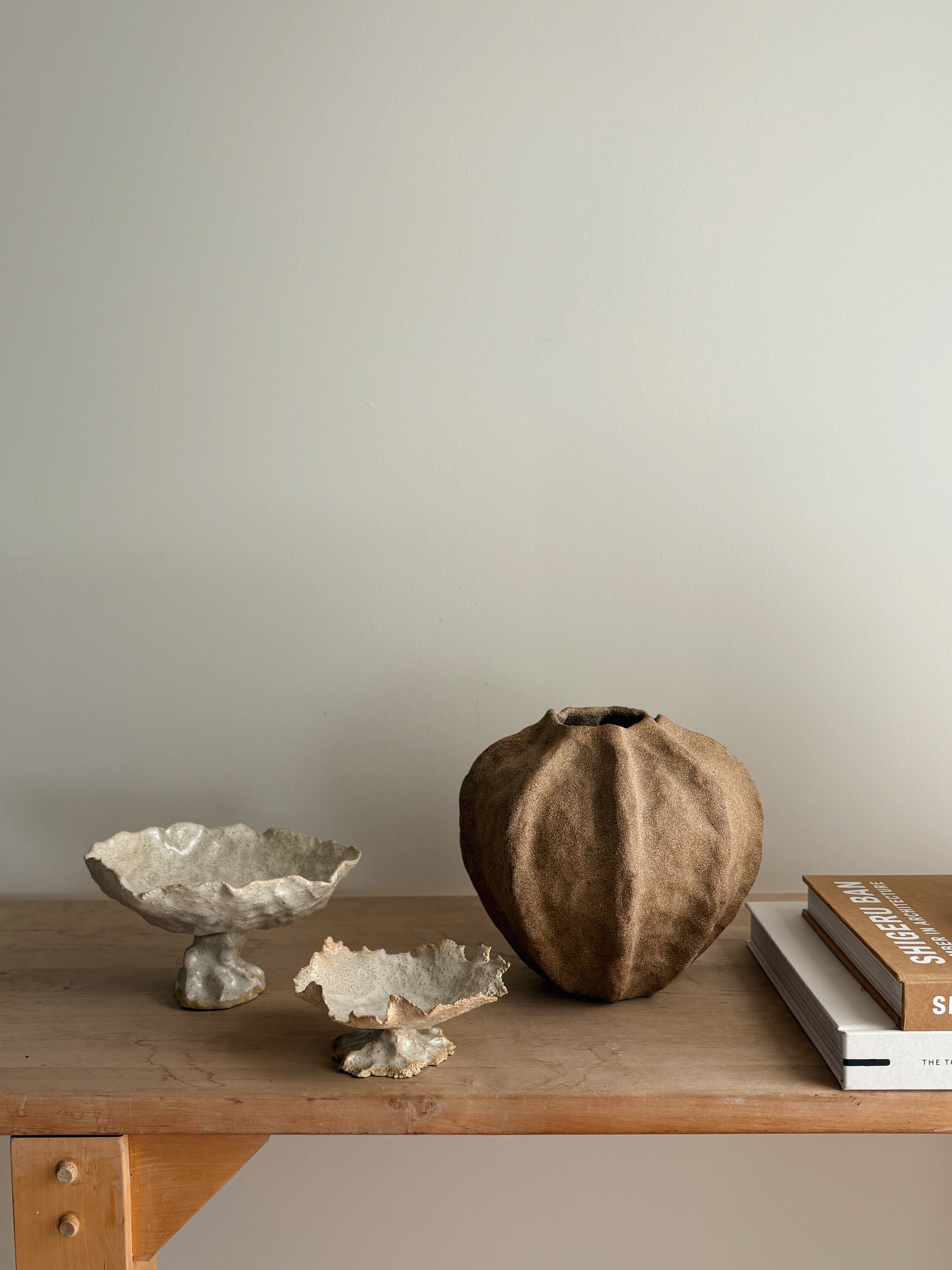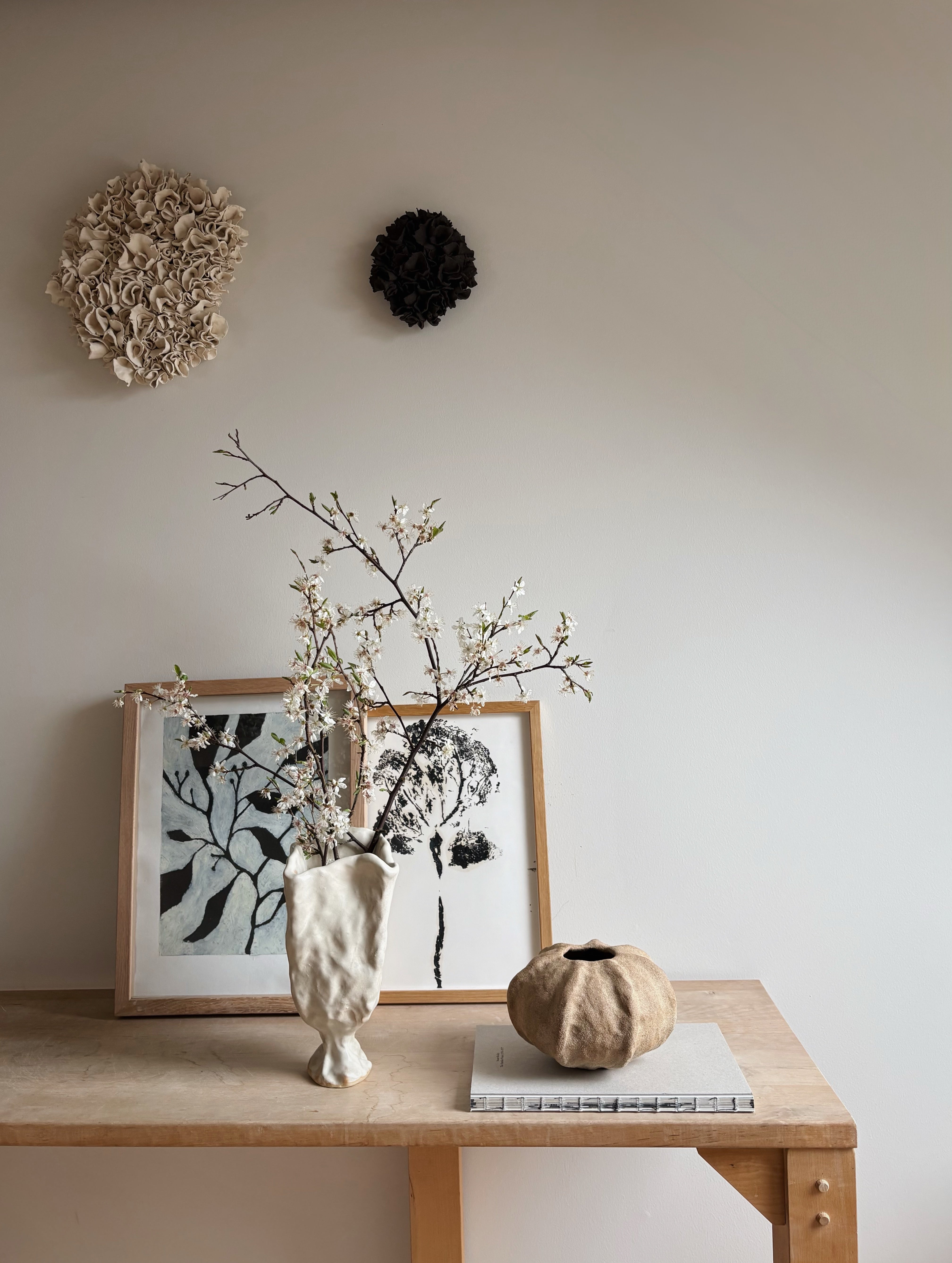 Mine værker er håndbyggede i et intuitivt og meditativt rum. Med taktile overflader og organiske former vækker de sanserne og tilfører rummet en særlig stemning og nærvær.