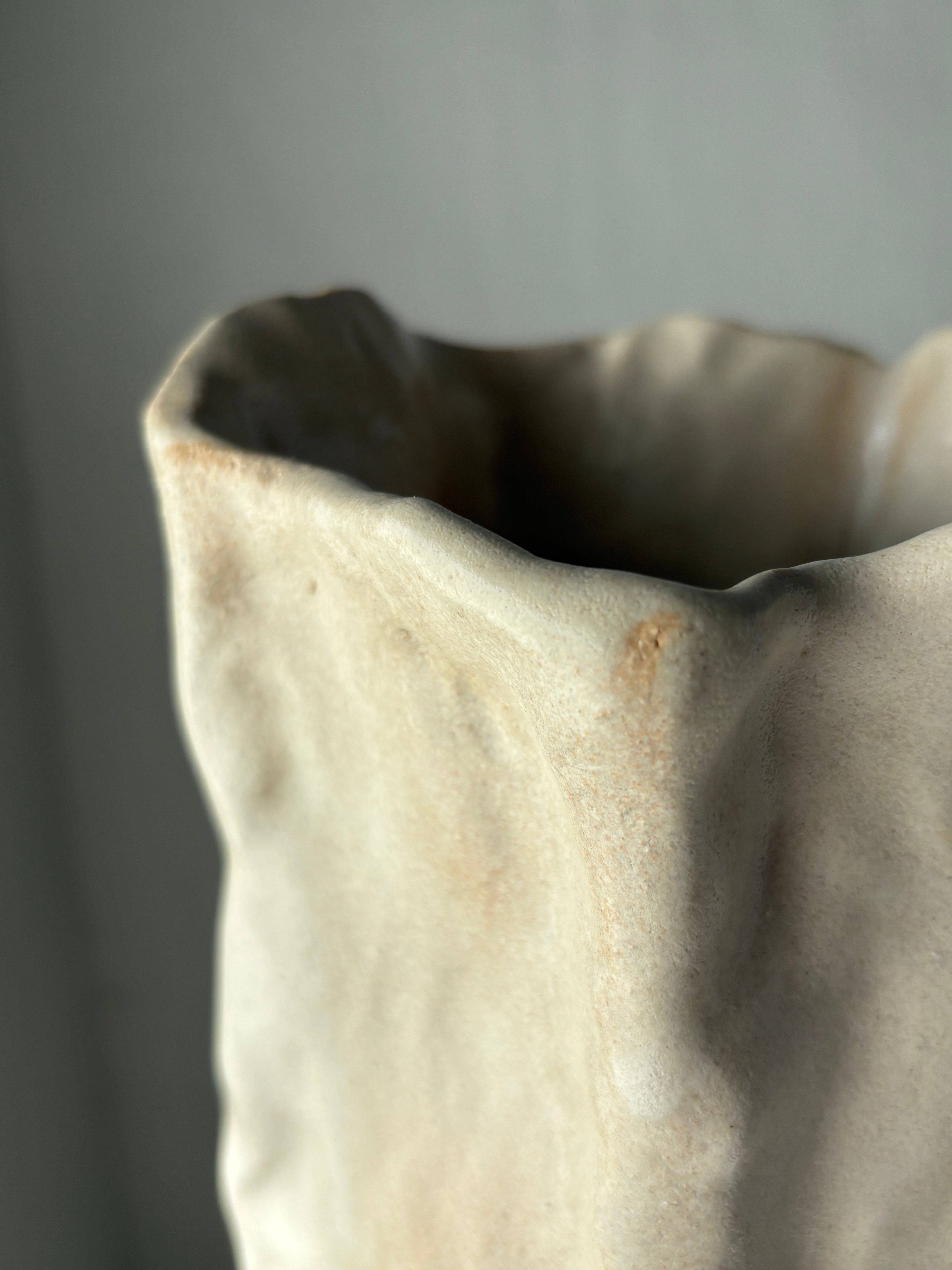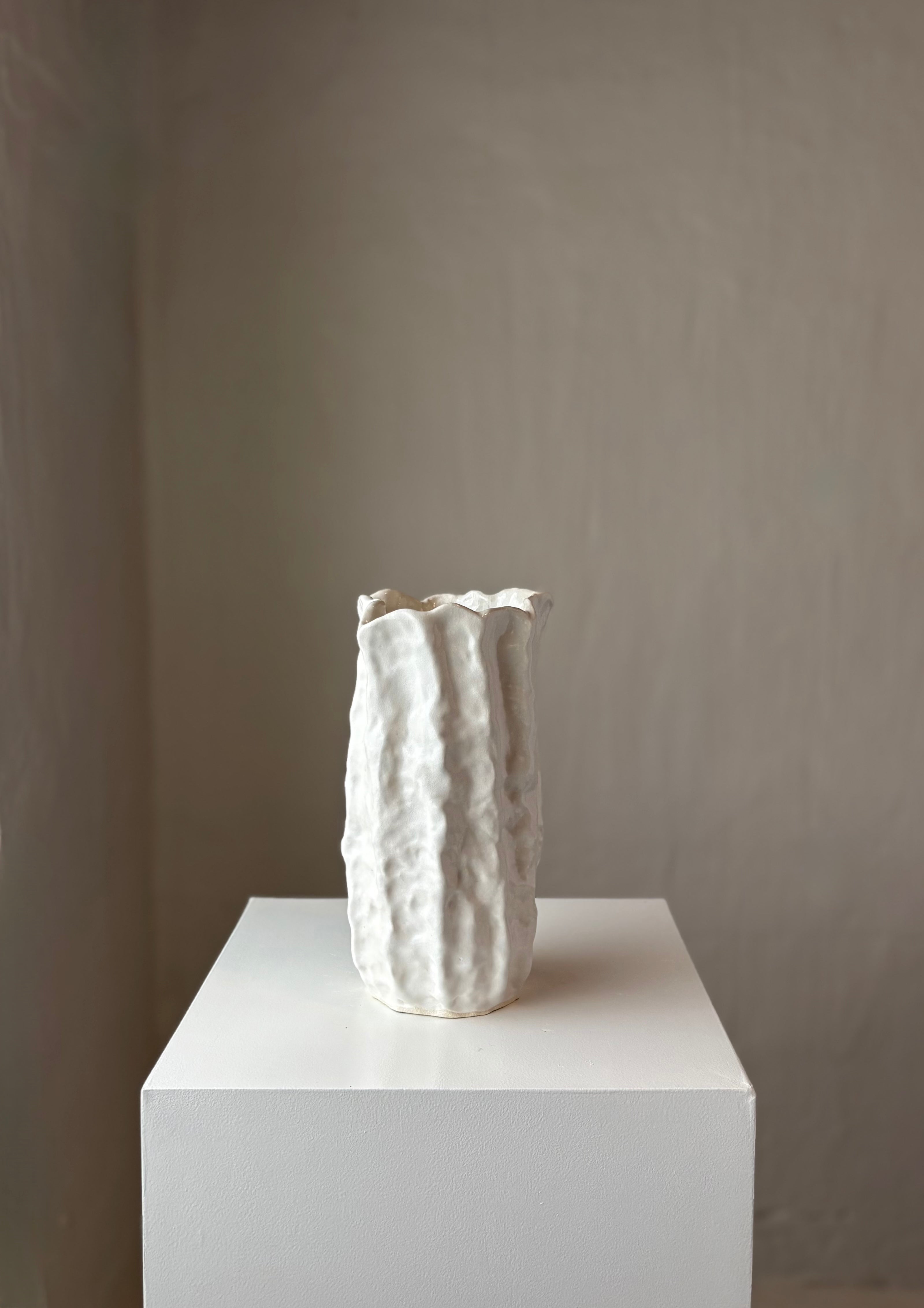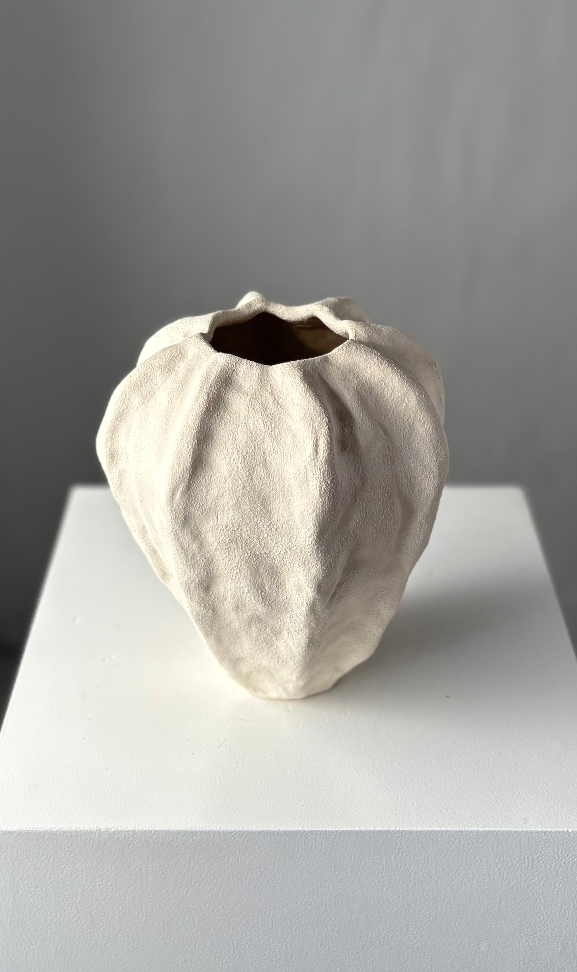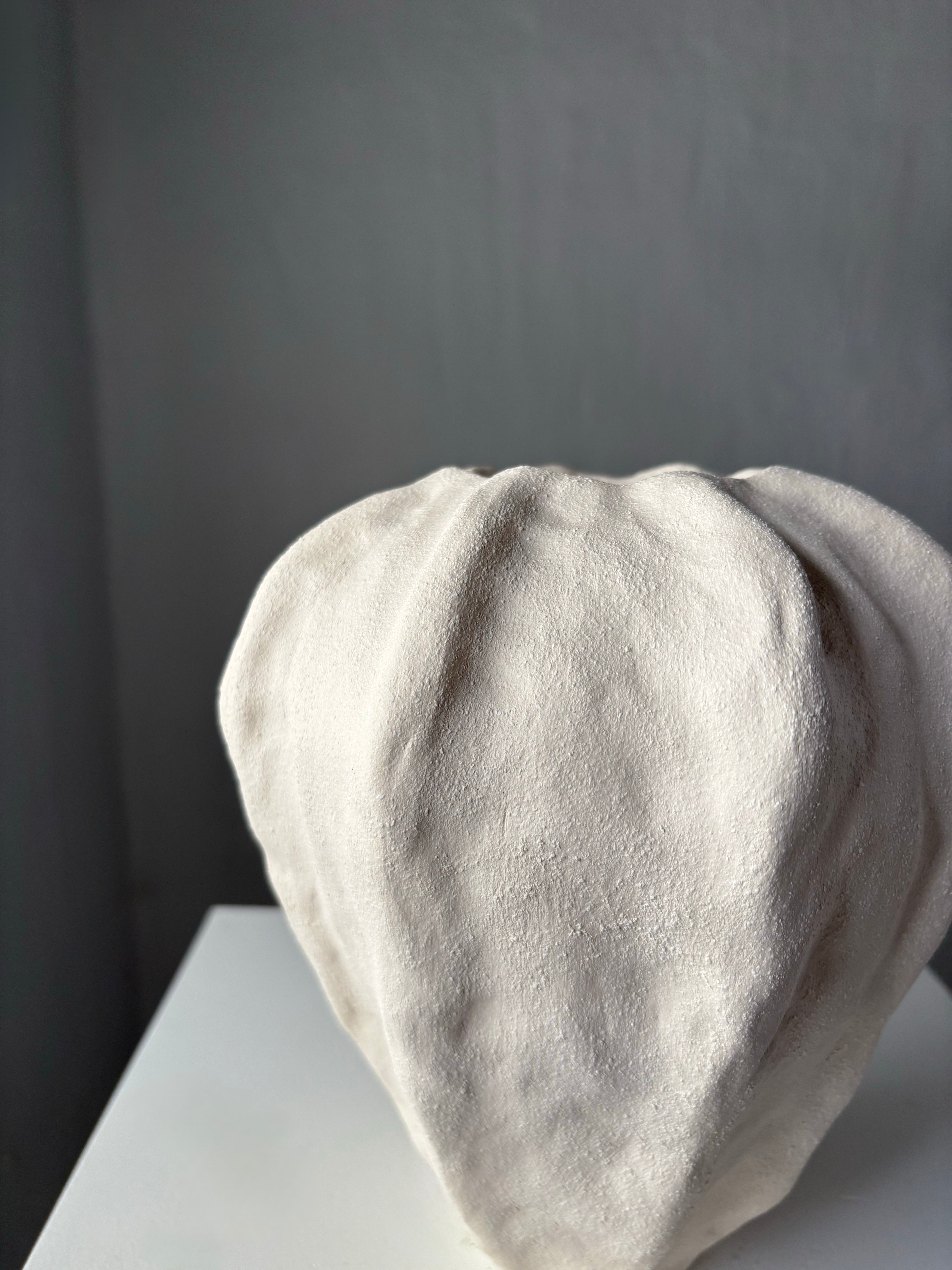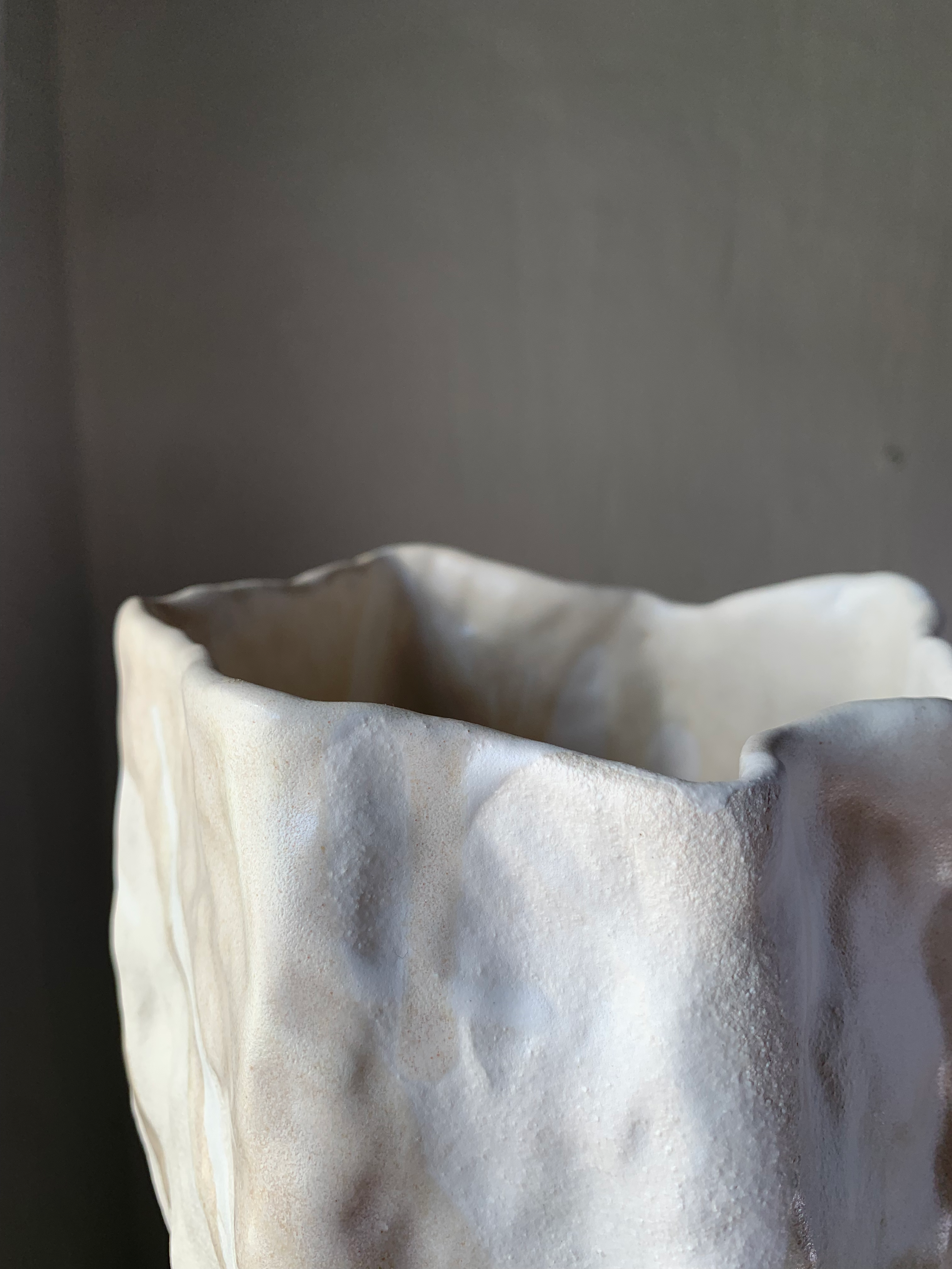 Håndbygget skulpturel unika vase i hvidler, af Leela Mette. Vasen er uglaseret og skaber både liv, dybde og tekstur.