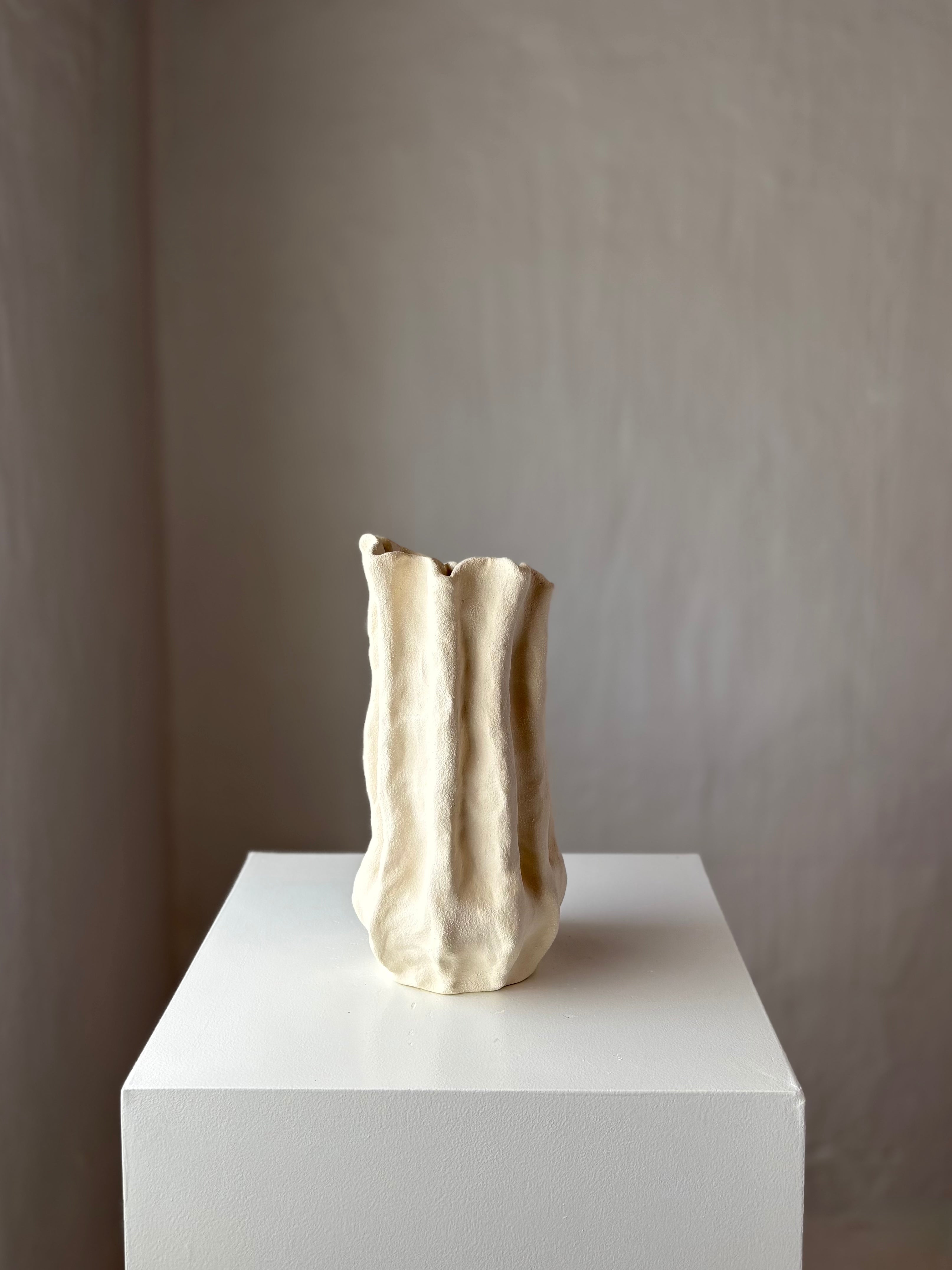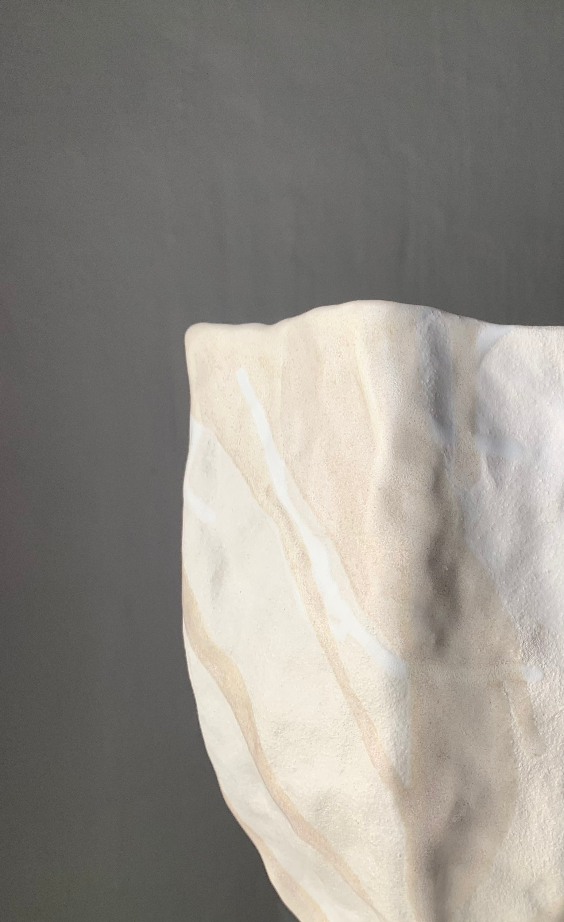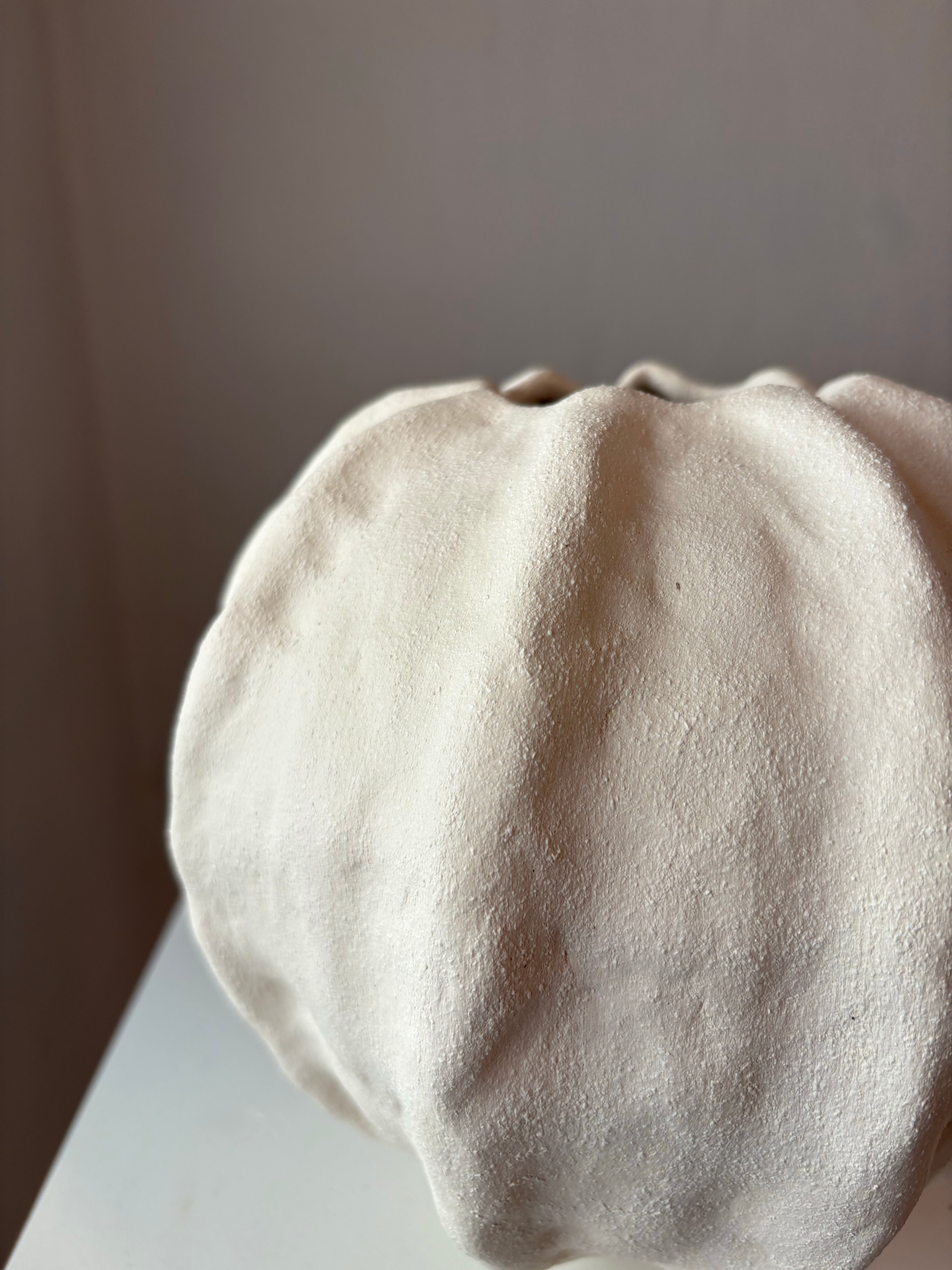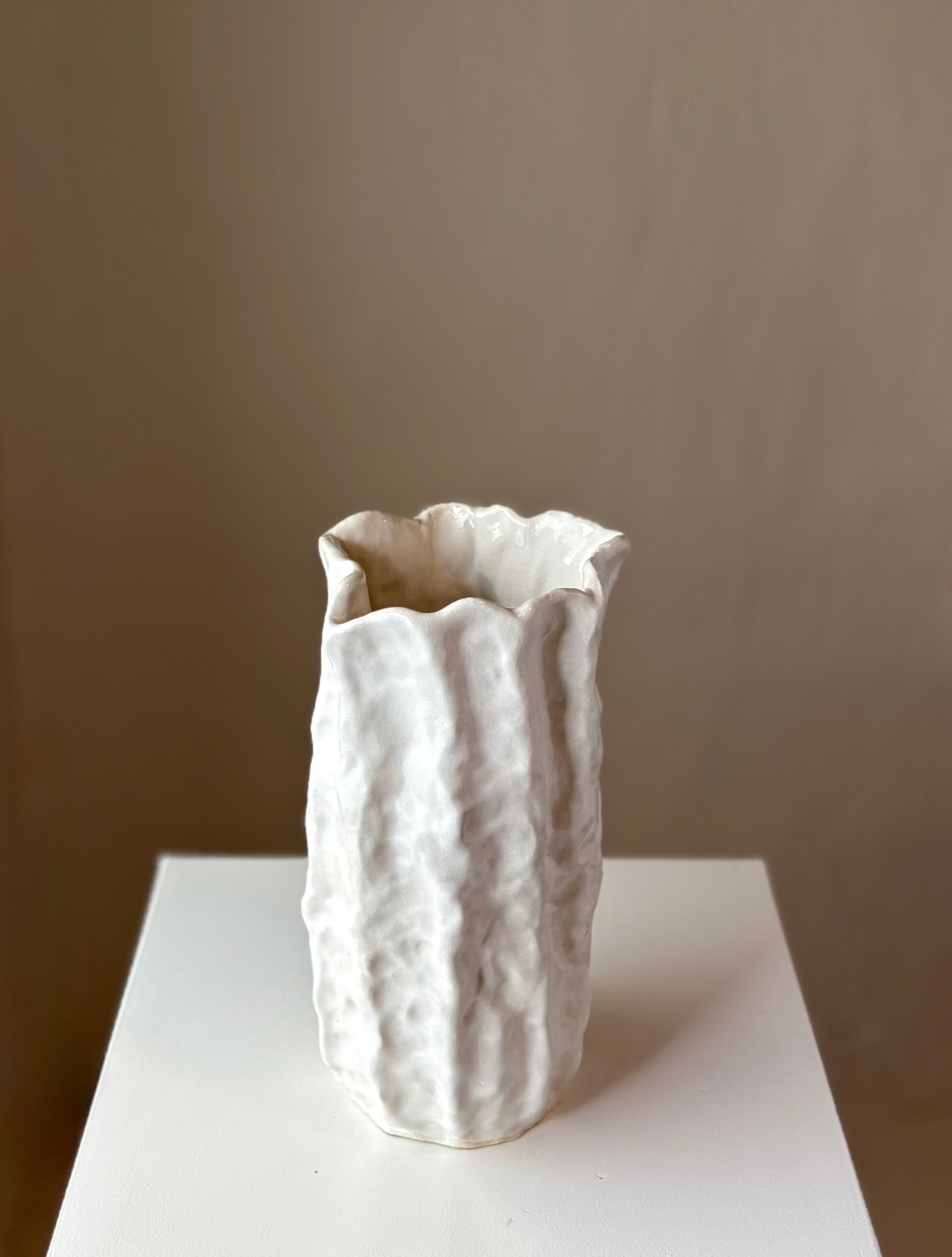Håndbygget skulpturel unika vase i hvidler, af Leela Mette. Vasen er uglaseret og skaber både liv, dybde og tekstur.