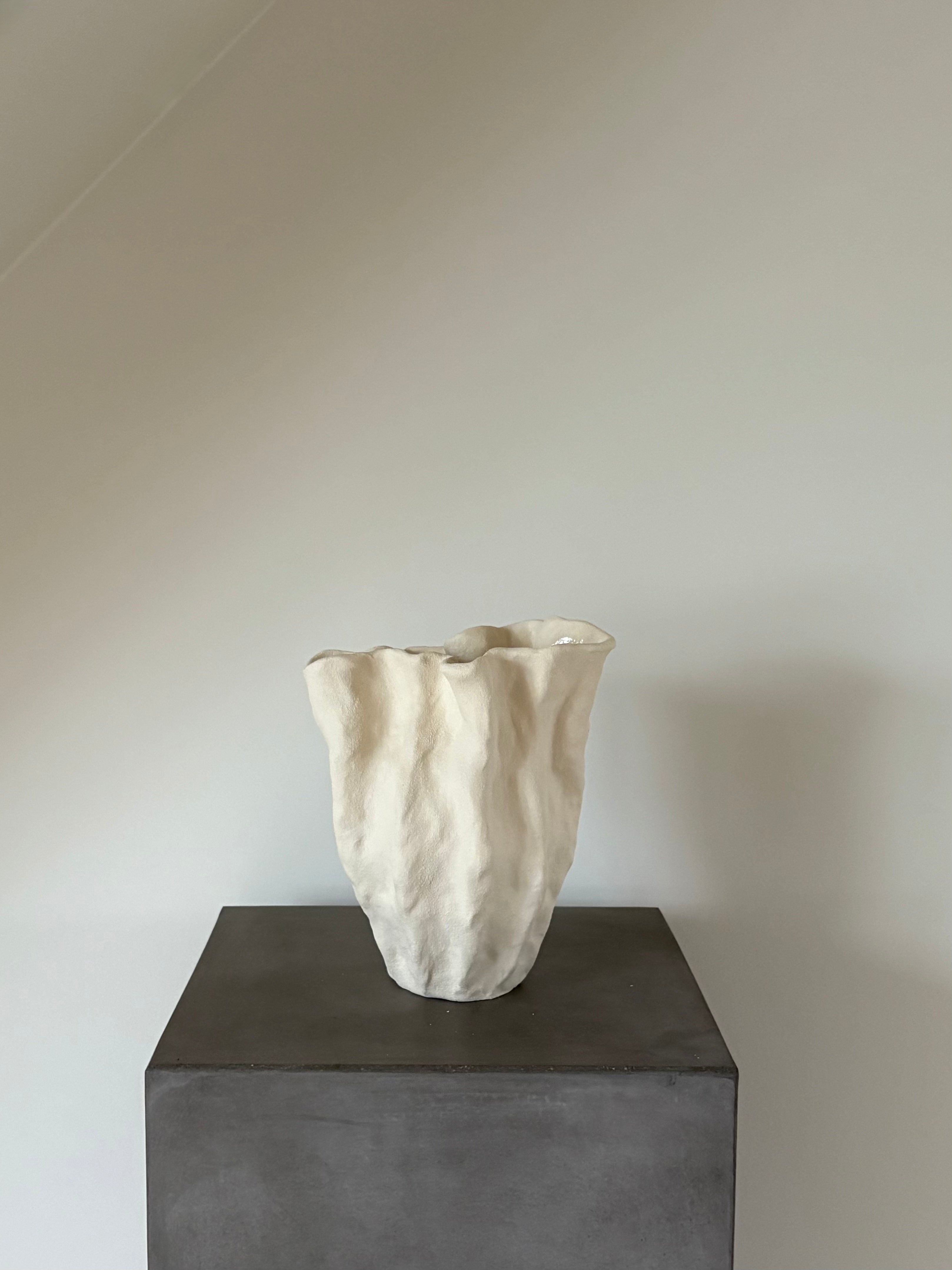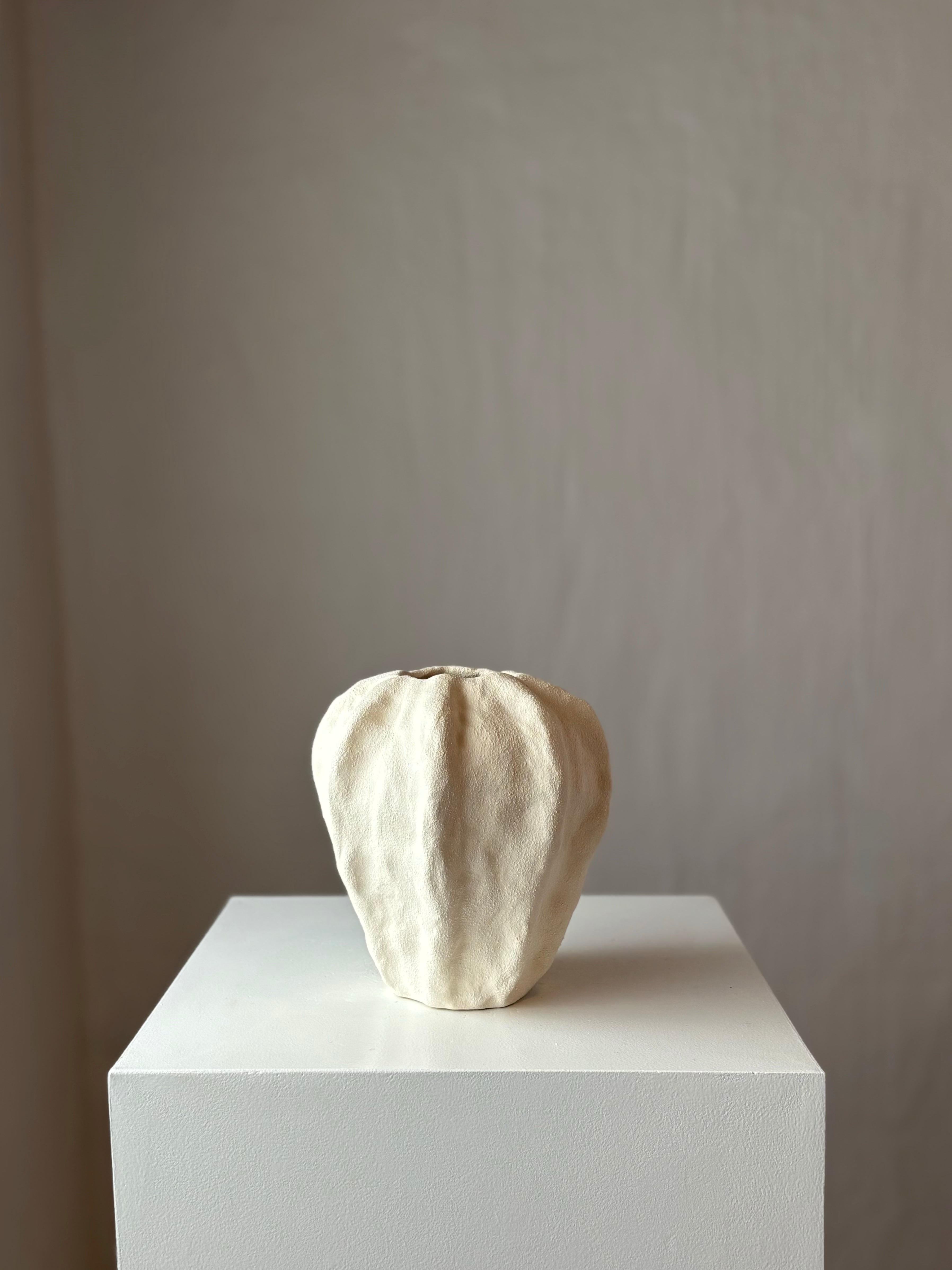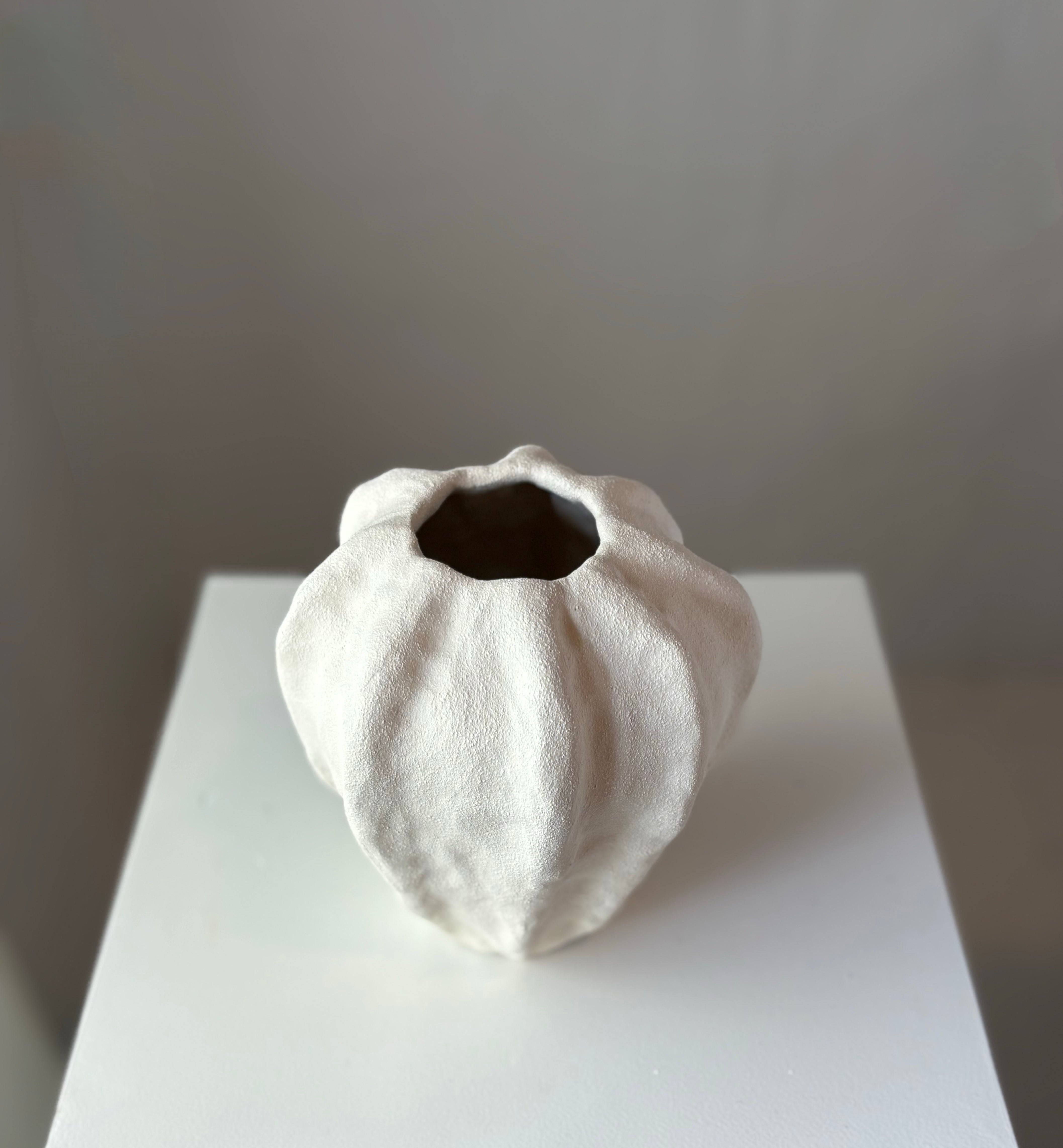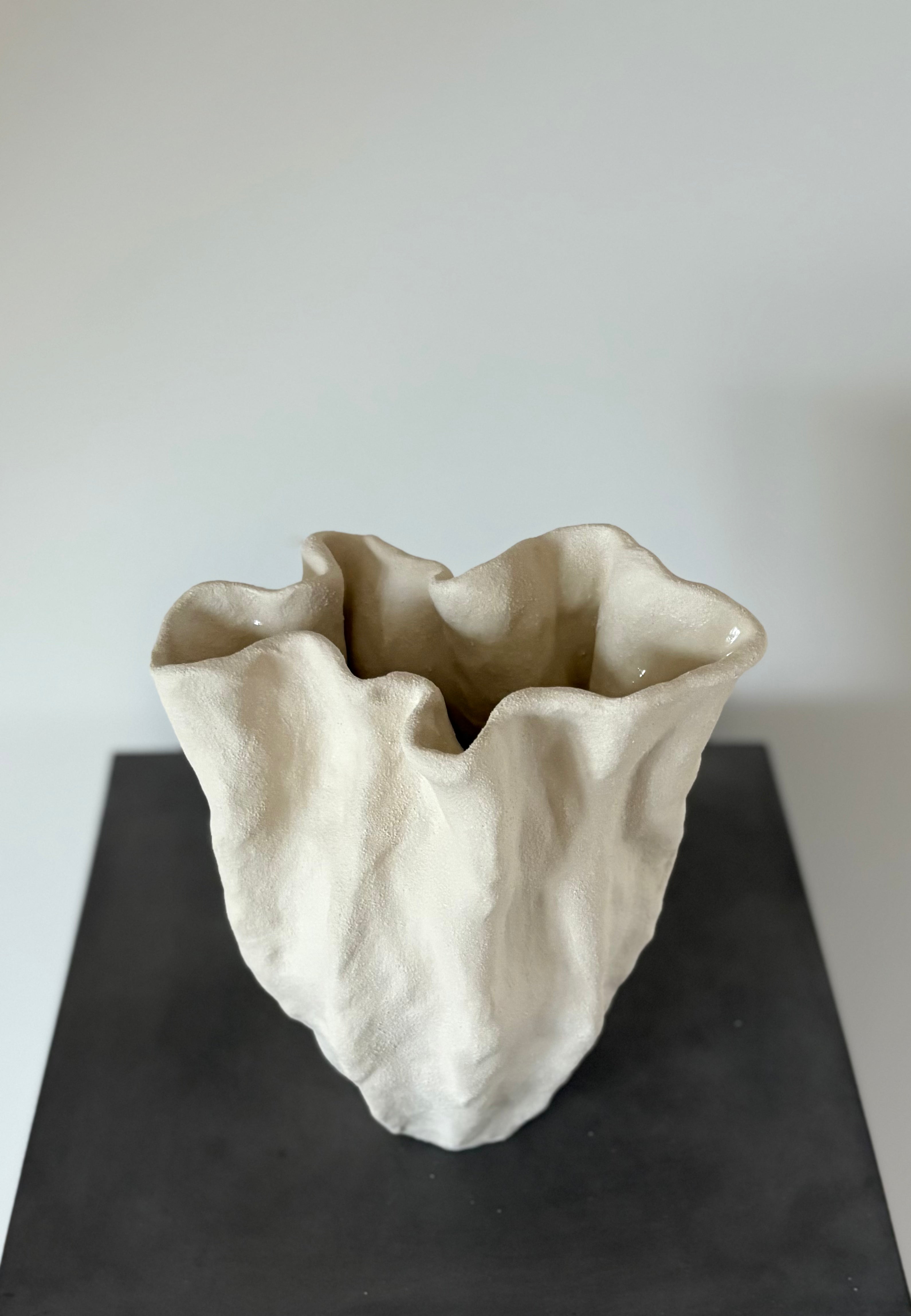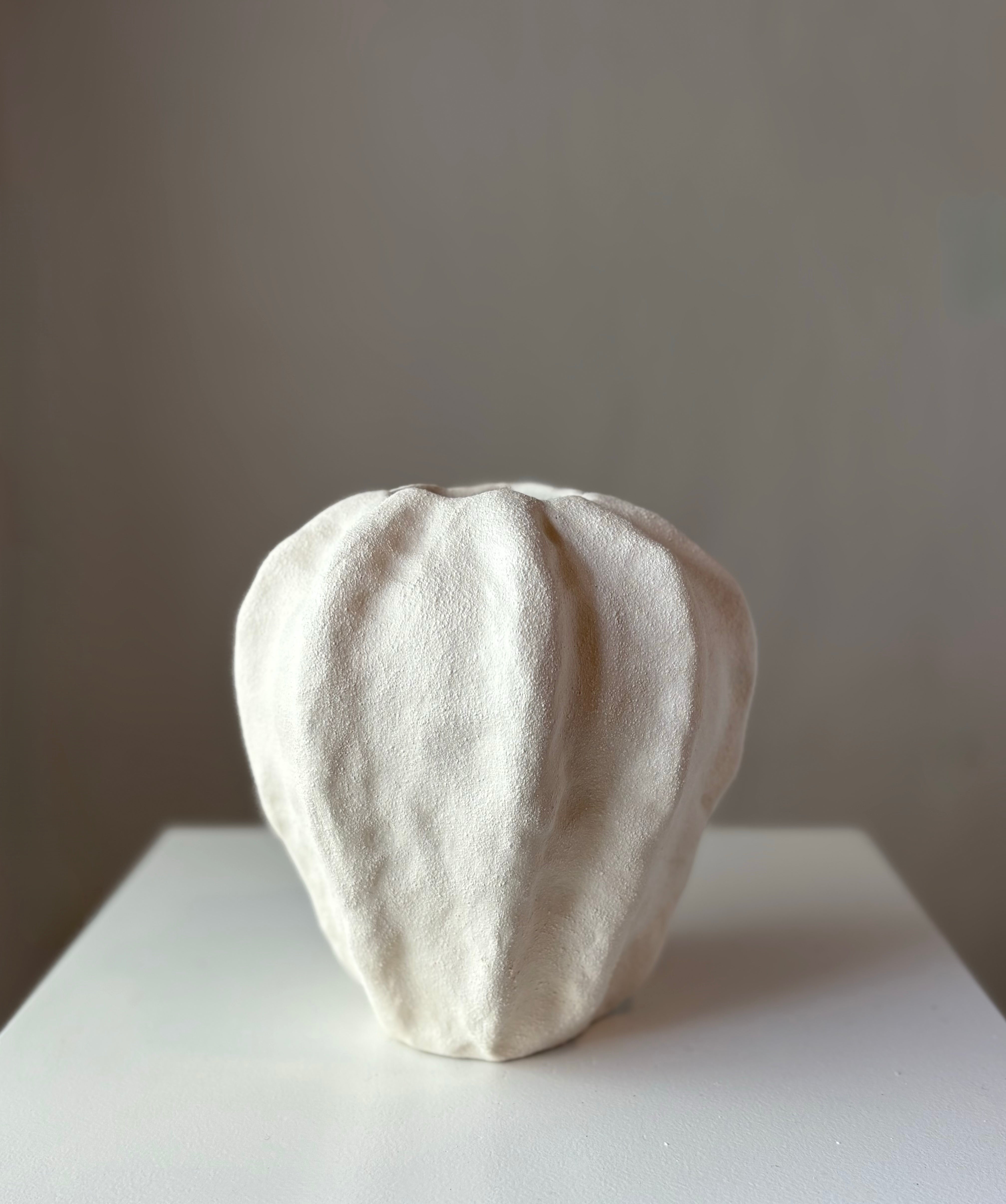 Håndbygget skulpturel unika vase i hvidler, af Leela Mette. Vasen er uglaseret og skaber både liv, dybde og tekstur.