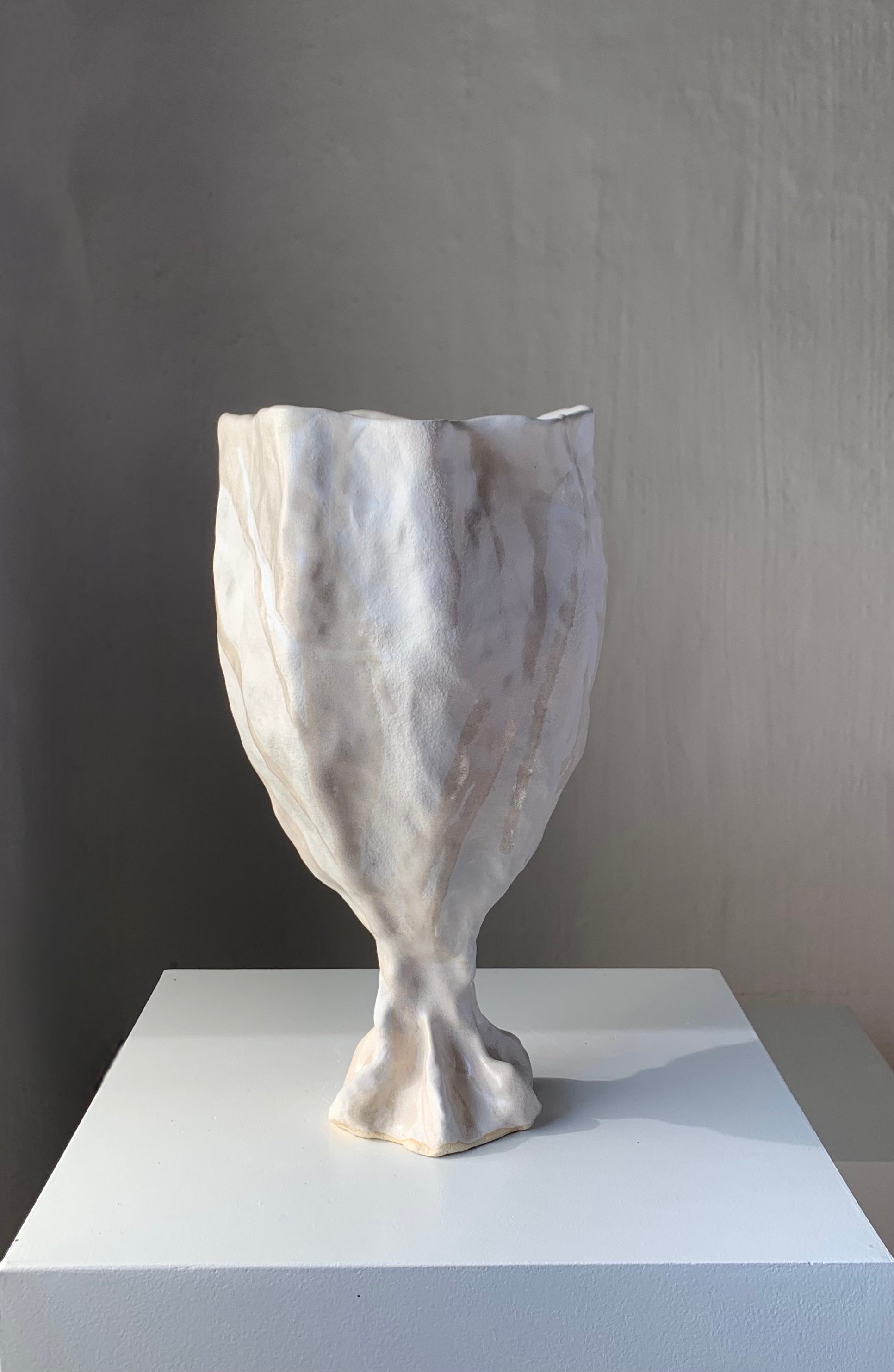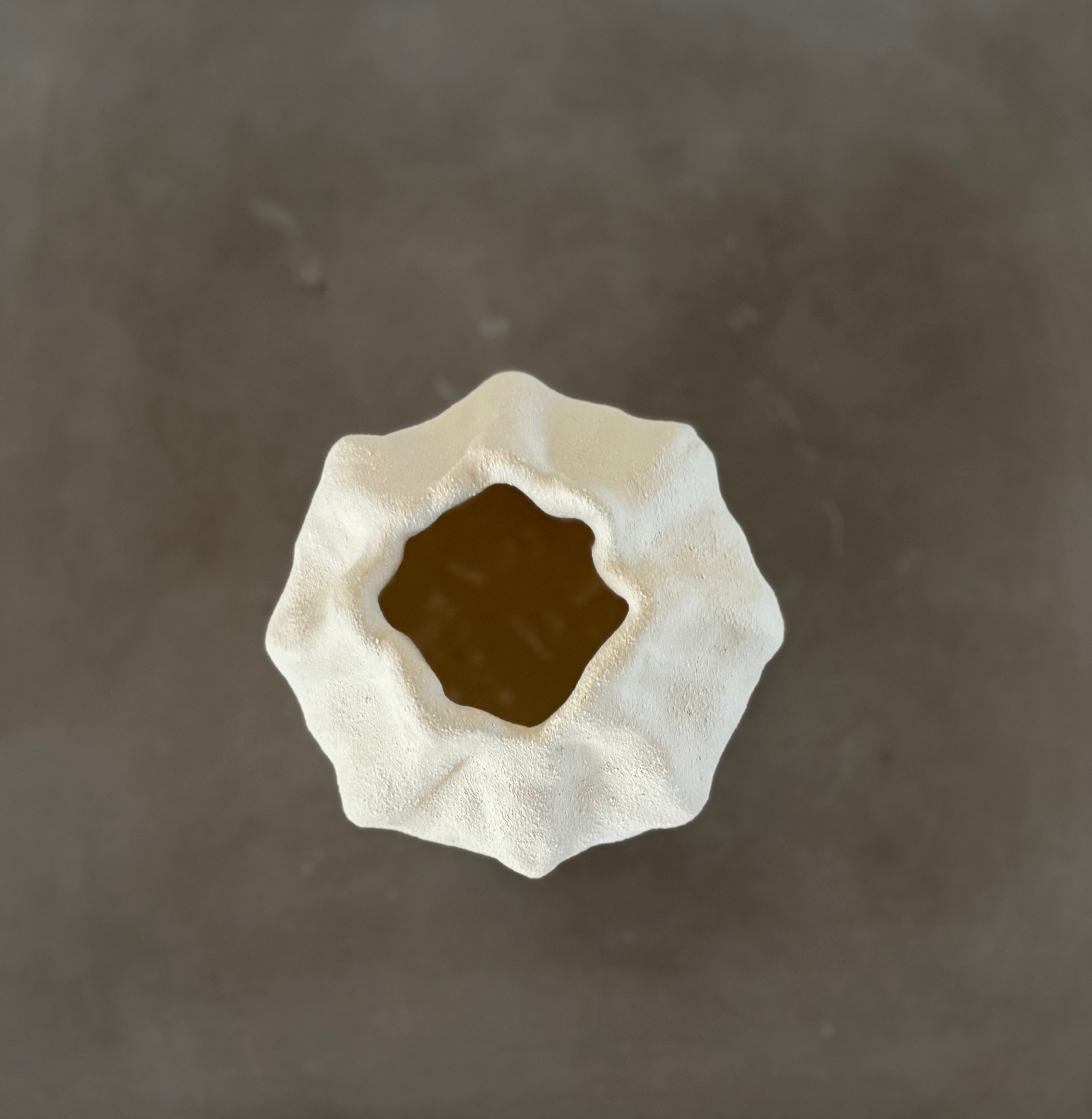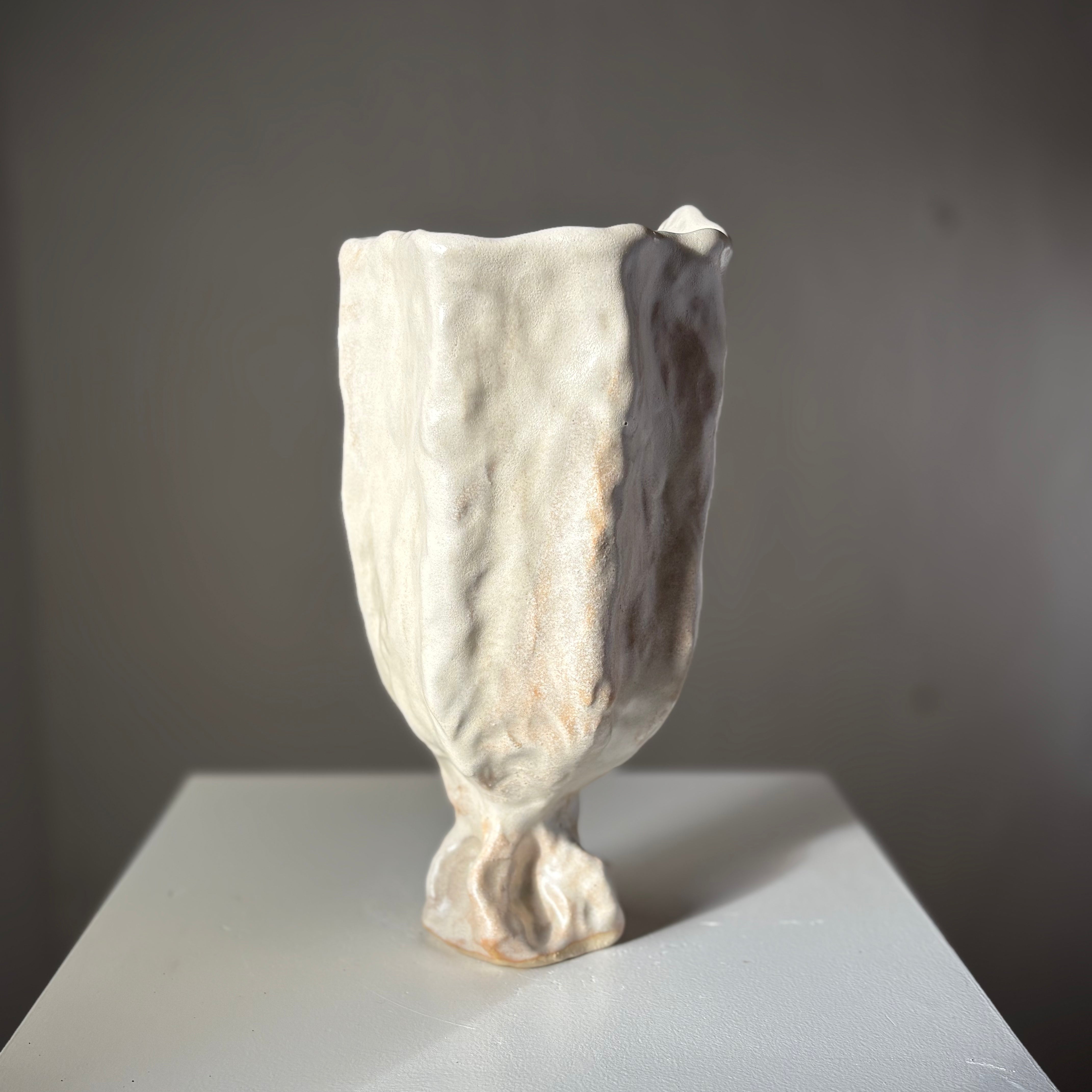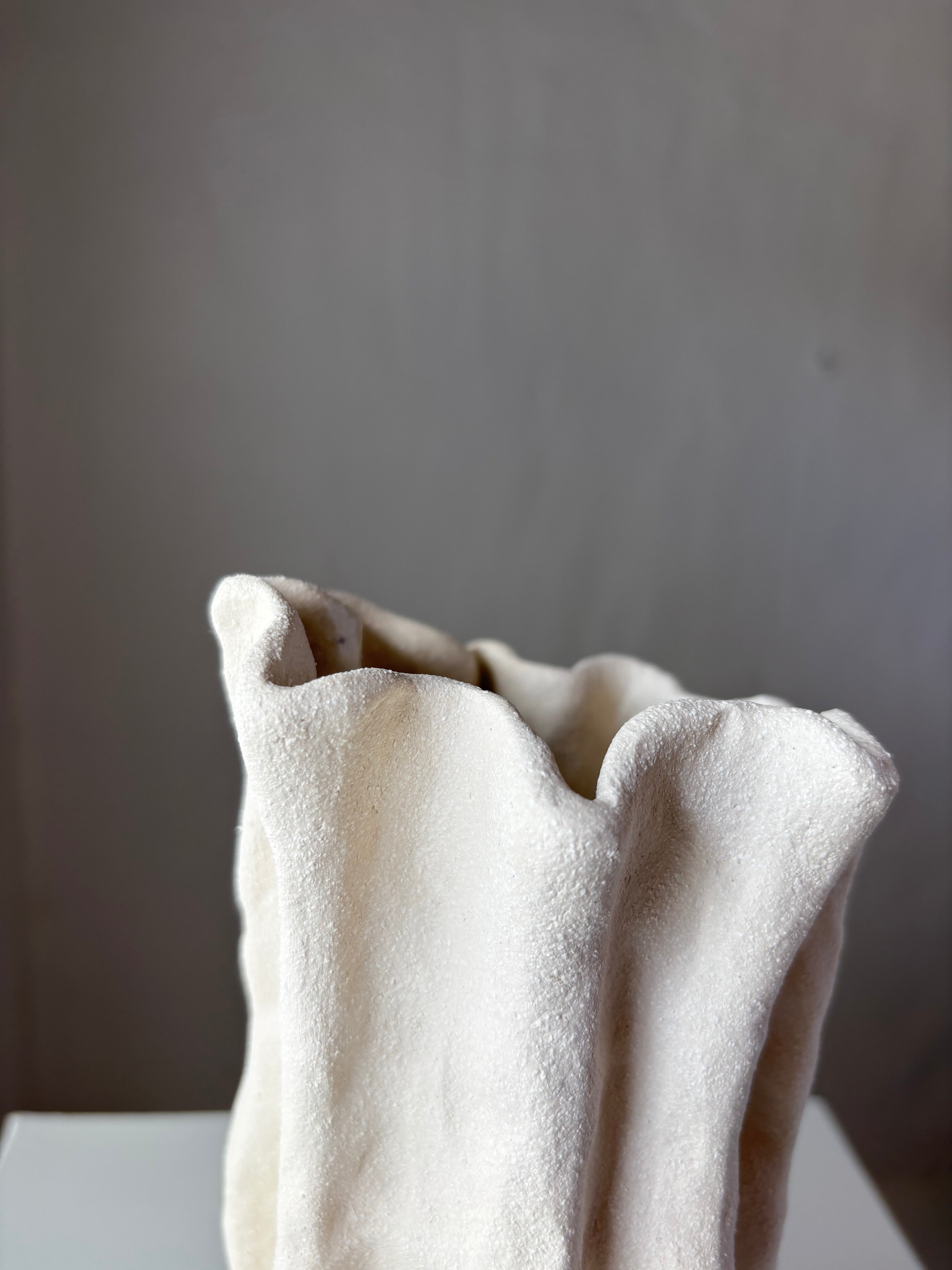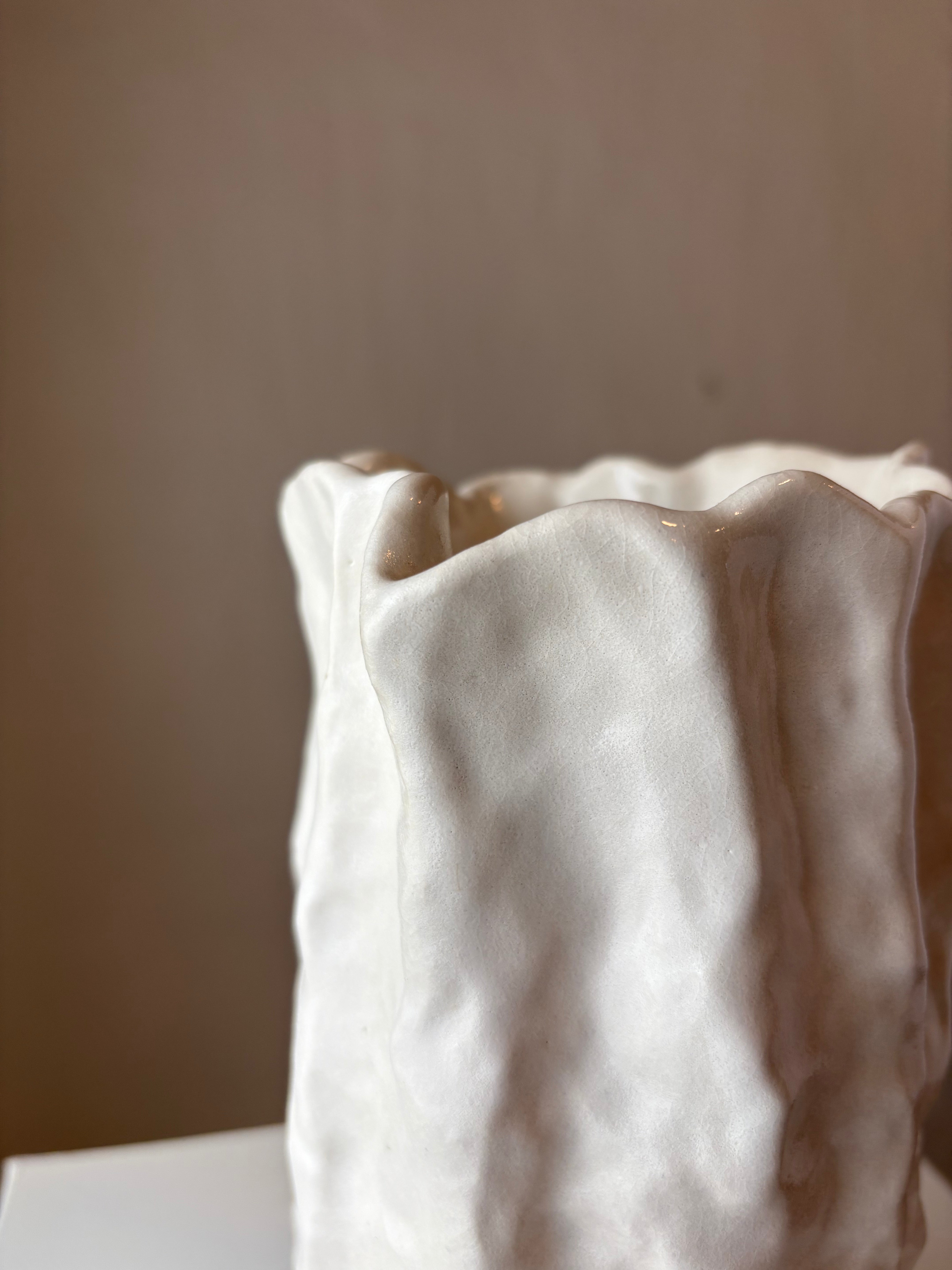 Håndbygget skulpturel unika vase i hvidler, af Leela Mette. Vasen er uglaseret og skaber både liv, dybde og tekstur.