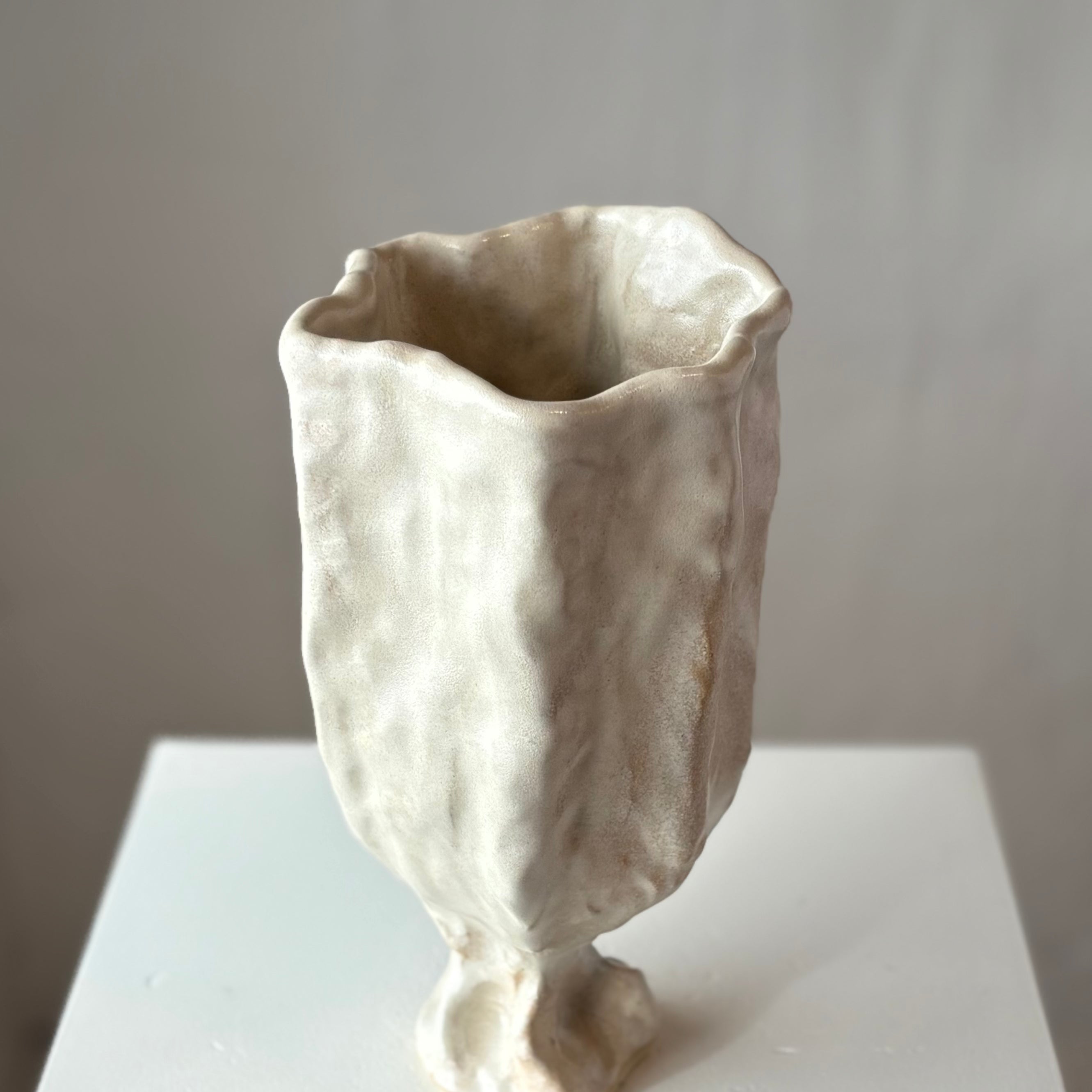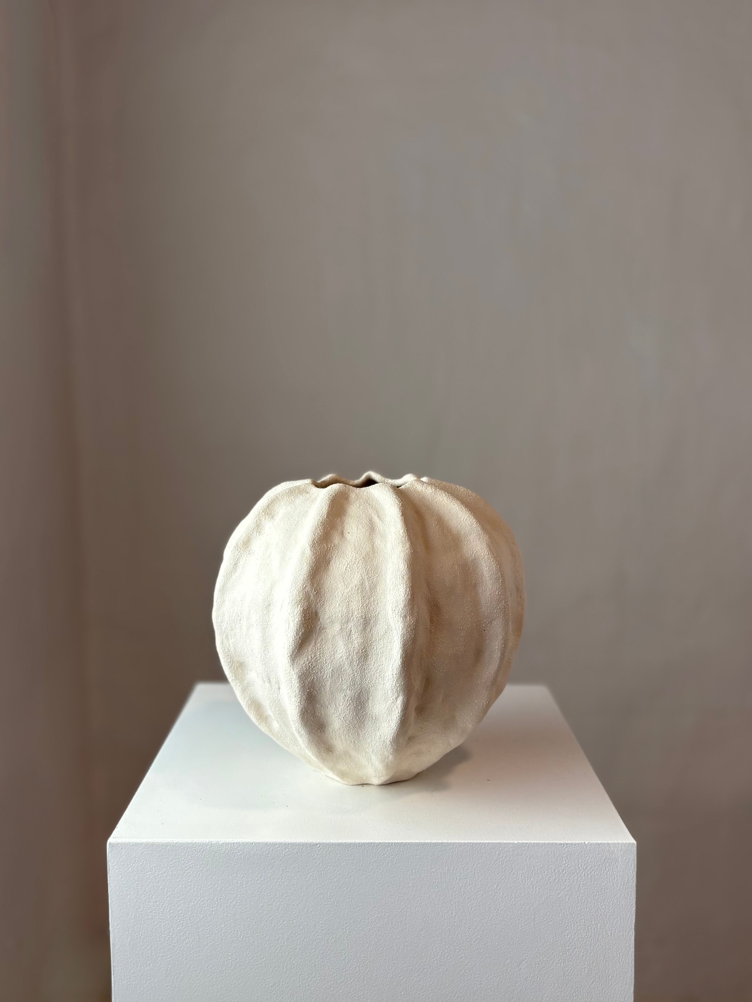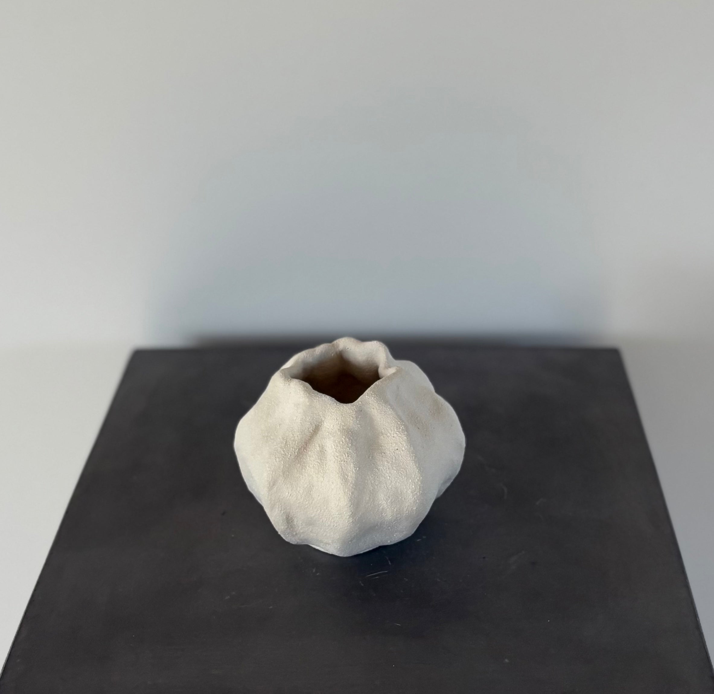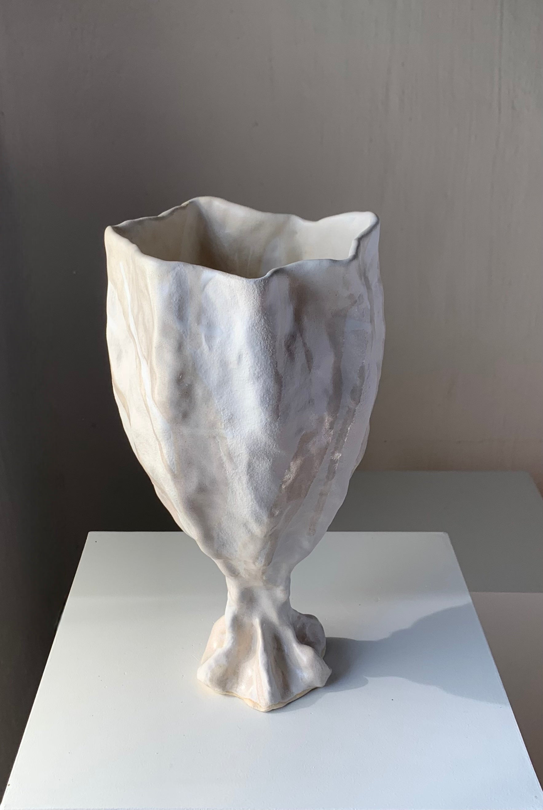 Håndbygget skulpturel unika vase i hvidler, af Leela Mette. Vasen er uglaseret og skaber både liv, dybde og tekstur.