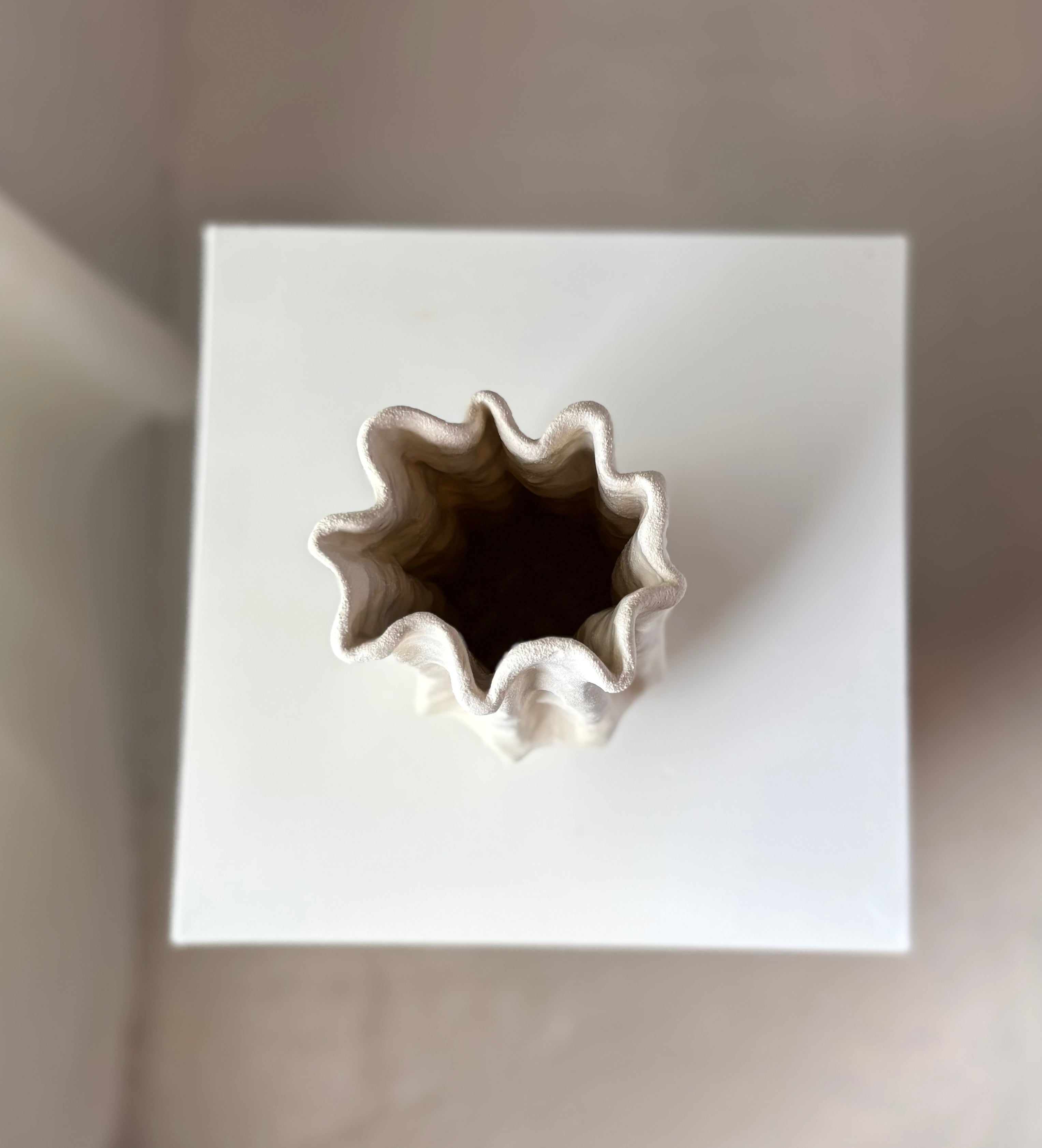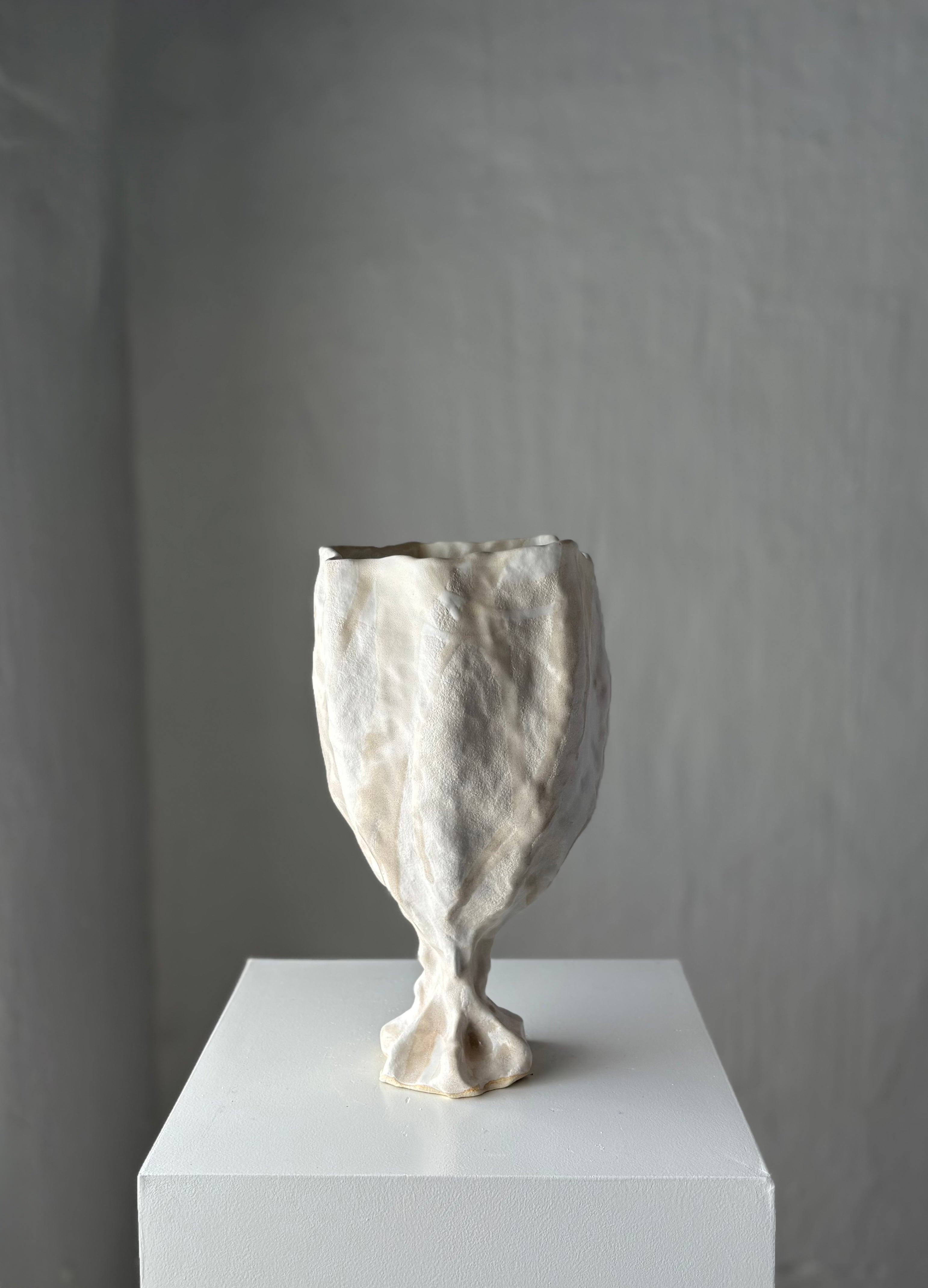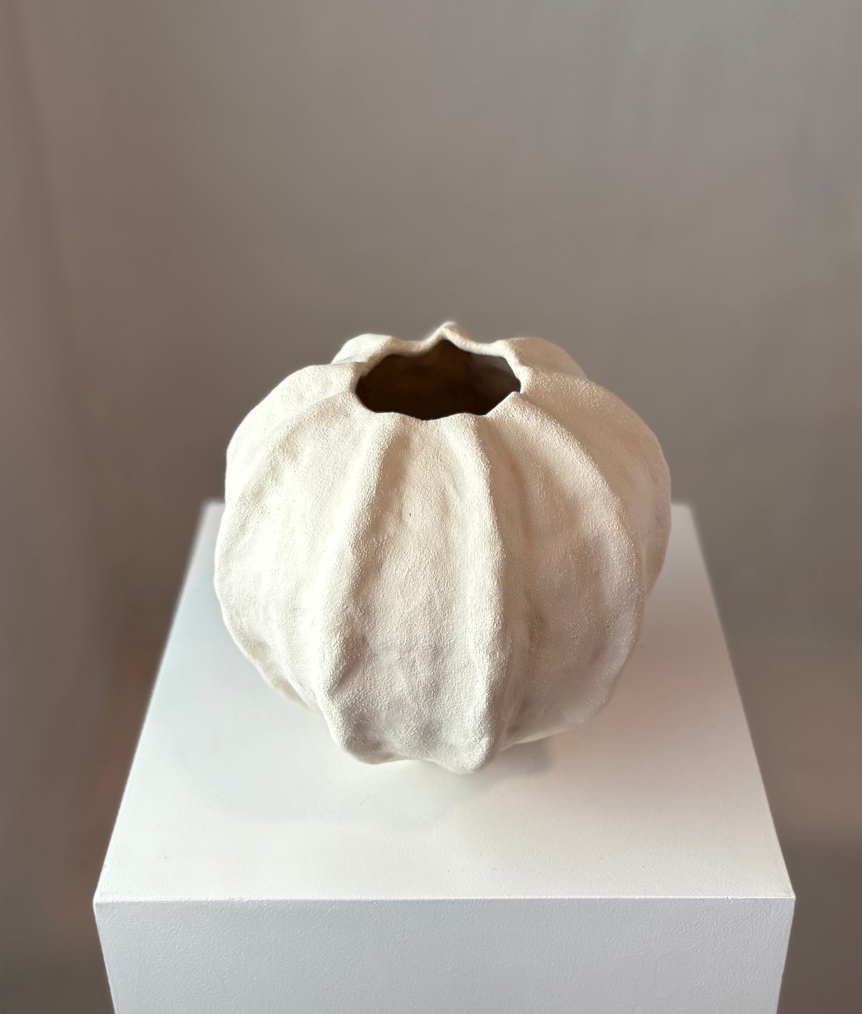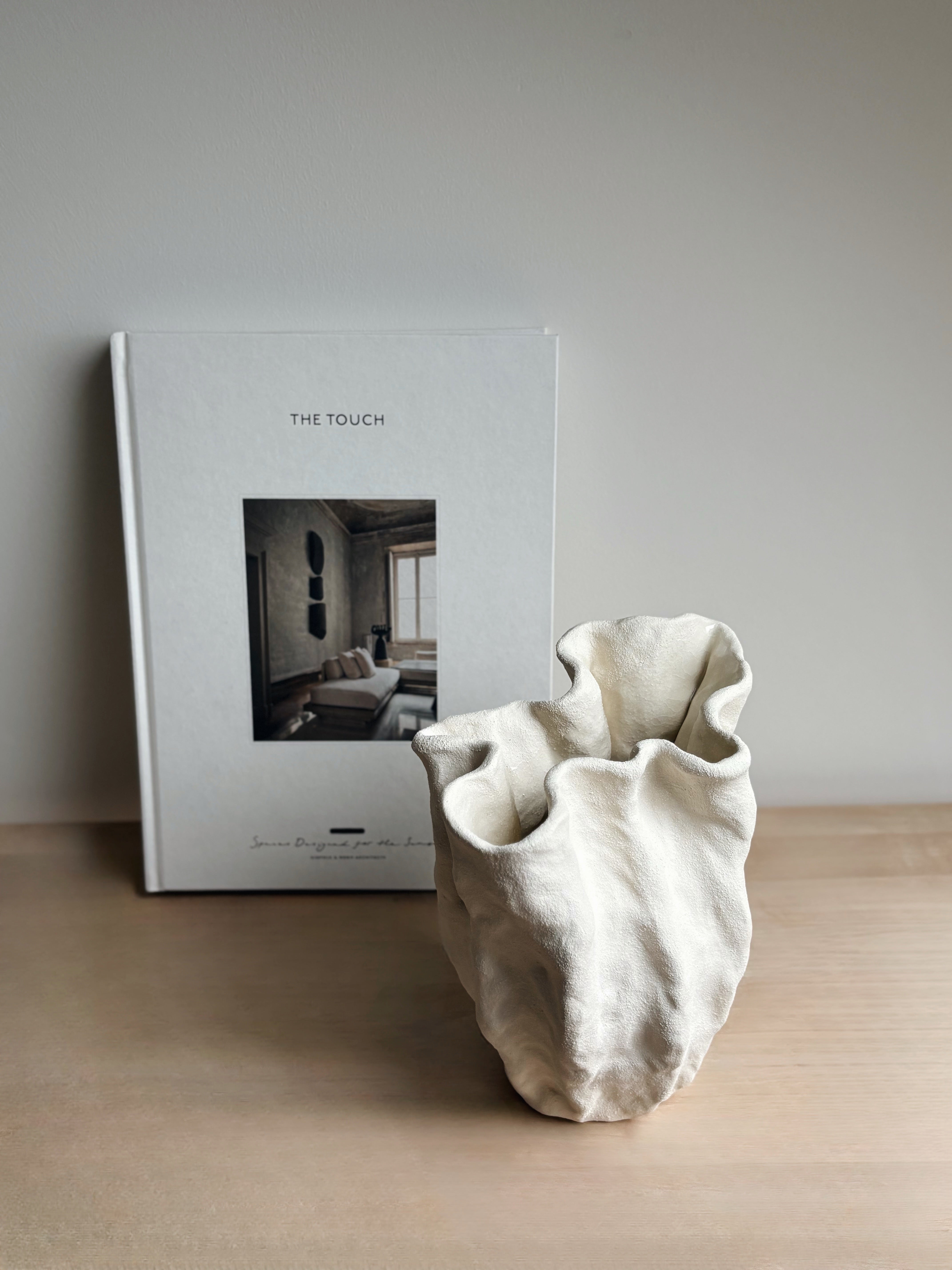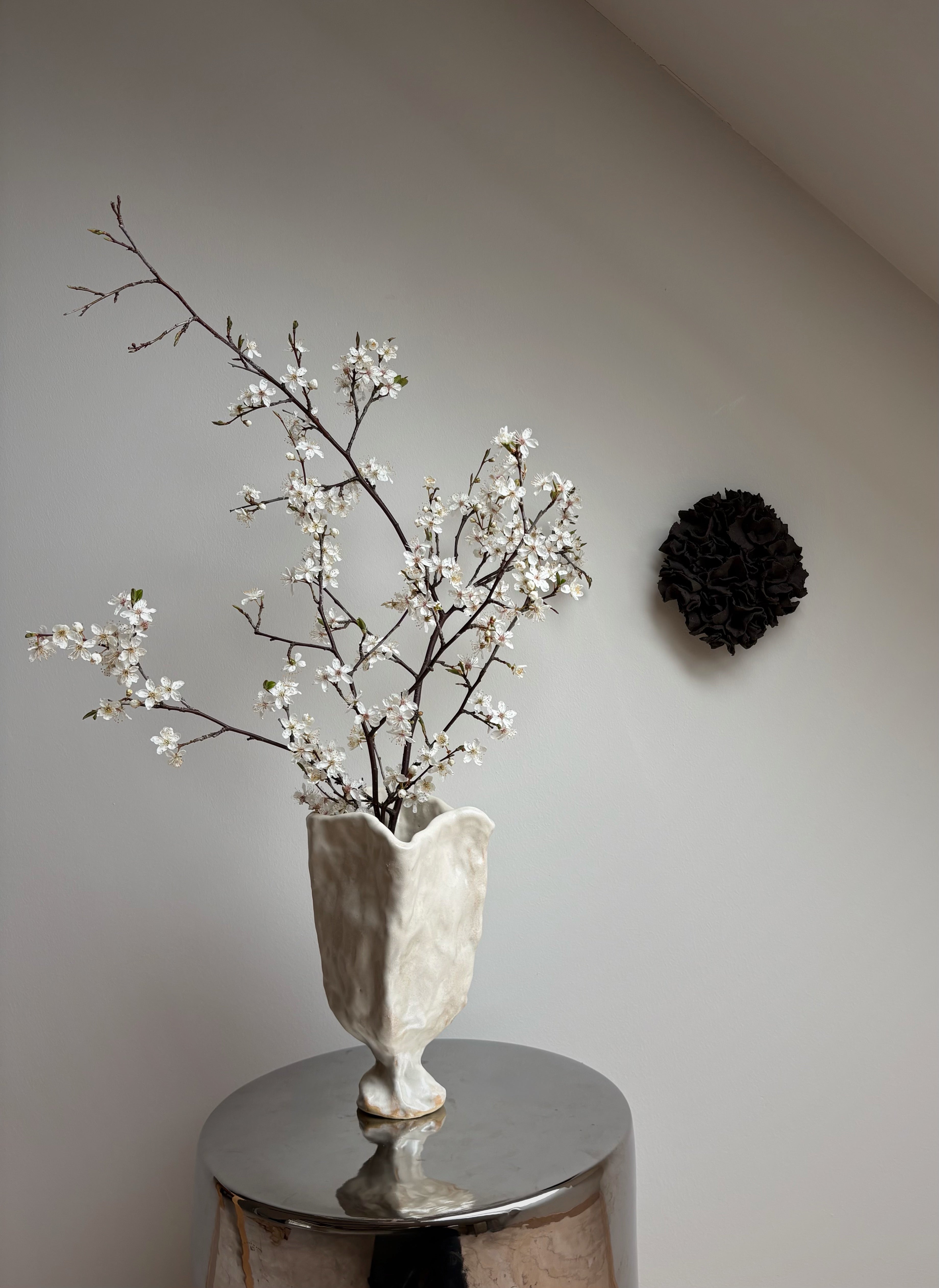 Håndbygget skulpturel unika vase i hvidler, af Leela Mette. Vasen er uglaseret og skaber både liv, dybde og tekstur.