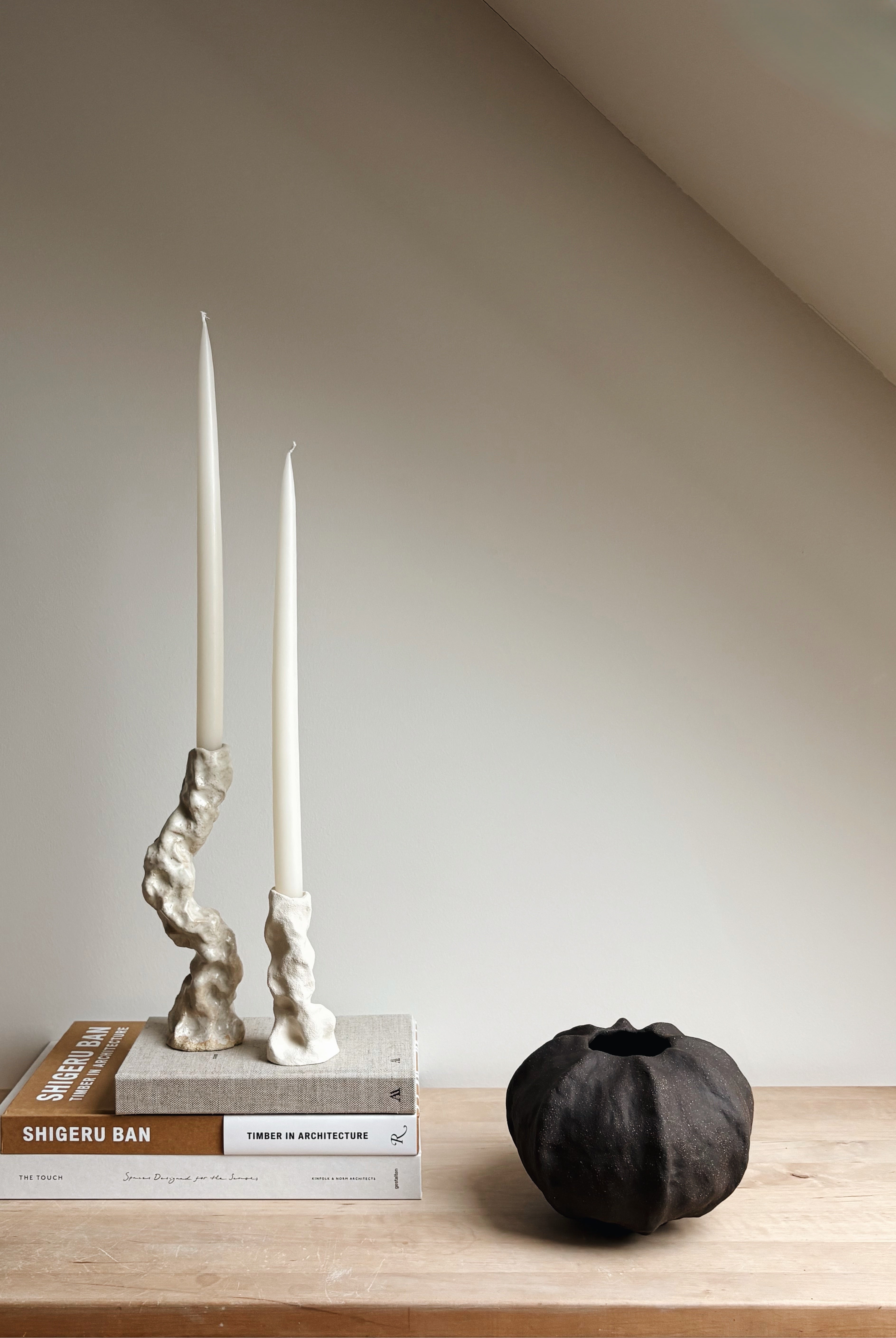 De taktile overflader og de organiske former vækker sanserne og tilfører rummet en særlig stemning og nærvær. Min uglaserede serie hvor leret for lov at stå frem helt naturligt, giver både dybde, nærvær til det rå materiale og gør det utrolig levende.