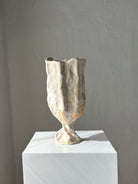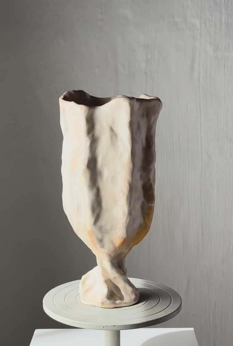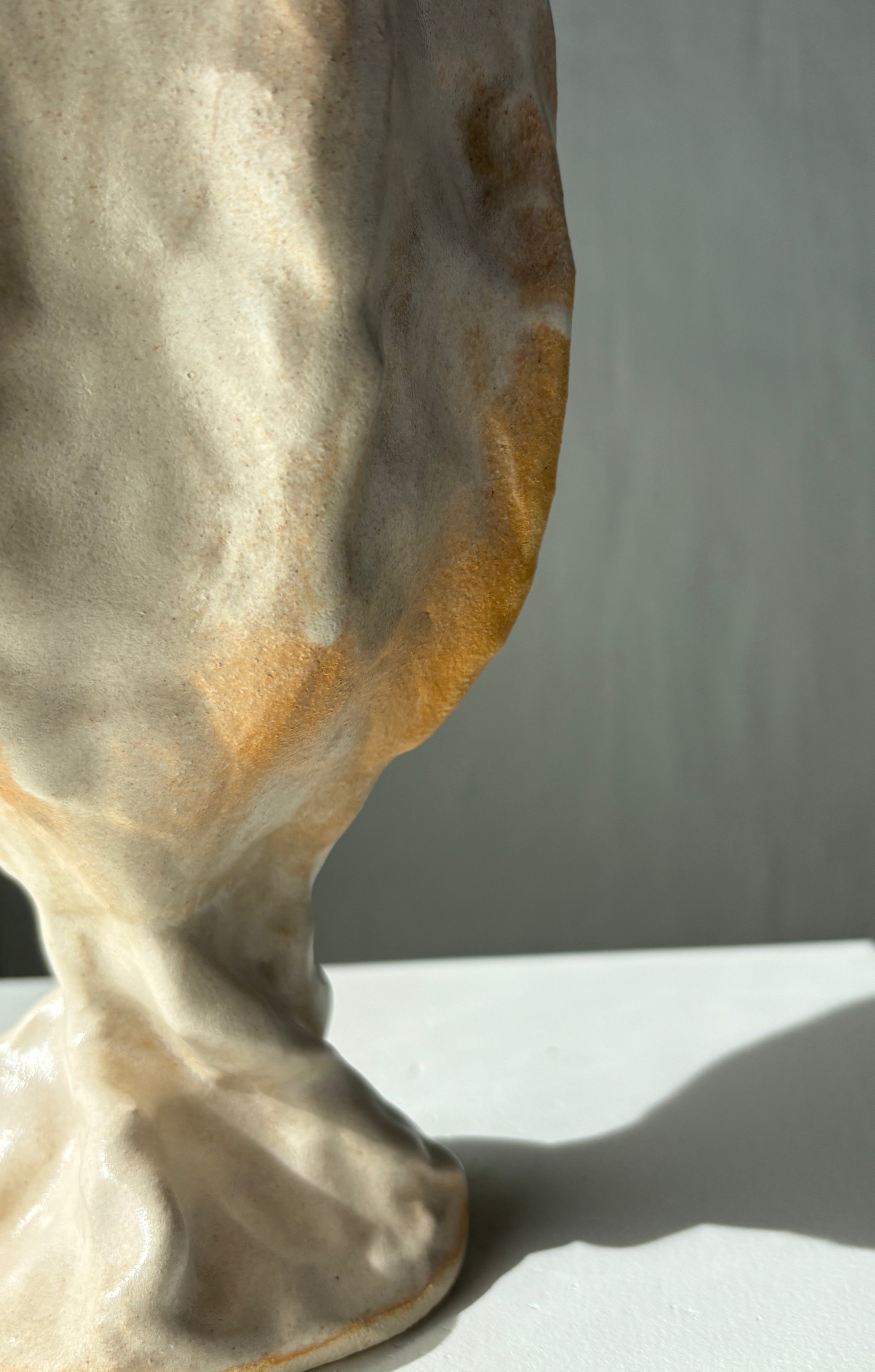 Håndbygget skulpturel unika vase, af Leela Mette. Vasen er glaseret i et tyndt lag beige for et smukt samspil med leret i overfladen.