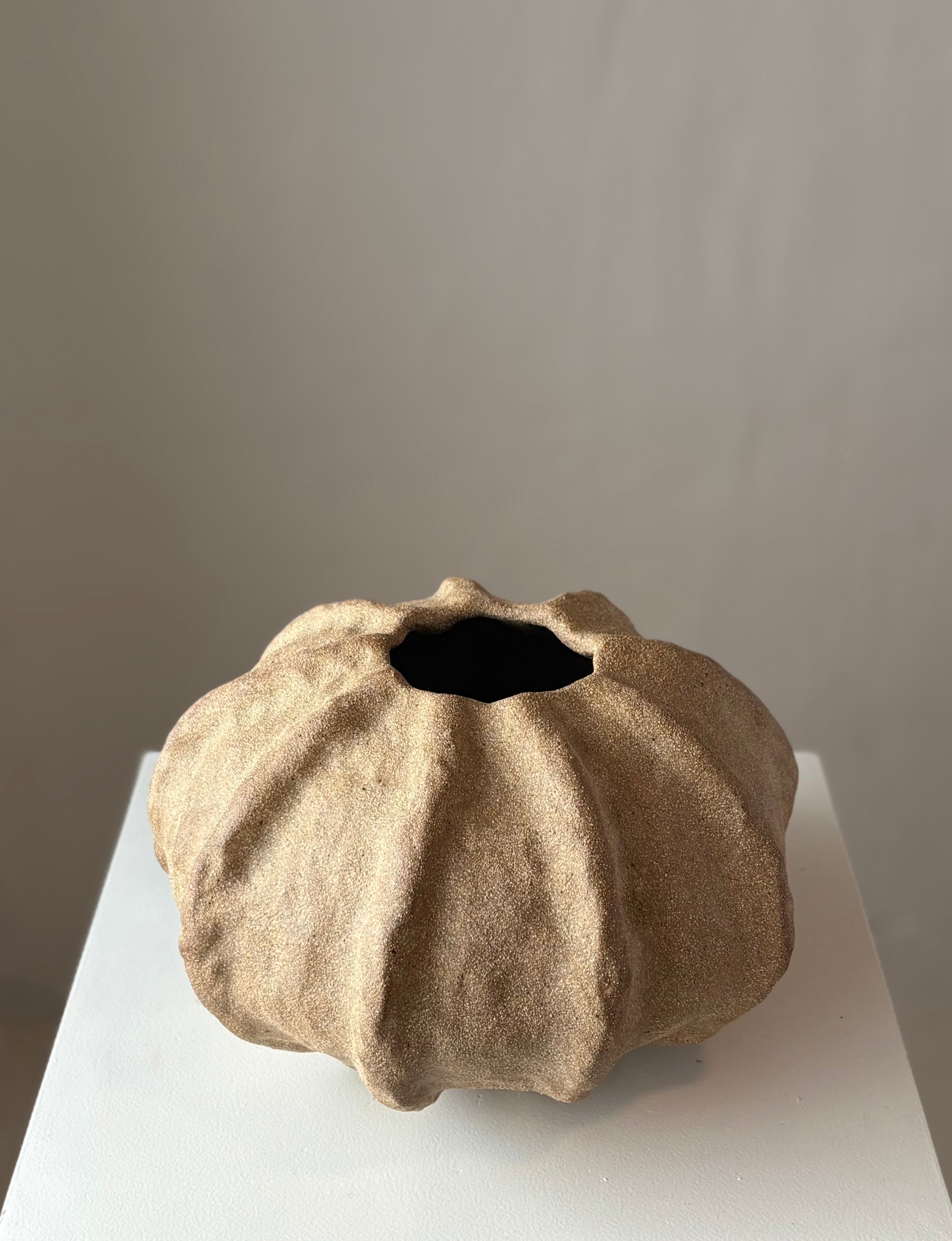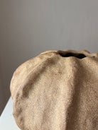 Håndbygget skulpturel unika vase i rå naturbrun ler, af Leela Mette. Vasen er uglaseret så den smukke naturlige rødbrune ler giver dybde og varme i rummet. Samtidig skaber den smukke rå ler både tekstur og liv.