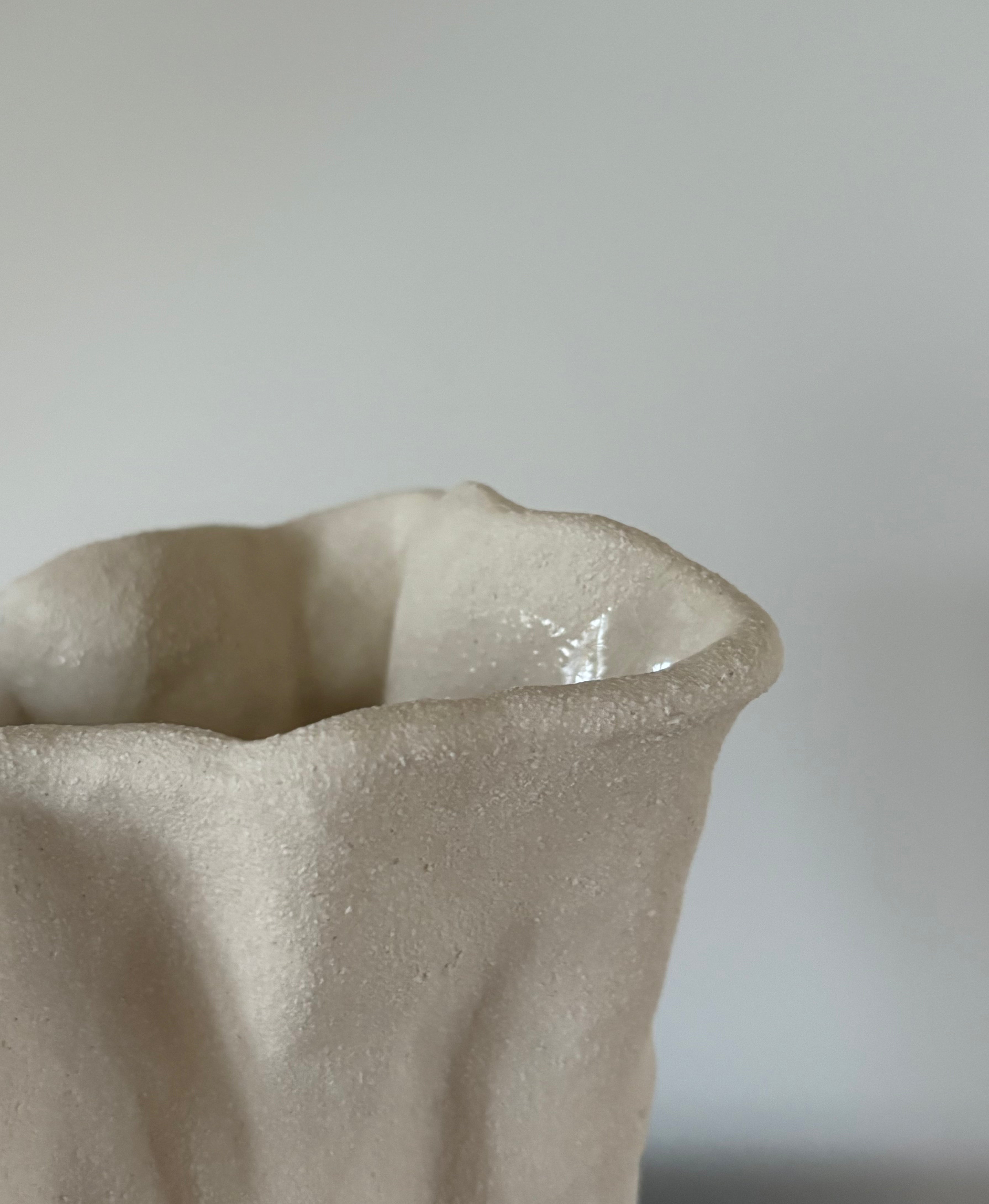 Min tilgang til leret er intuitivt og meditativt. Hver enkelt vase afslører mine hændes aftryk - det vækker dine sanser og bringer nærhed i rummet.