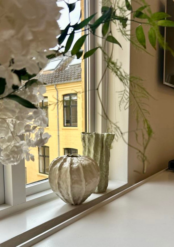 Min tilgang til leret er intuitivt og meditativt. Hver enkelt vase afslører mine hændes aftryk - det vækker dine sanser og bringer nærhed i rummet.