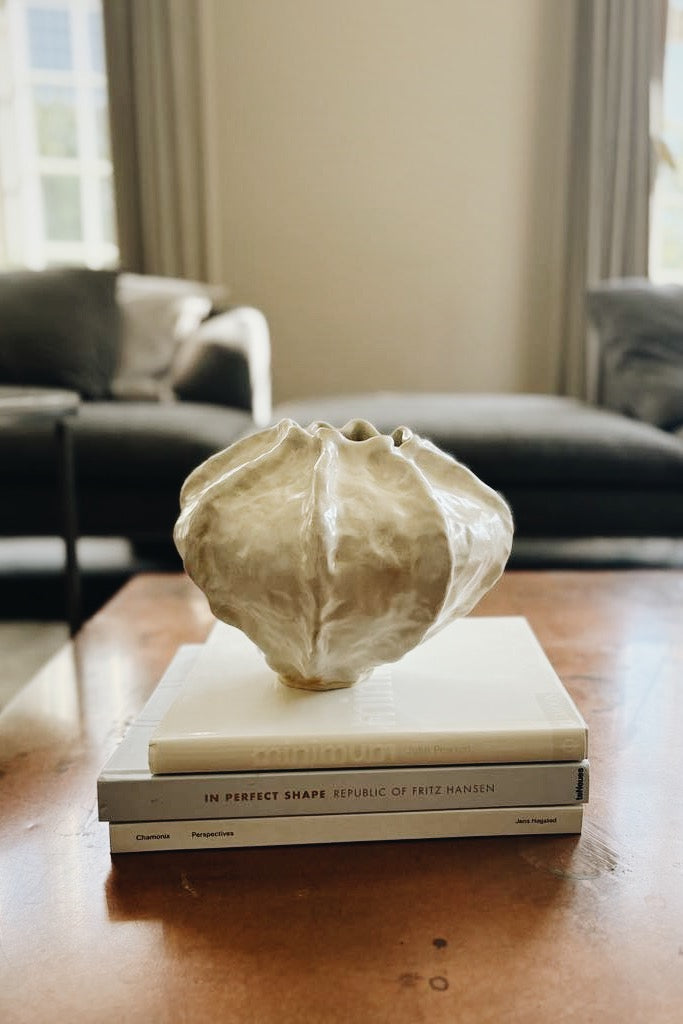Håndbygget skulpturel unika vase med en beige glasur, af Leela Mette.