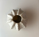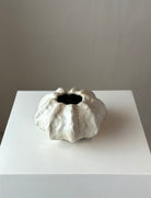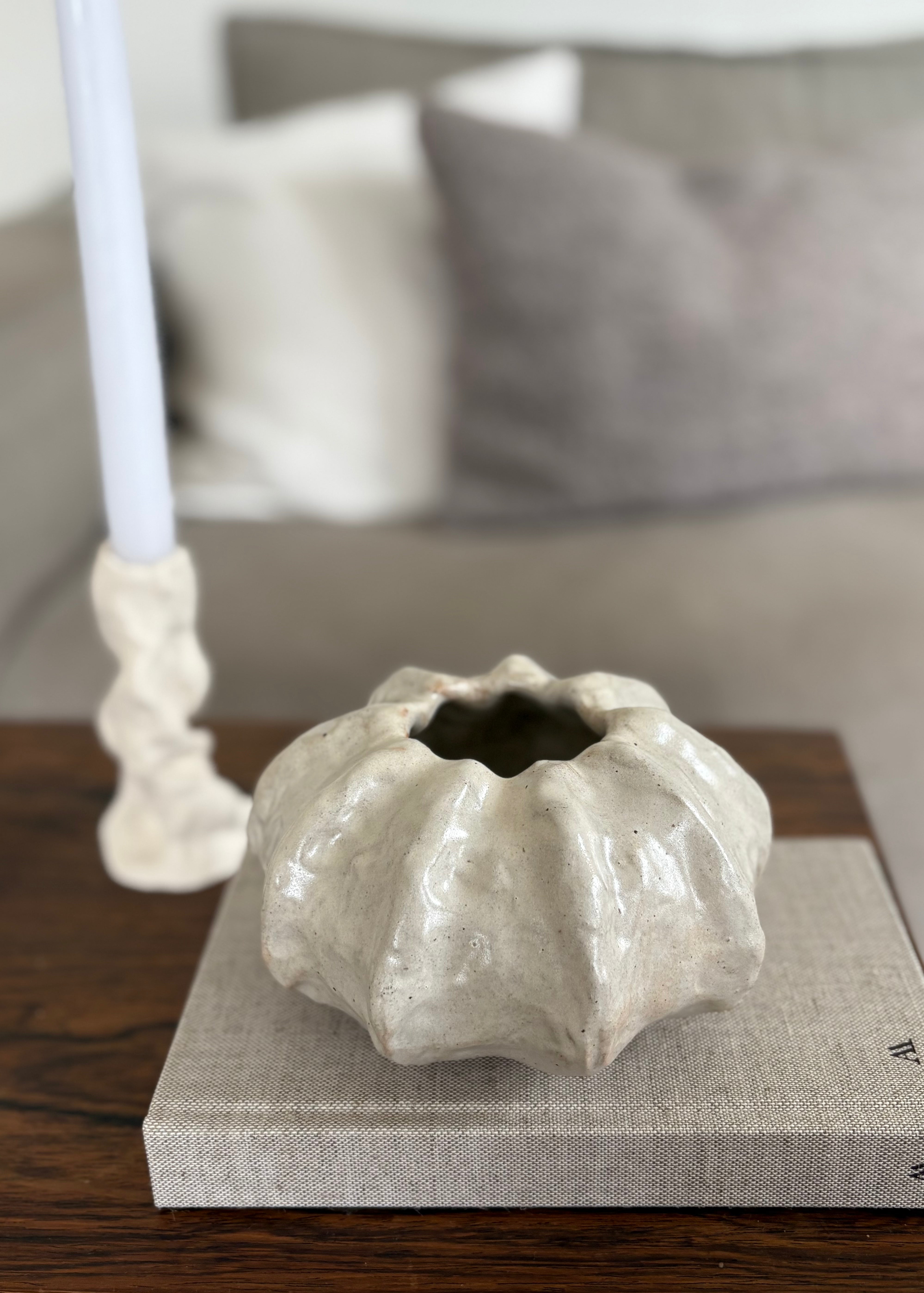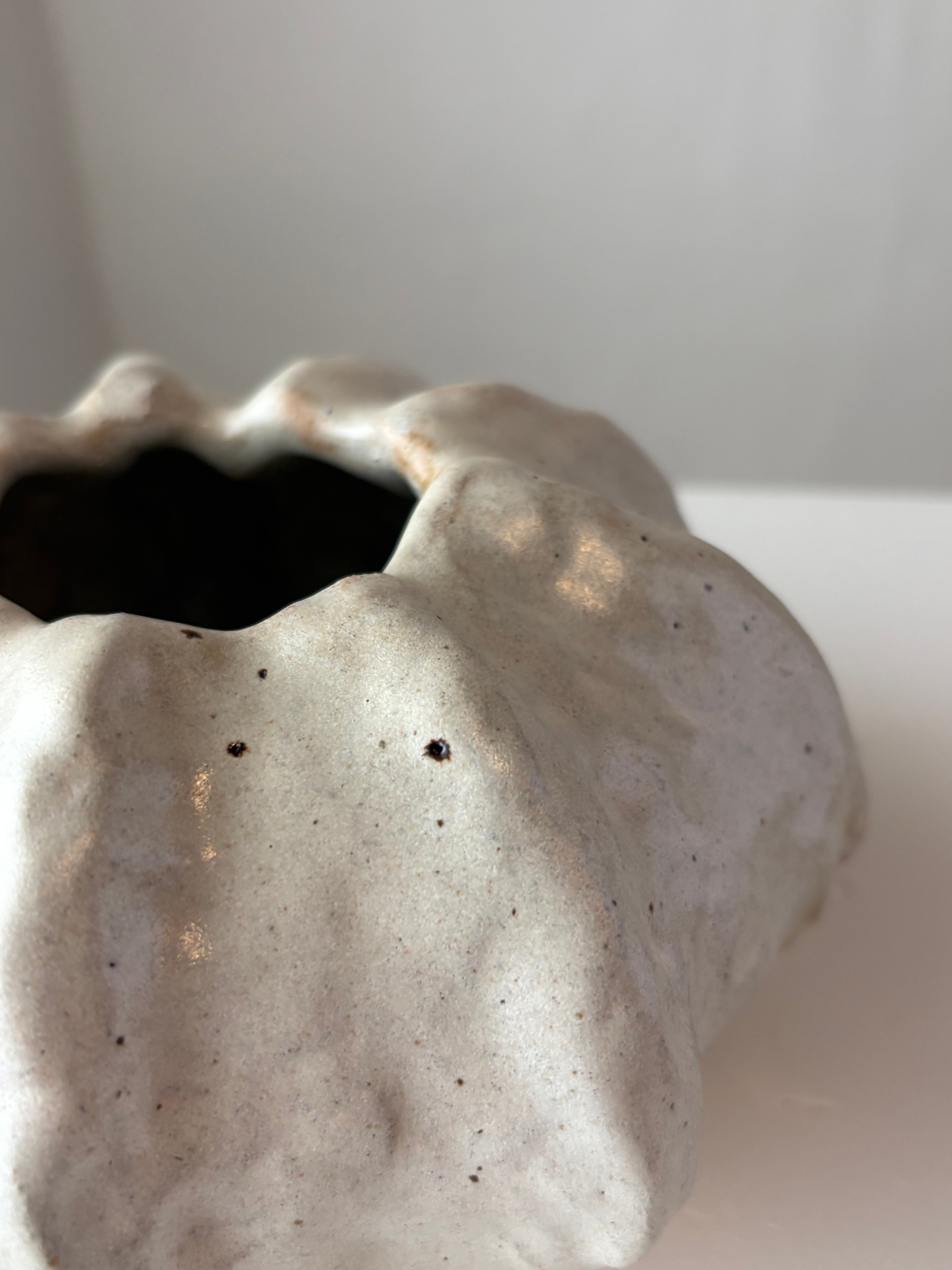 Håndbygget skulpturel unika vase i 100% genanvendt ler, af Leela Mette. Vasen er glaseret i et tyndt lag beige silkemat glausur, så du kan se leret og dets liv.