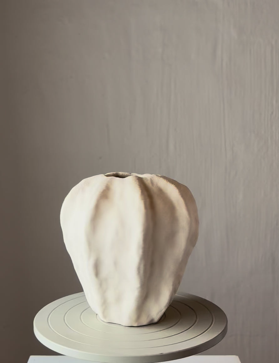 Håndbygget skulpturel unika vase i hvidler, af Leela Mette. Vasen er uglaseret hvilket skaber både liv, dybde og tekstur.