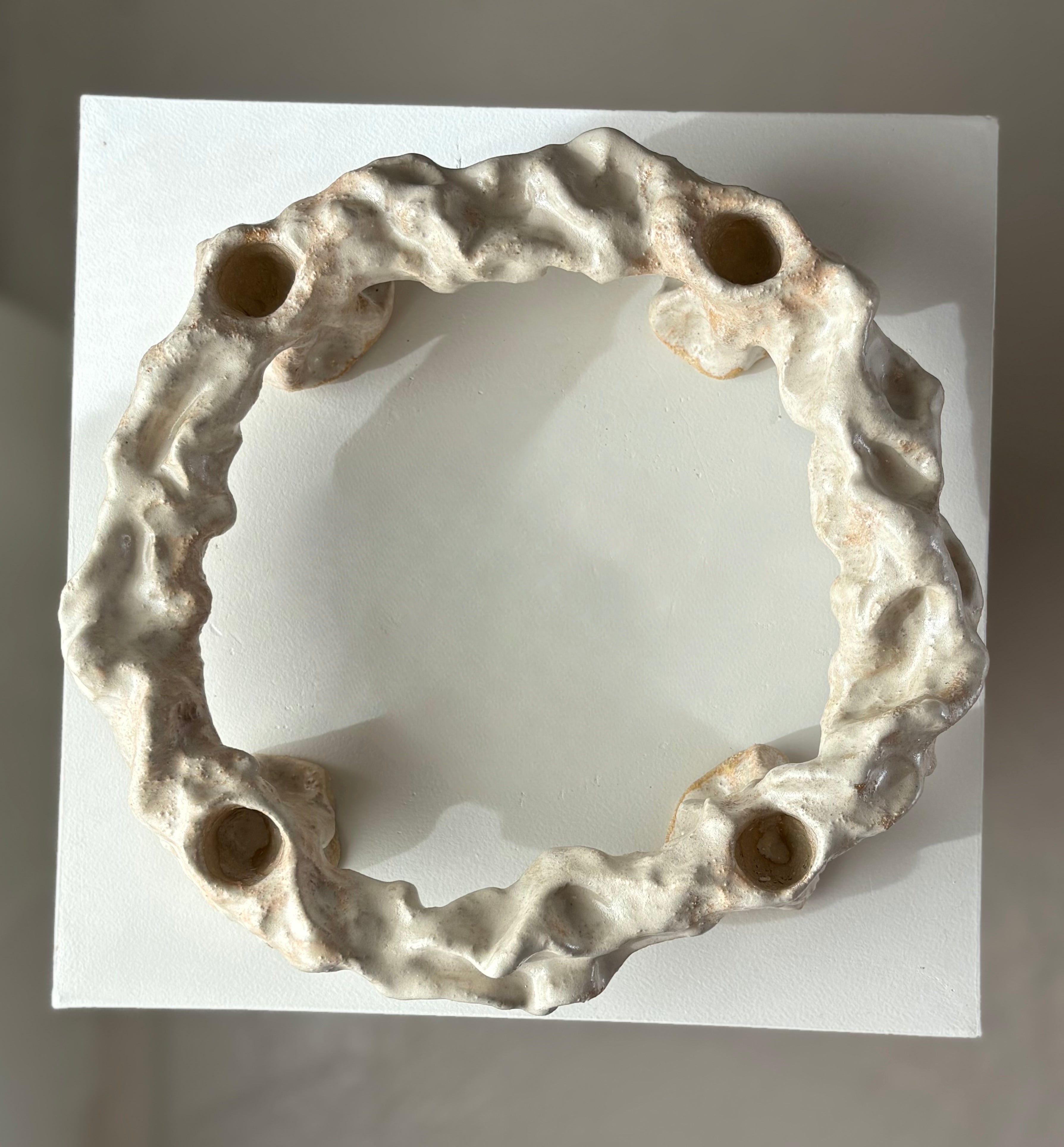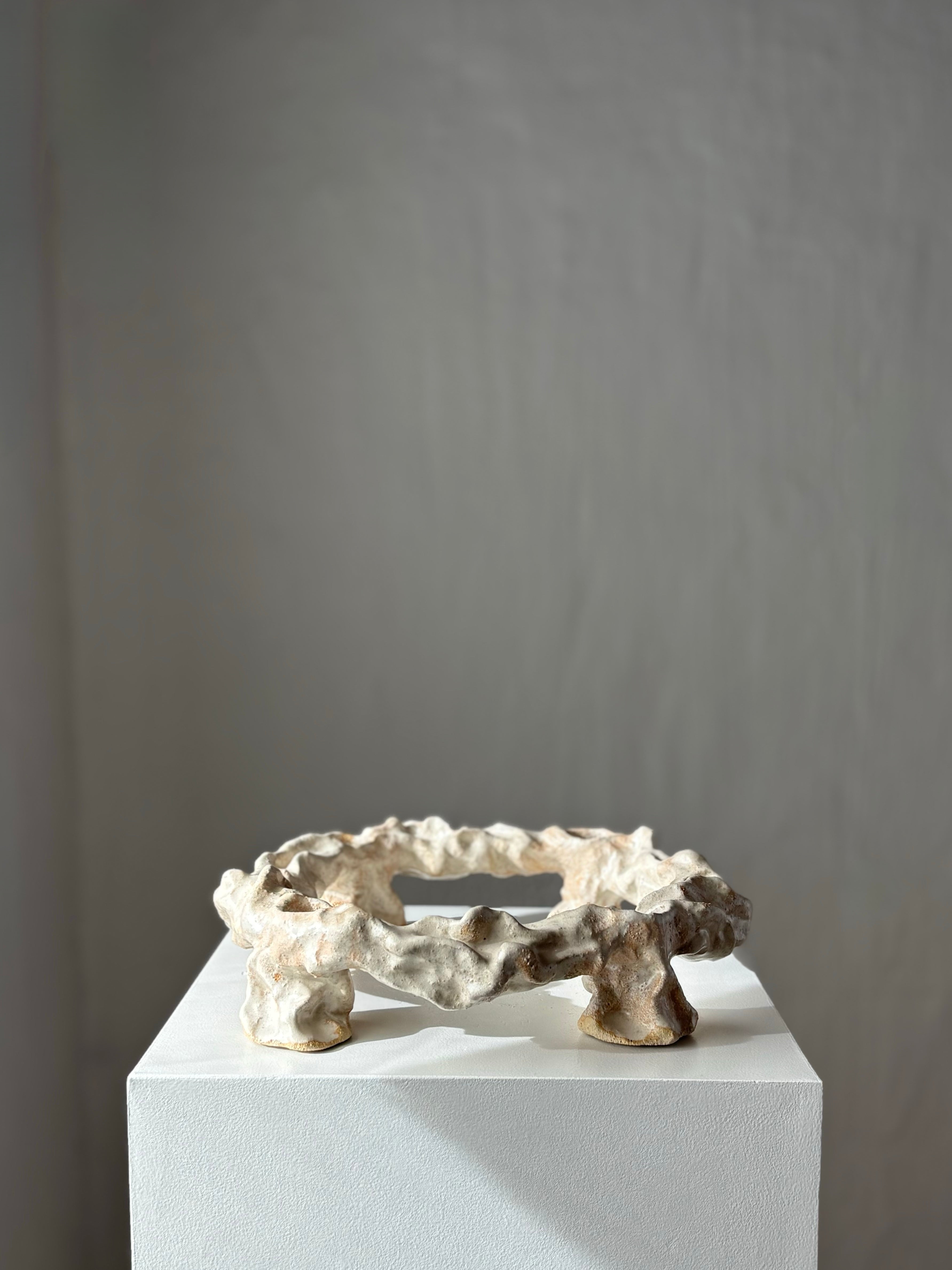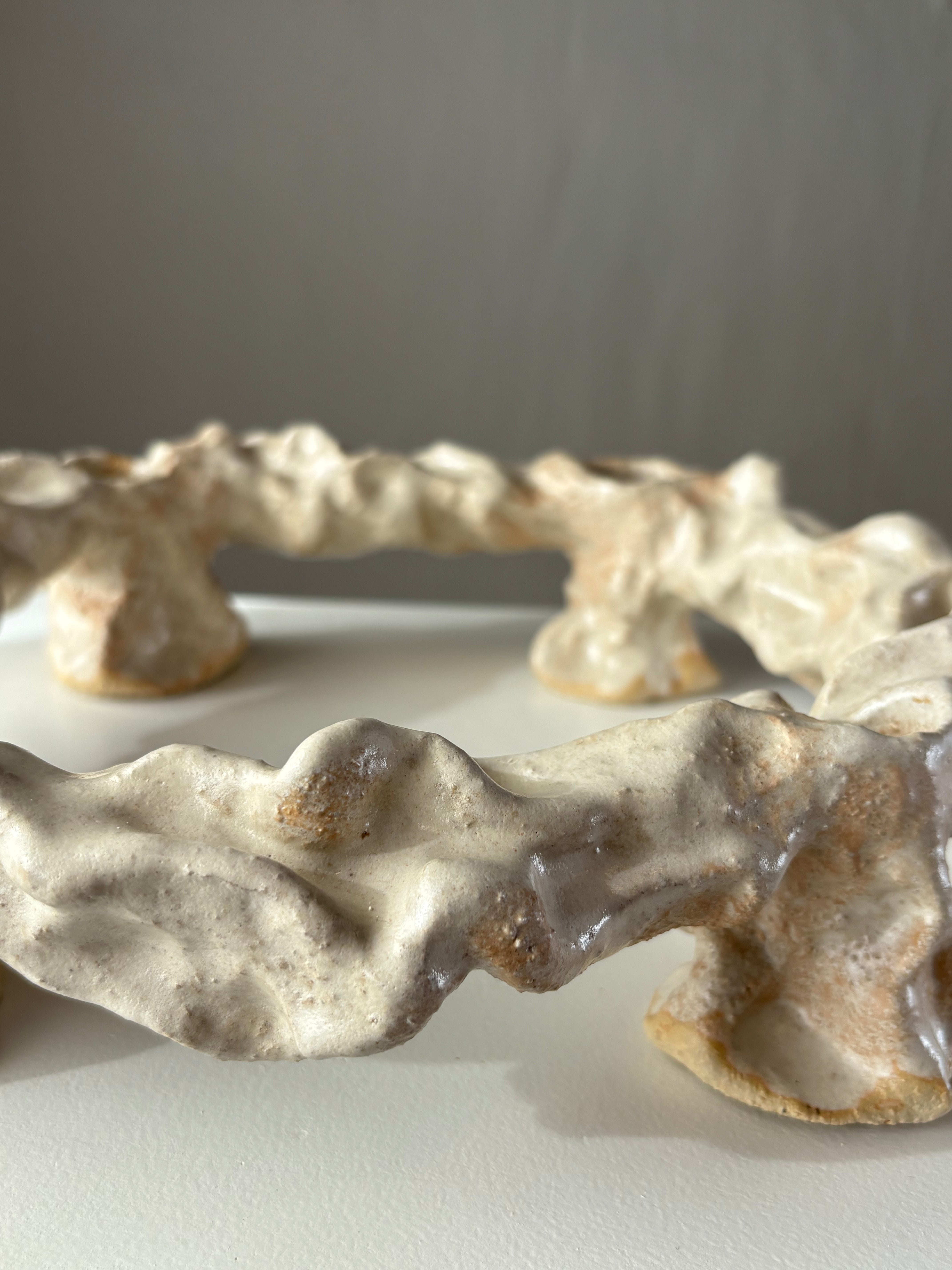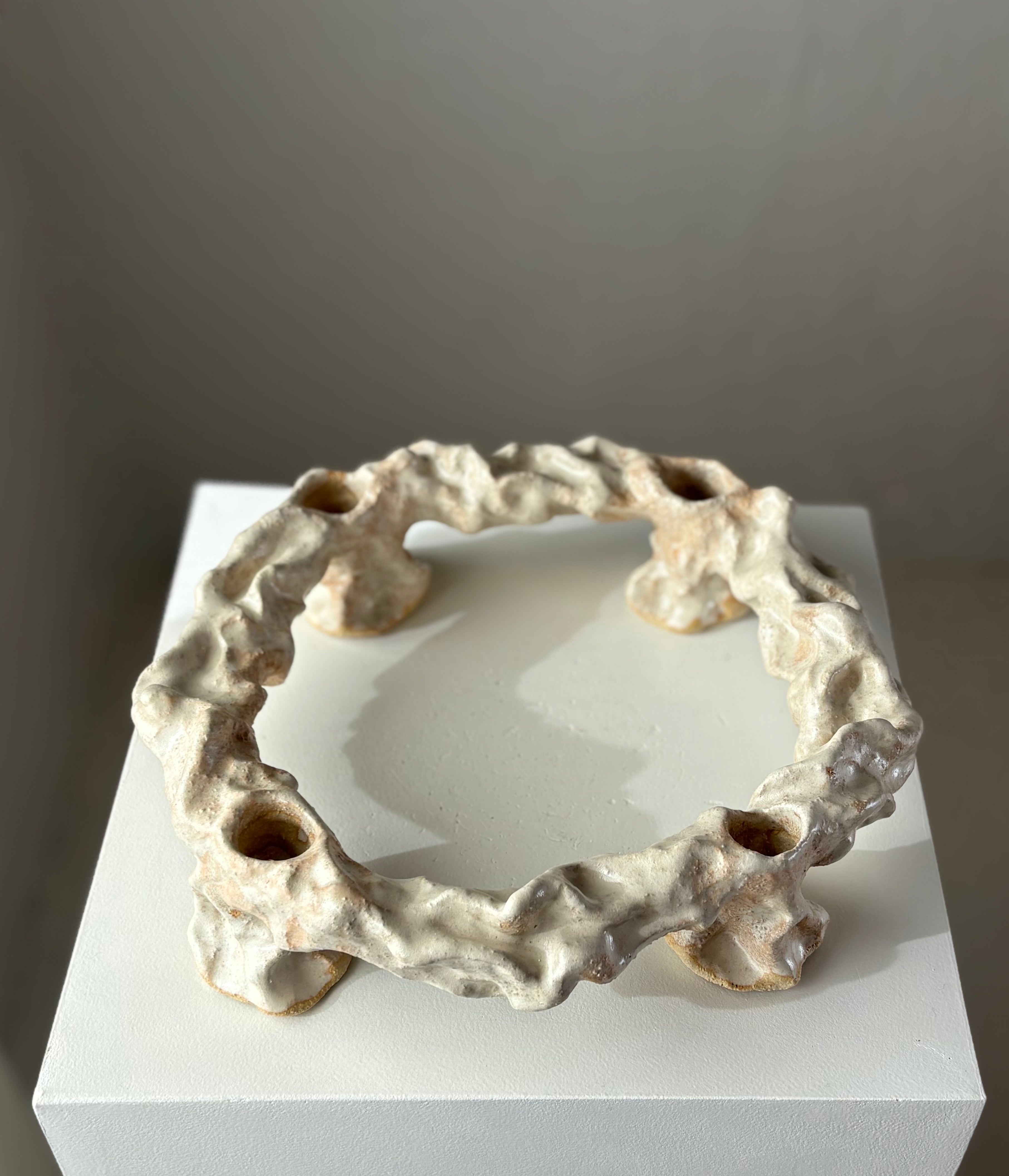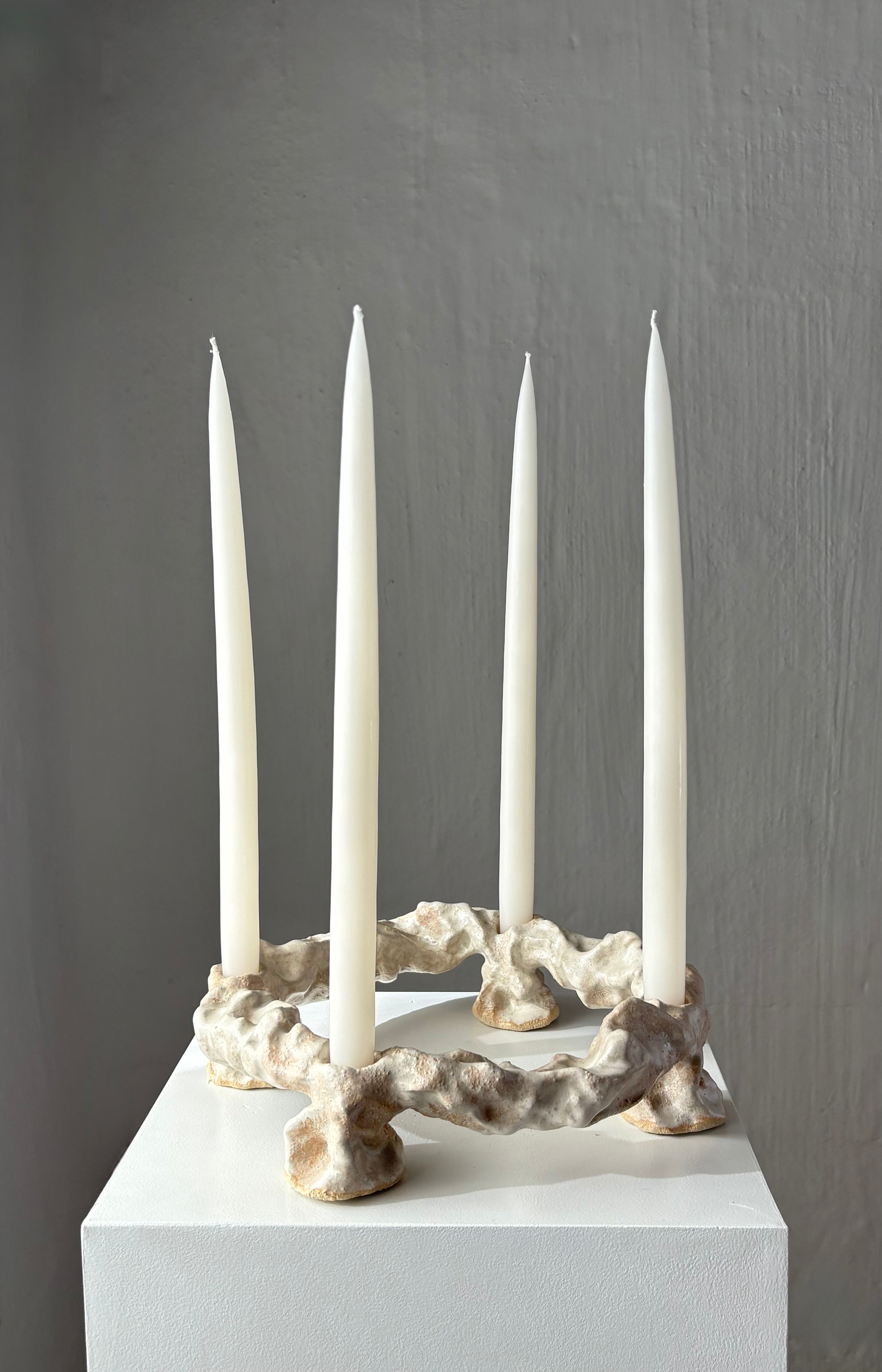 Håndbygget skulpturel unika lysestage, af Leela Mette. Stagen er glaseret i et tyndt lag beige for et smukt samspil med det grove ler.