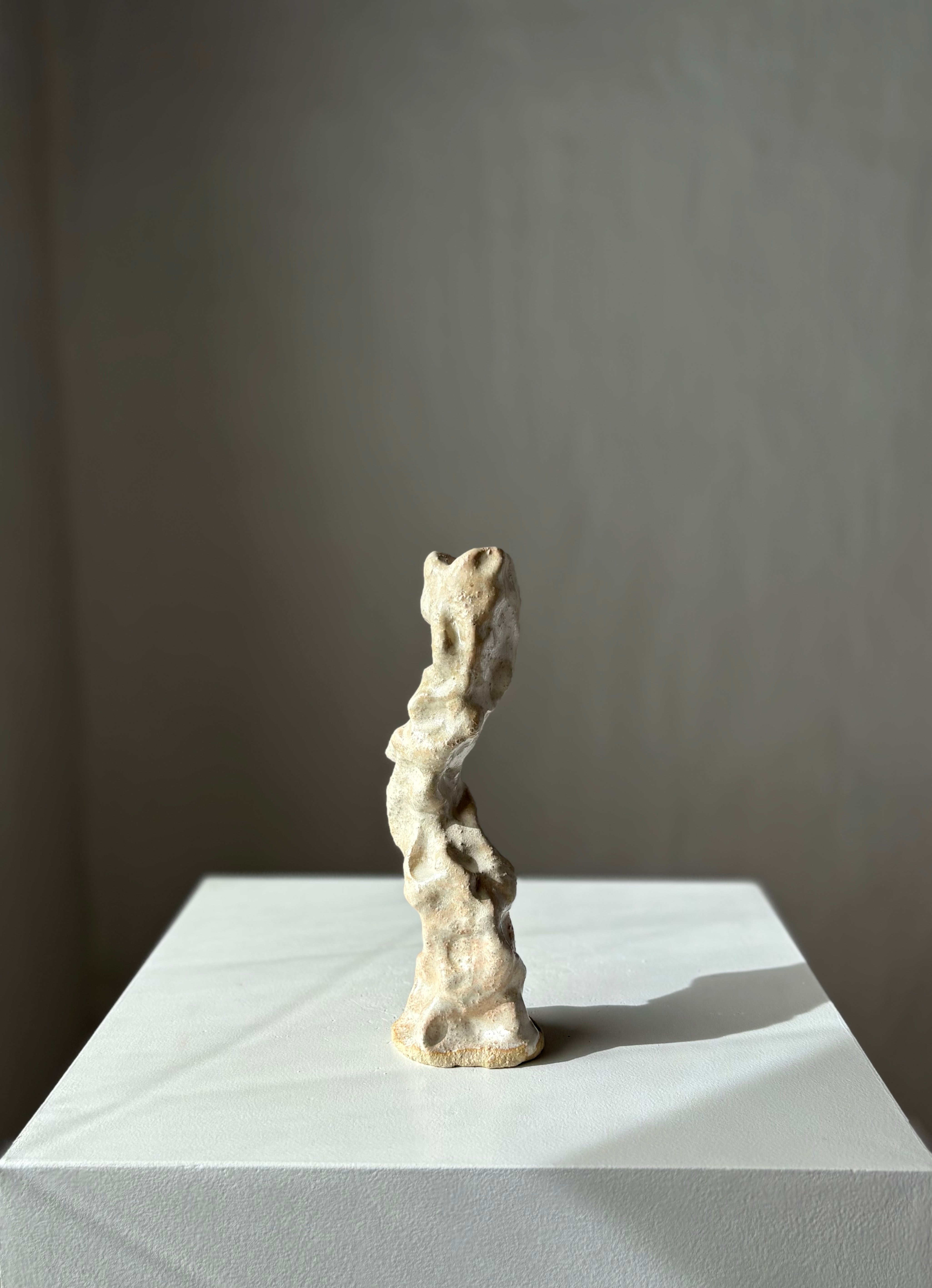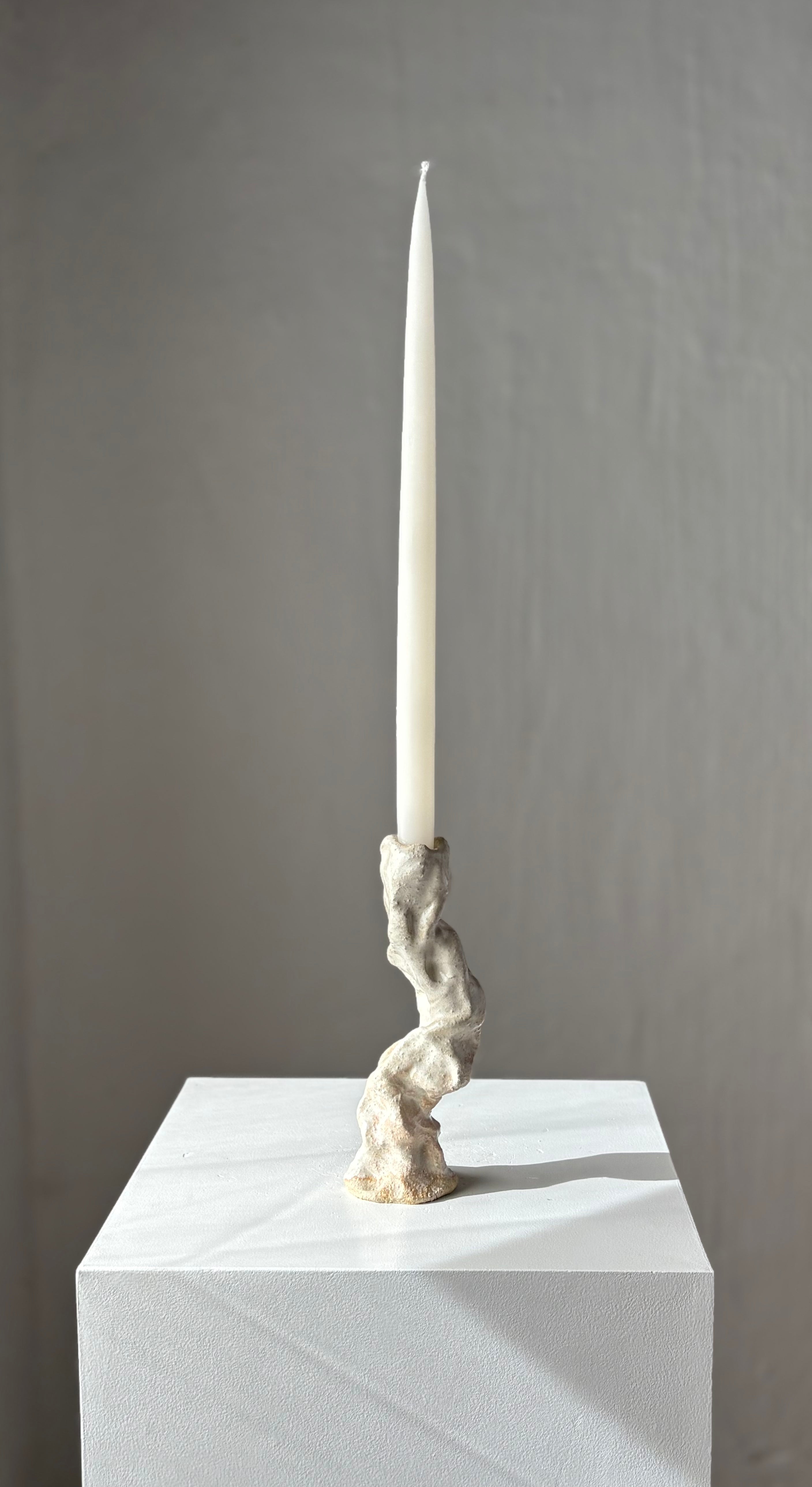 Håndbygget skulpturel unika lysestage, af Leela Mette. Stagen er glaseret i et tyndt lag beige for et smukt samspil med det grove ler.