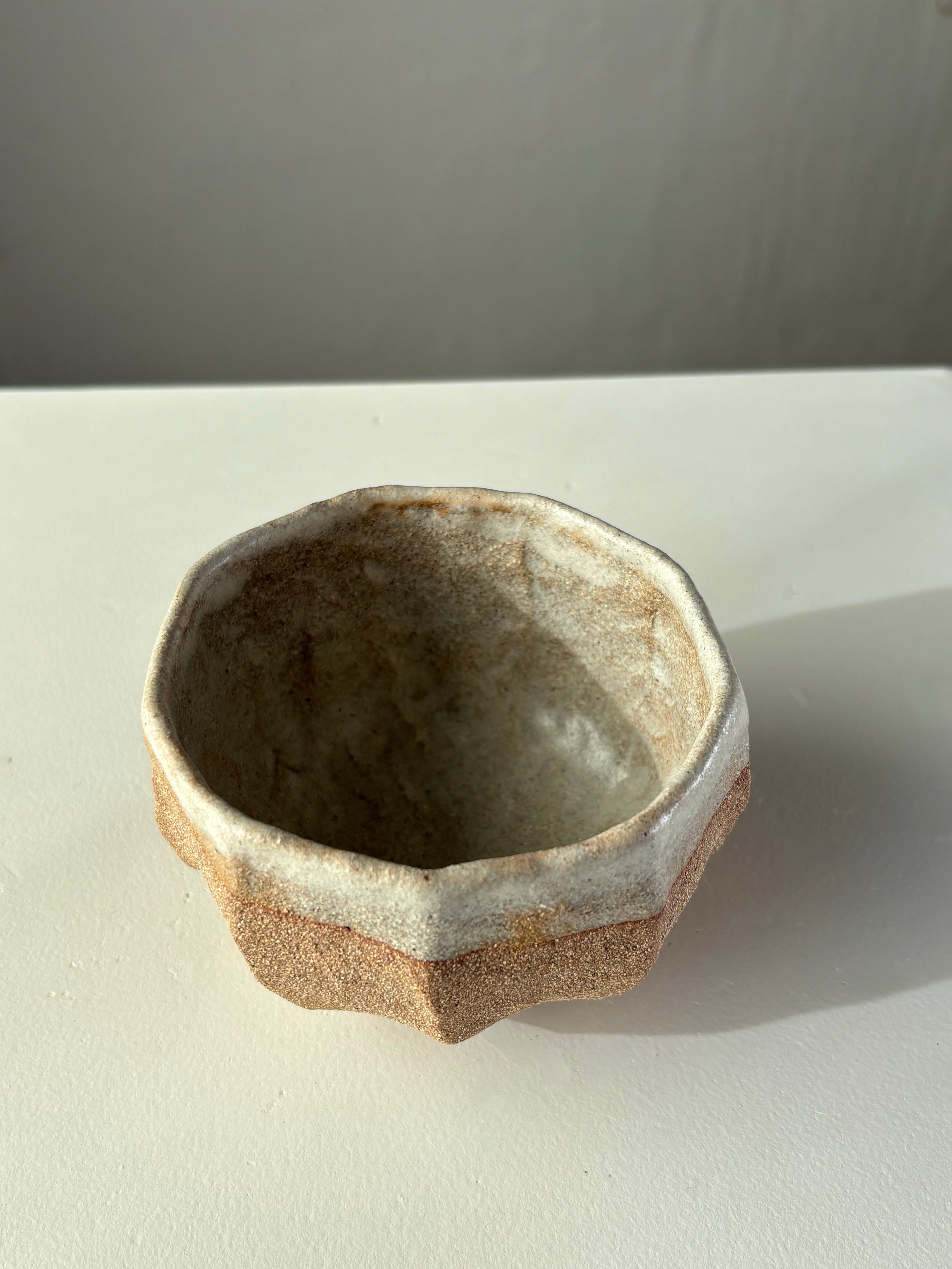 Håndbygget unika kop, af Leela Mette. Den er glaseret i en smuk beige silkemat glausur der giver en smuk effekt med brunleret.