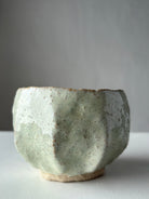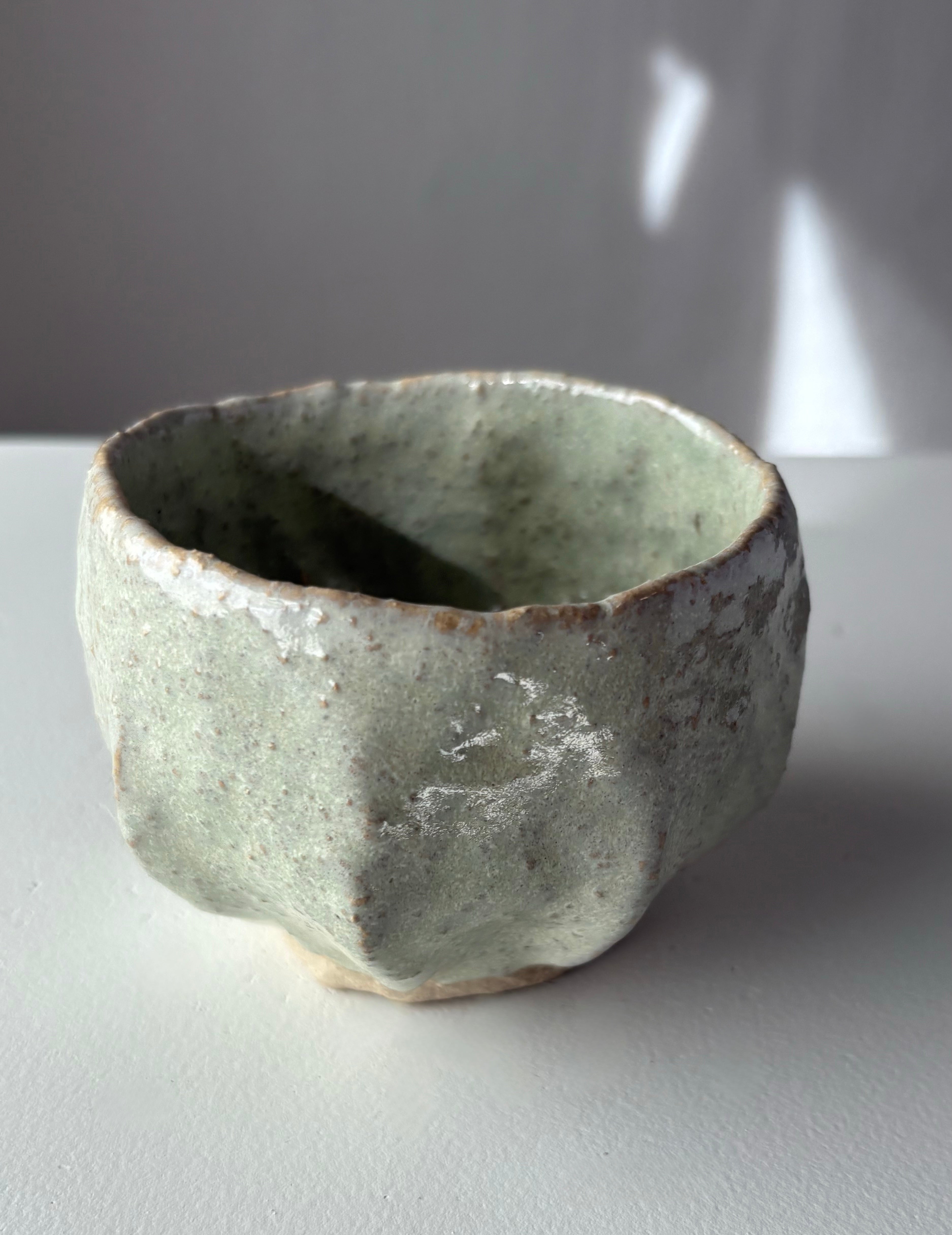 Håndbygget unika kop, af Leela Mette. Den er glaseret i en smuk grøn glausur der lader den uperfekte form træde frem og viser den grove lerstruktur.