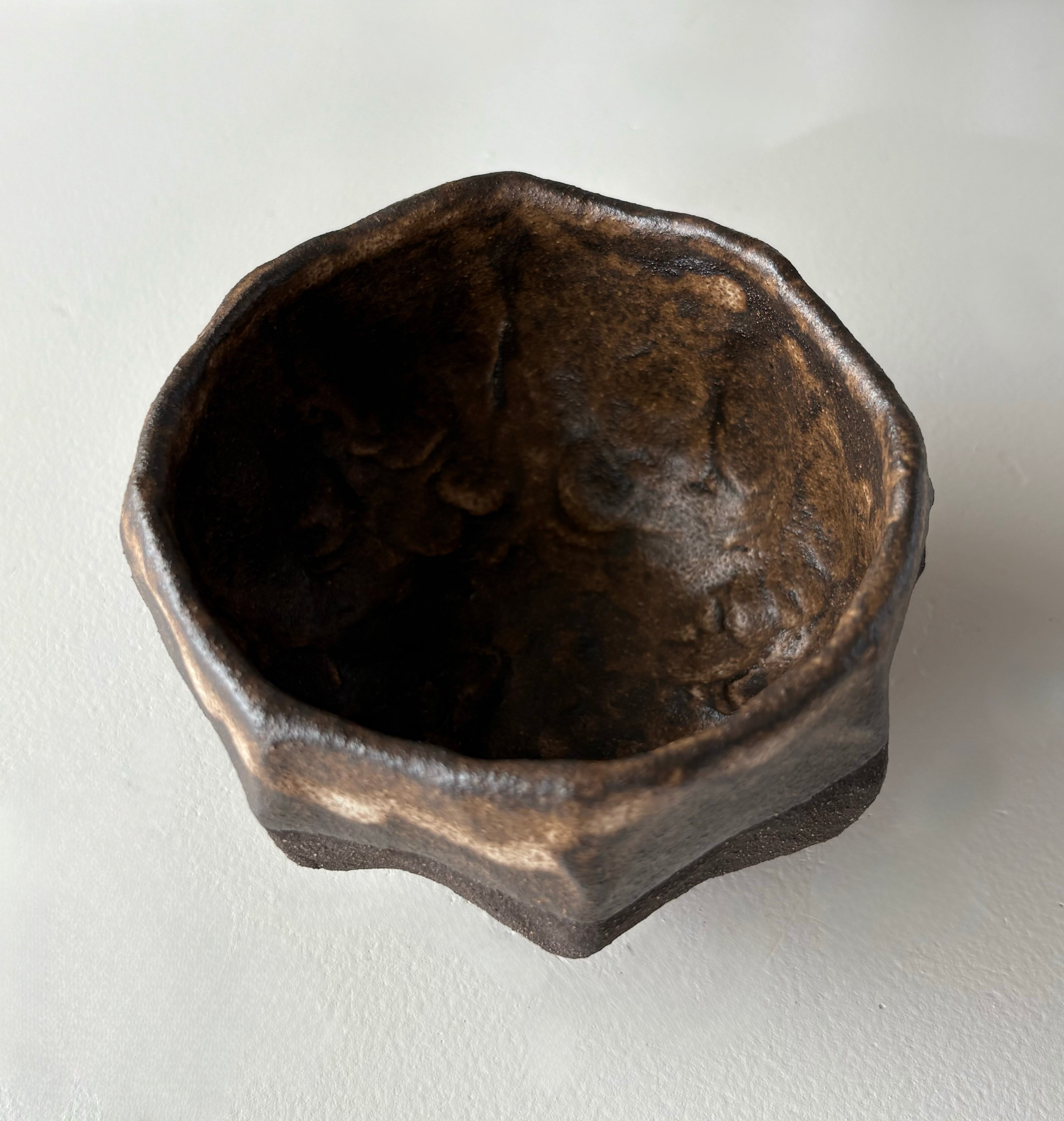 Håndbygget unika kop, i sortler, af Leela Mette. Den er glaseret indvendig i en lysere glasur, hvilket giver et fantastisk spil.