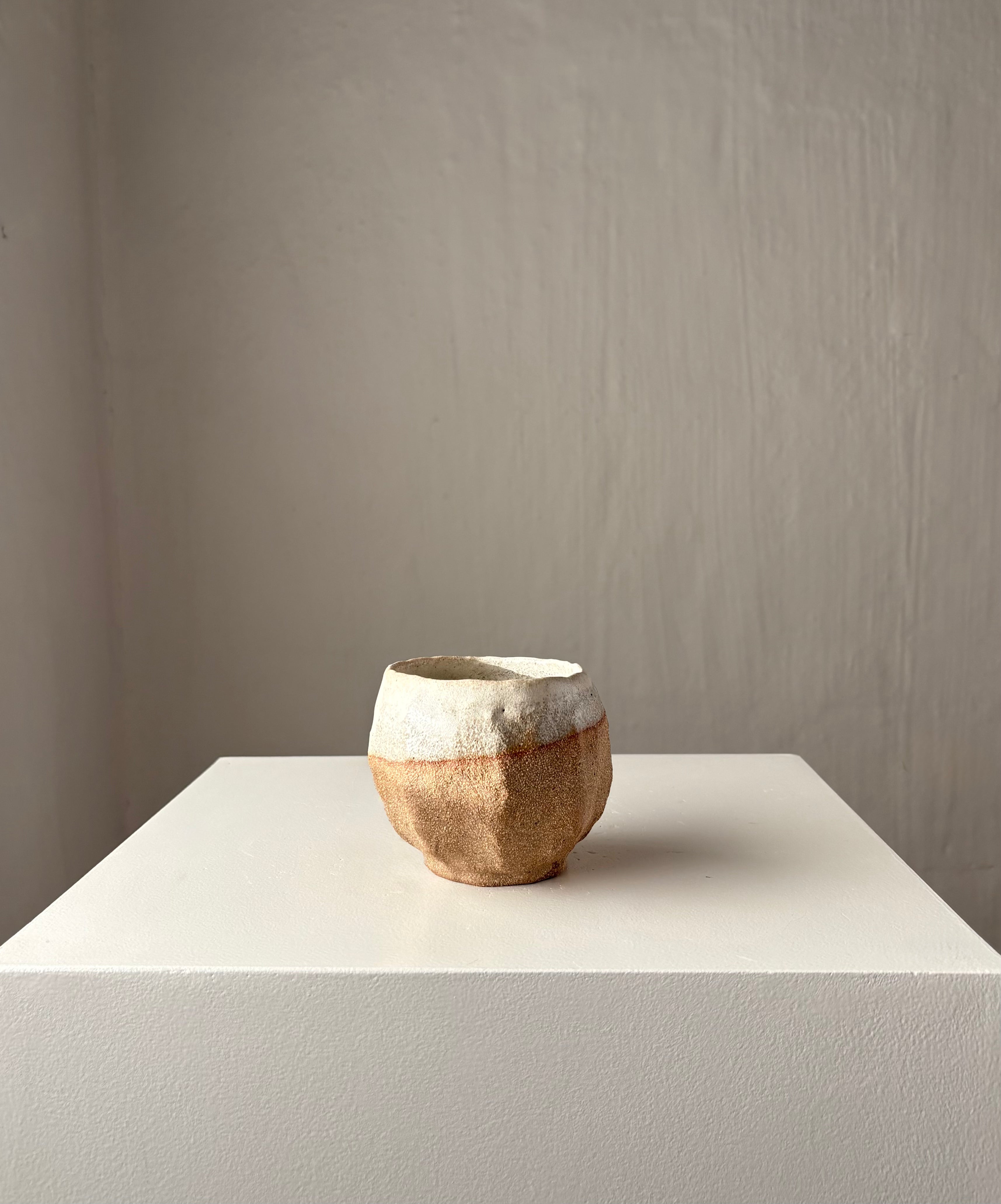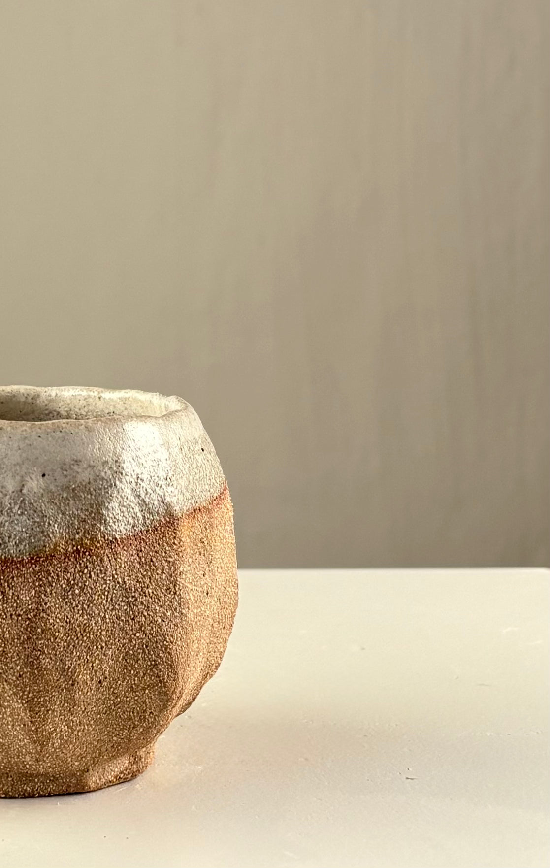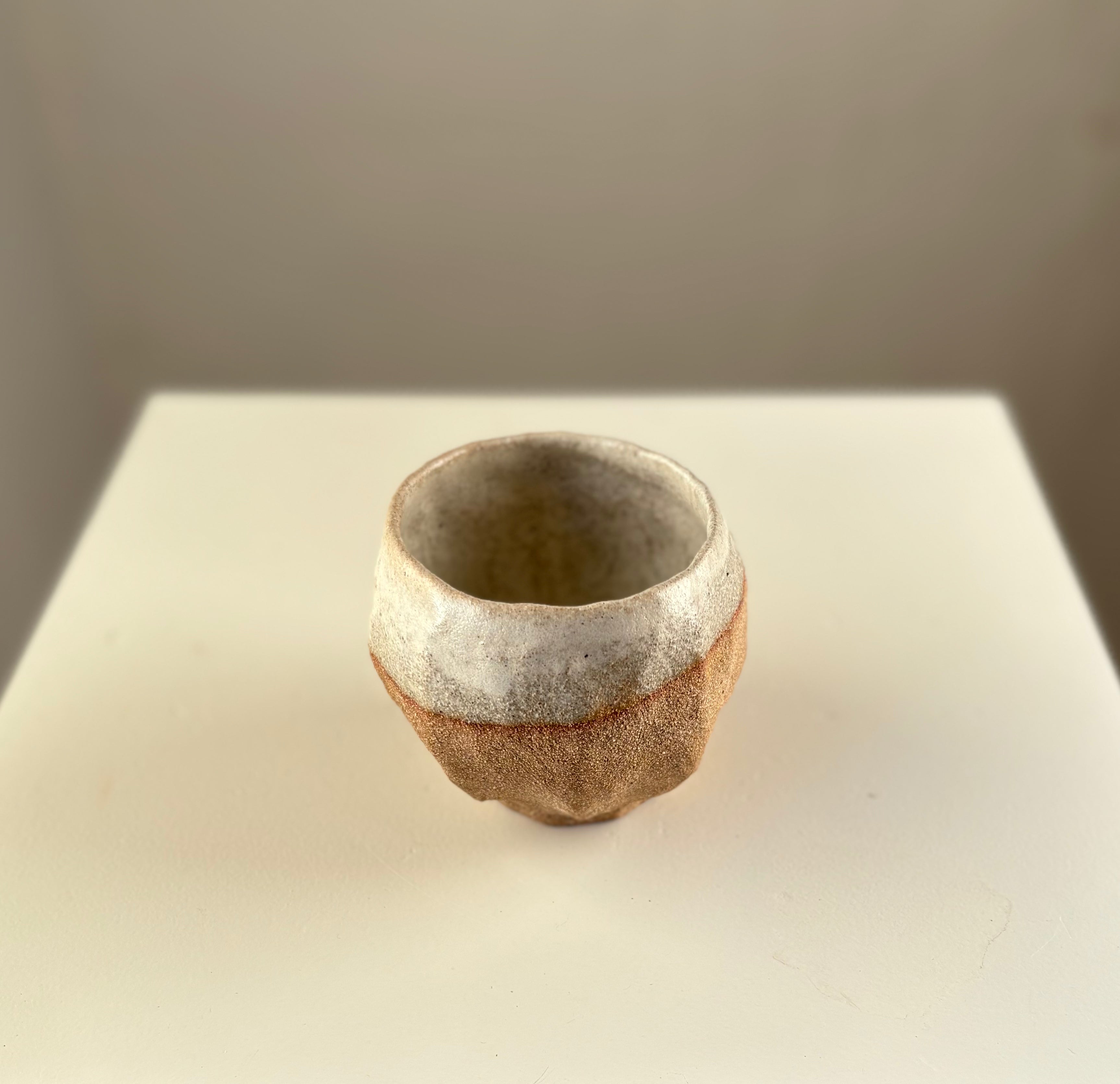 Håndbygget unika kop, af Leela Mette. Den er glaseret i en smuk beige silkemat glausur der giver en smuk effekt med brunleret.