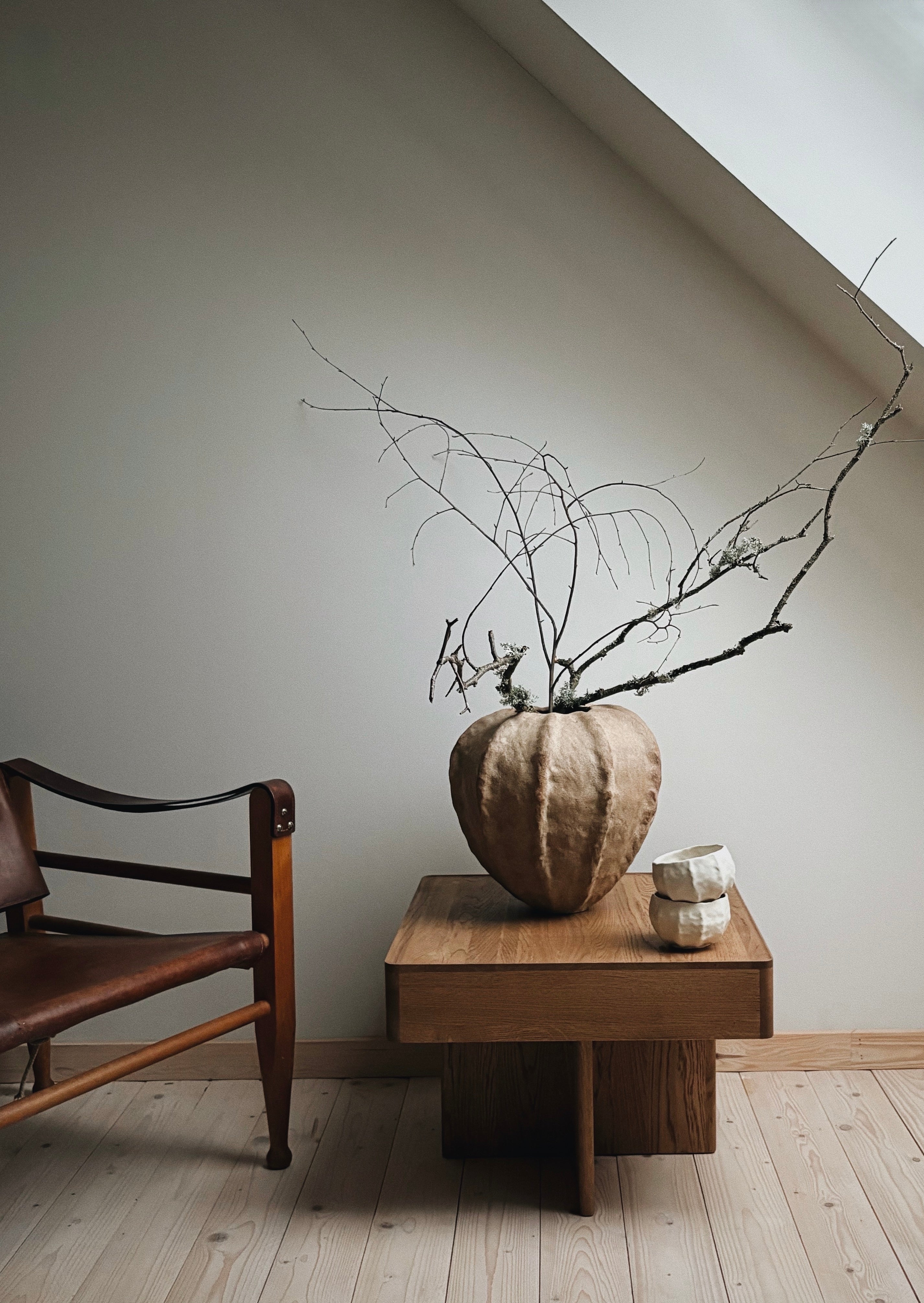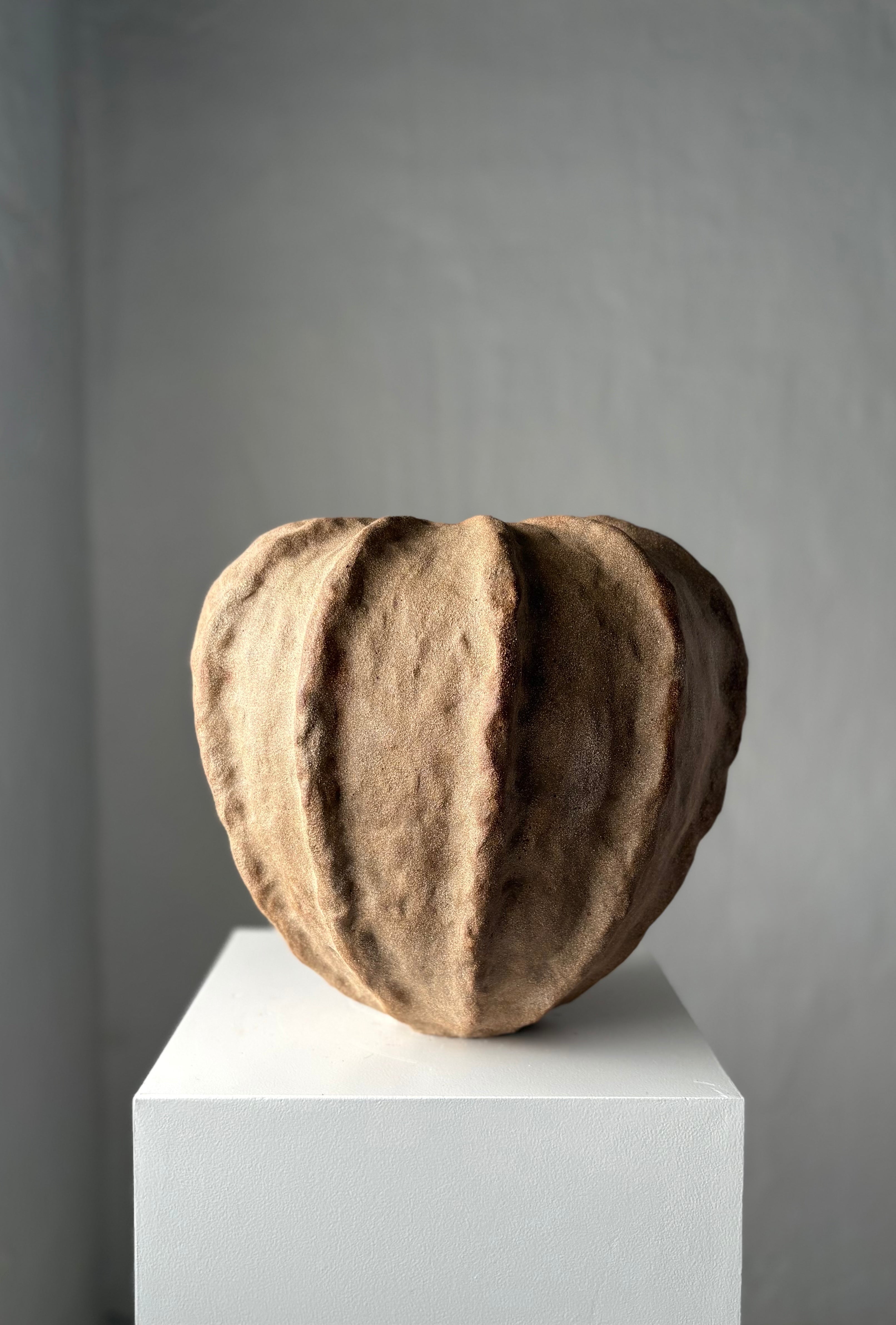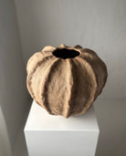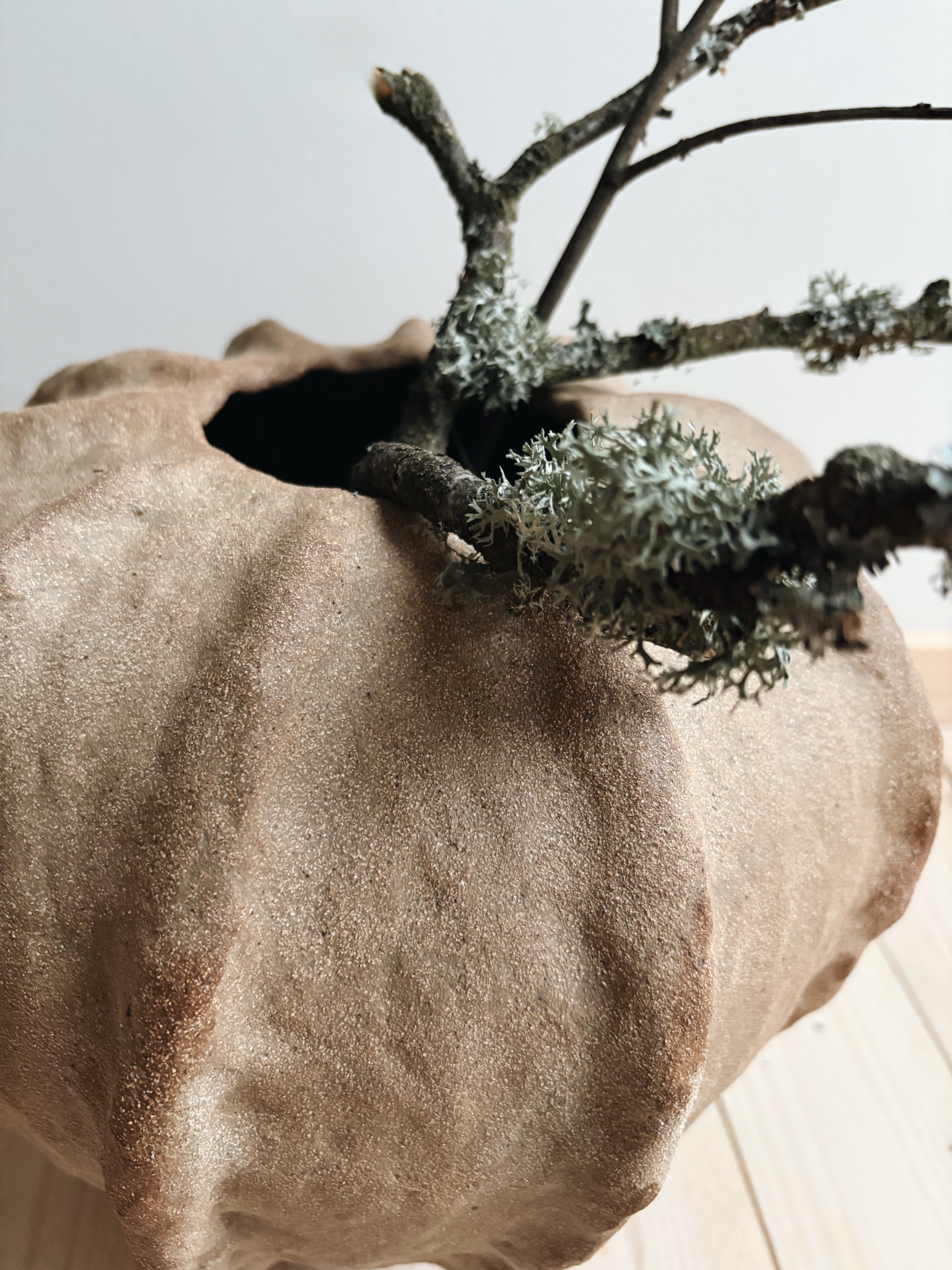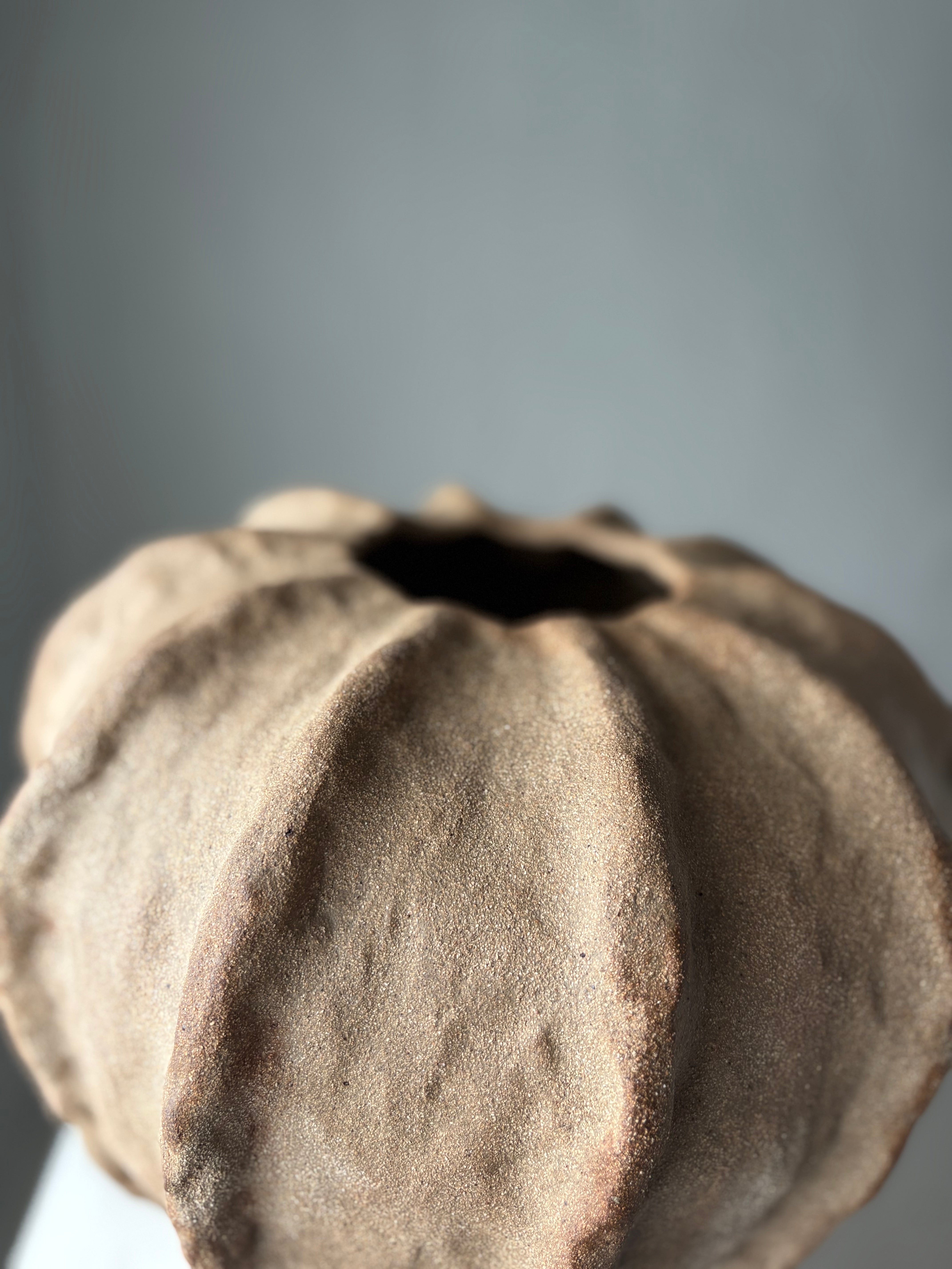 Håndbygget skulpturel vase i rå ler, unika af Leela Mette. Min tilgang til leret er intuitivt og meditativt. Hver enkelt vase afslører mine hændes aftryk - det vækker dine sanser og bringer nærhed i rummet.
