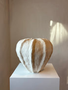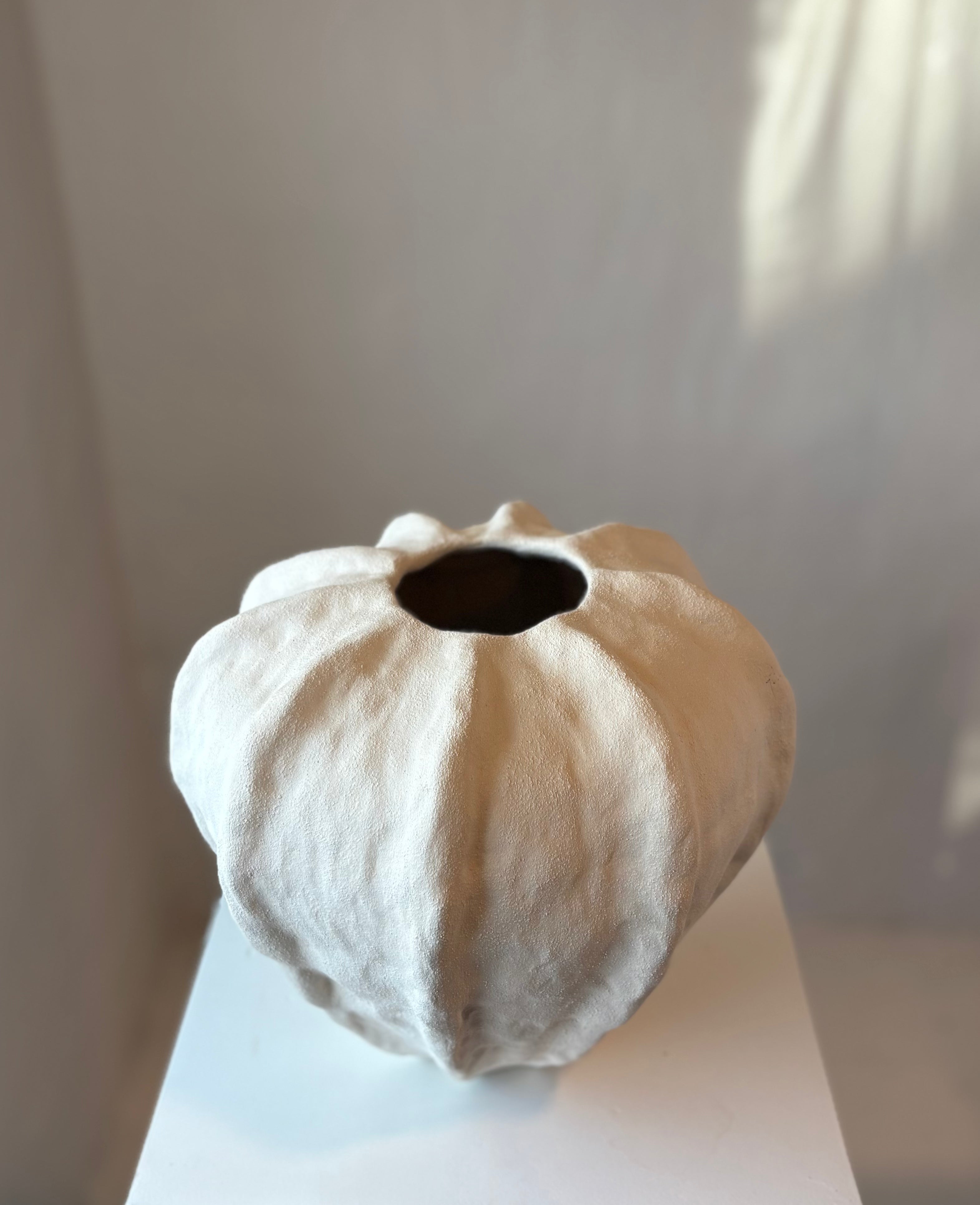 Håndbygget skulpturel unika vase i hvidler, af Leela Mette. Vasen er uglaseret hvilket skaber både liv, dybde og tekstur.