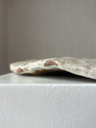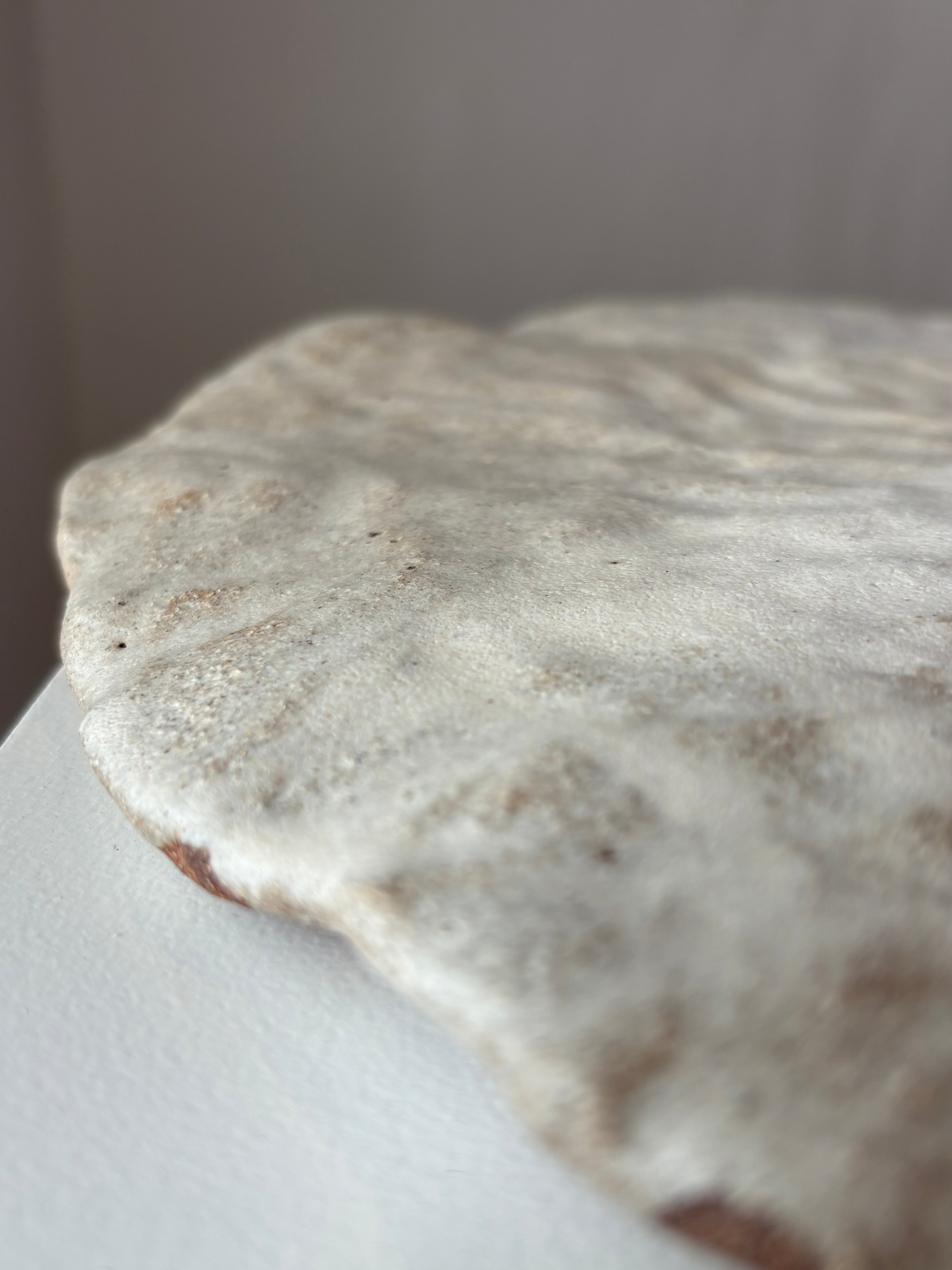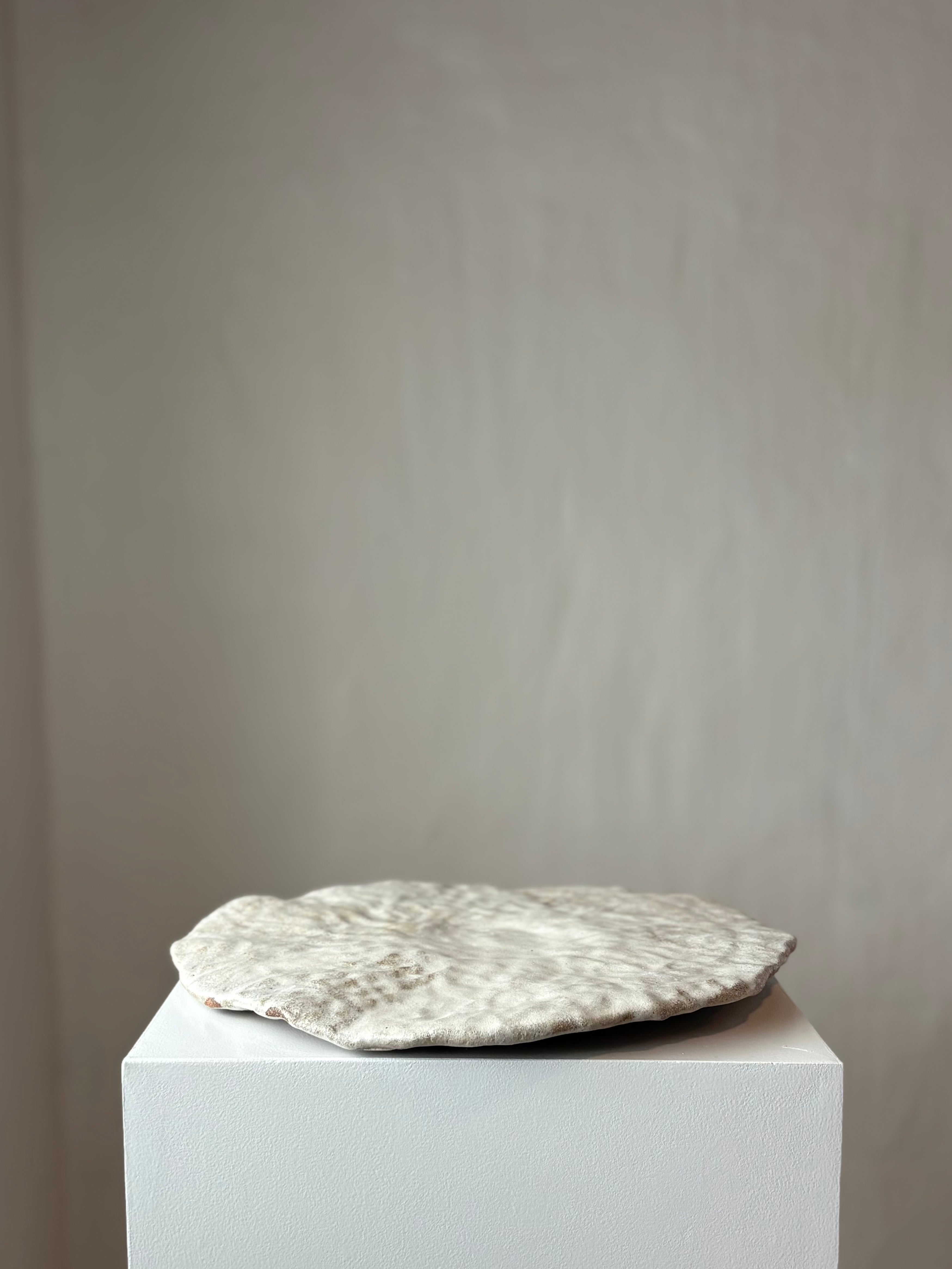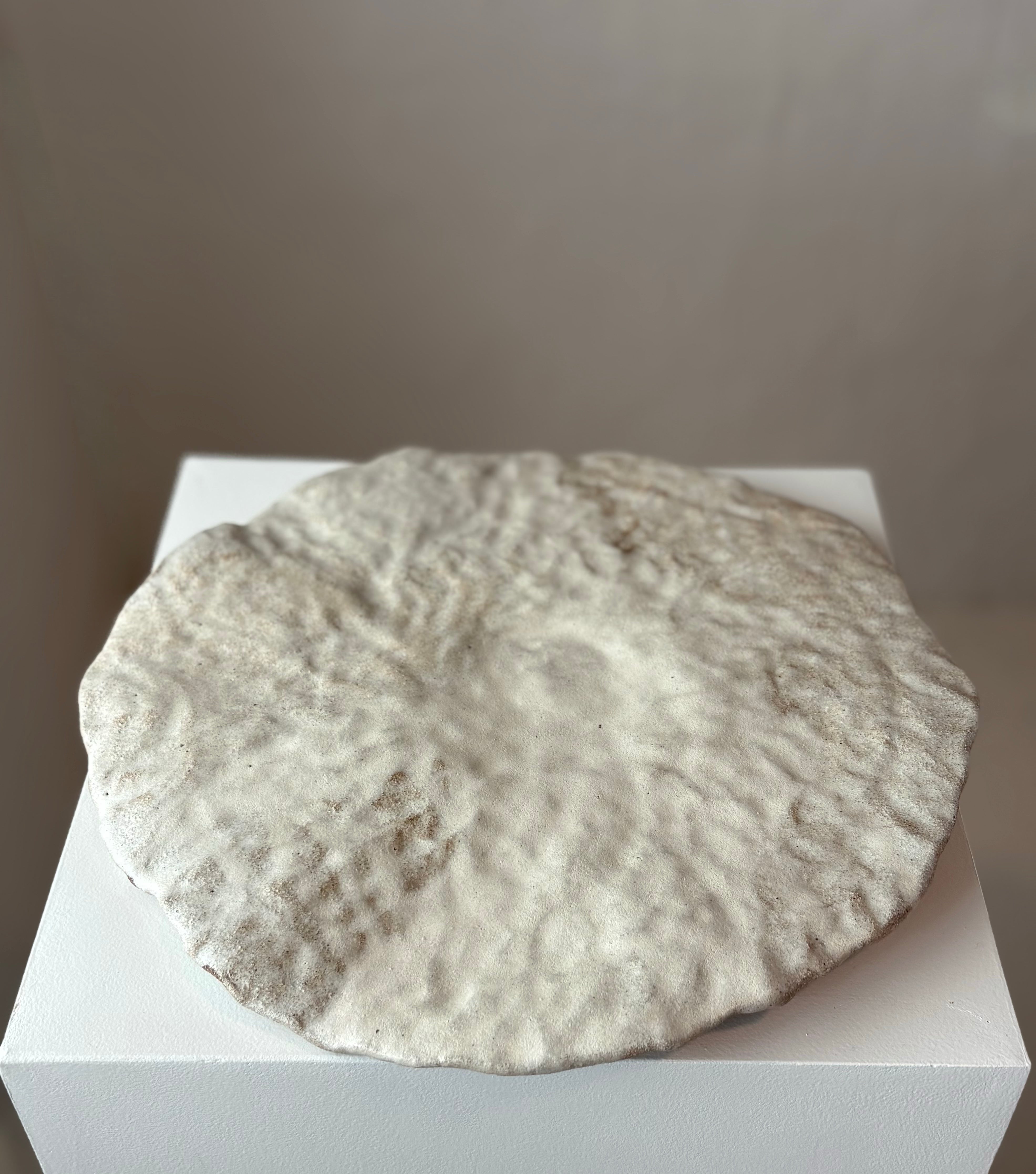 Håndbygget stort skulpturelt fladt fad med en beige glasur, af Leela Mette.