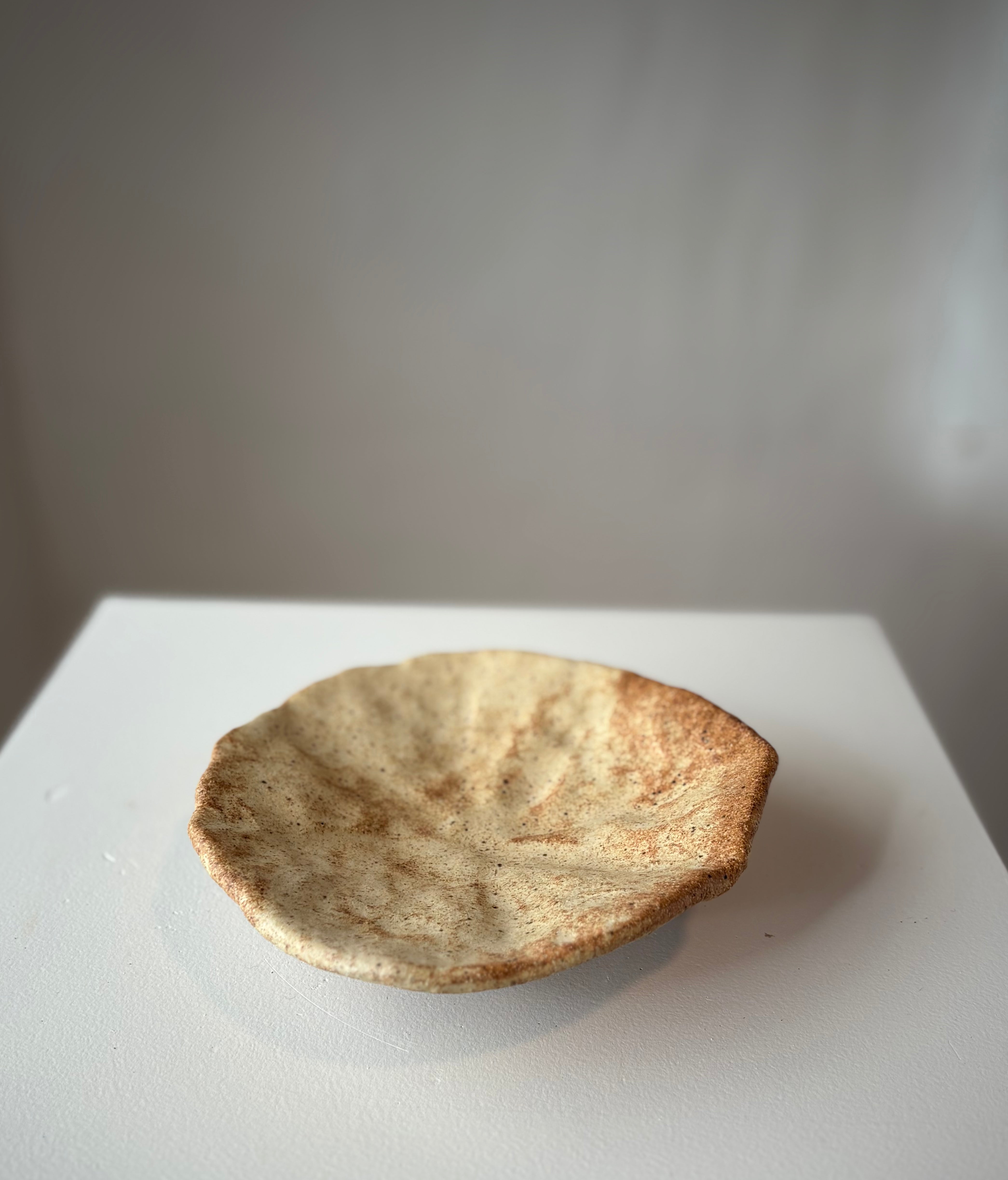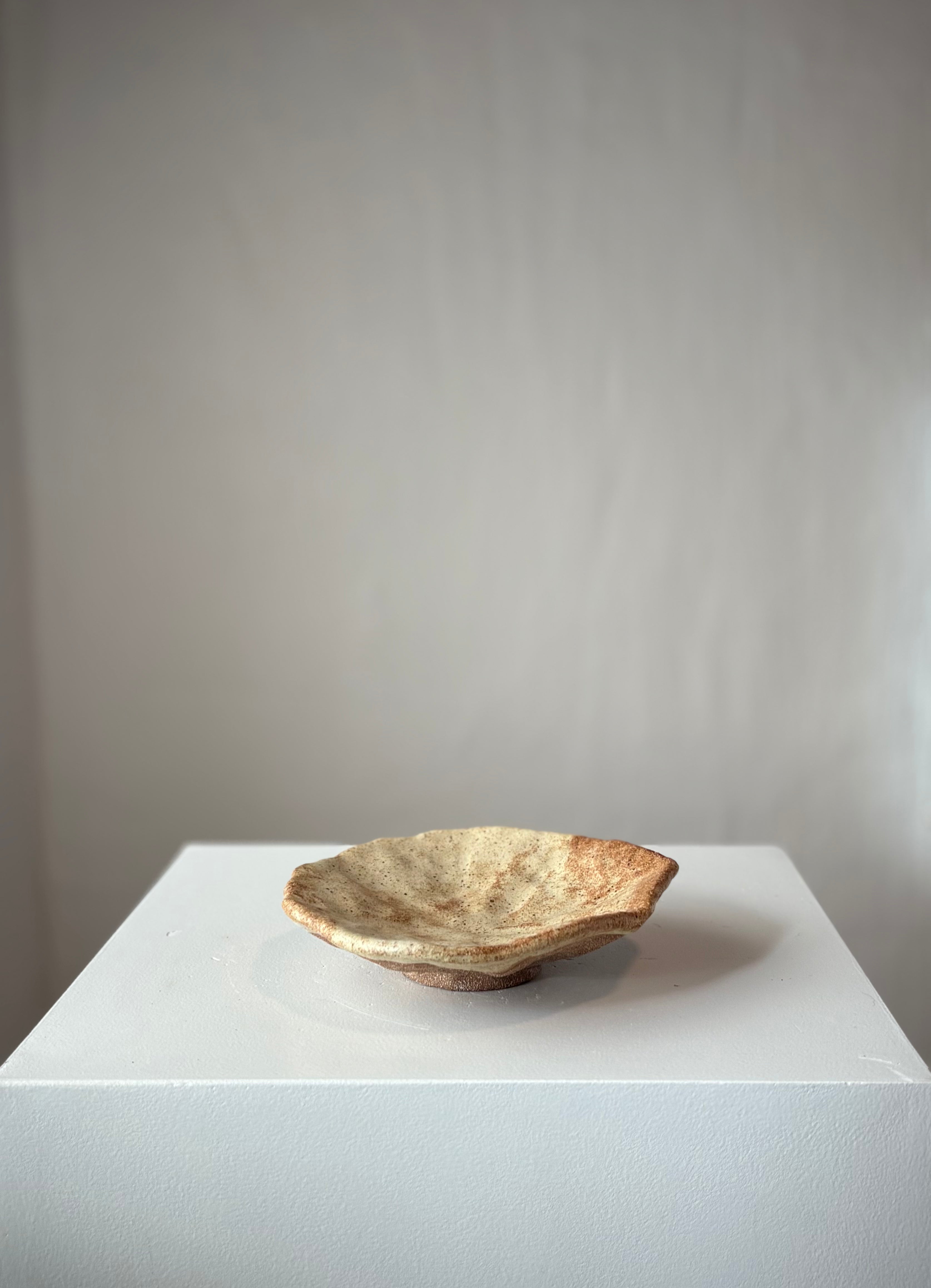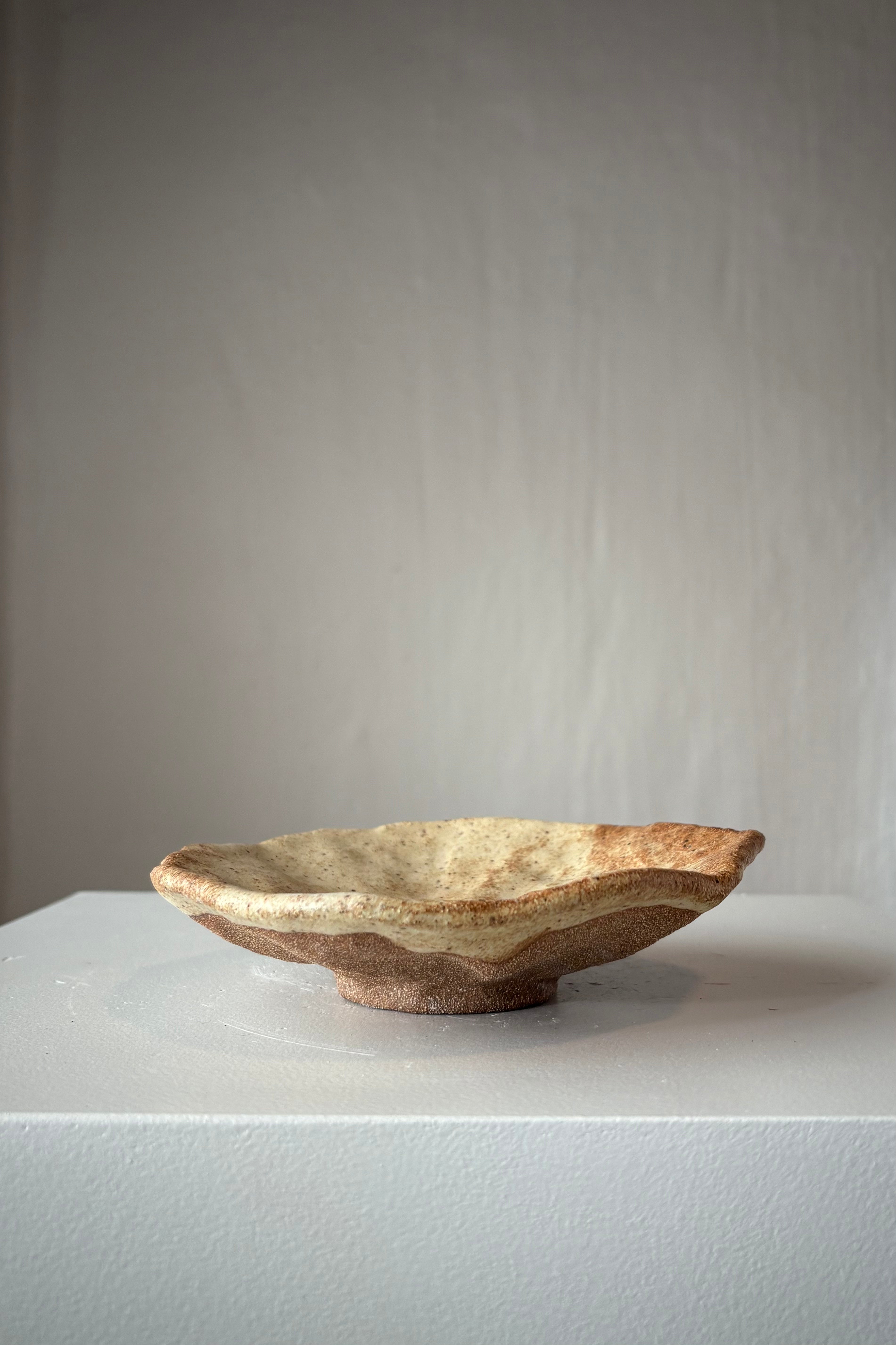 Håndbygget skulpturelt fad med en beige glasur på overfladen, og den rå brune ler på undersiden, af Leela Mette.