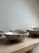 Håndbygget stort skulpturelt fad med en beige glasur, af Leela Mette.