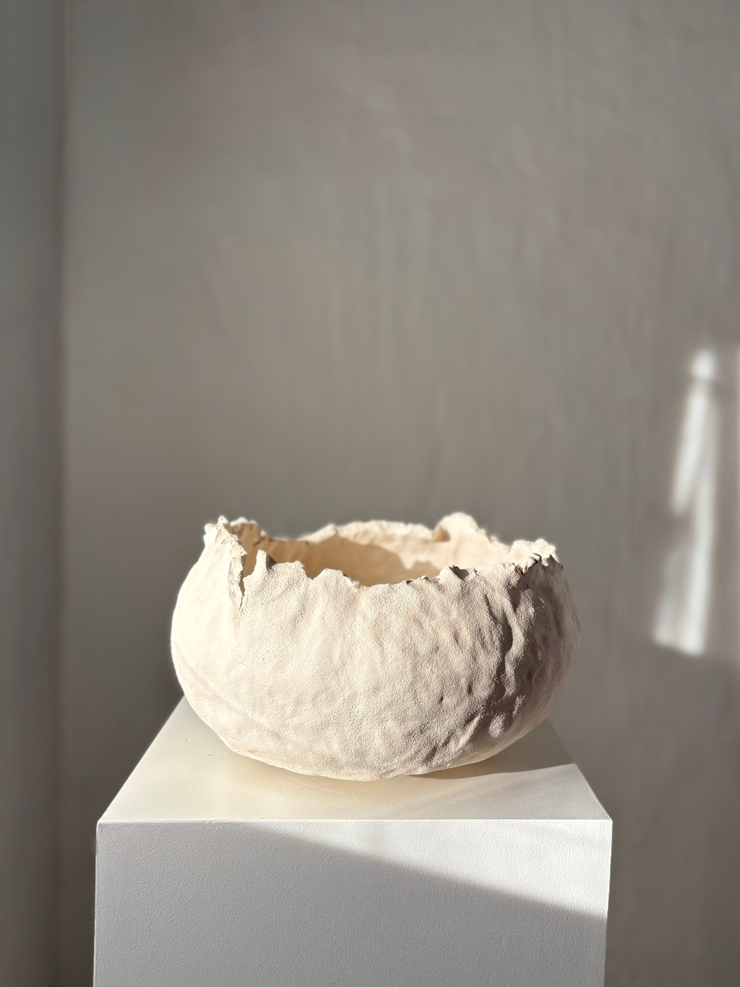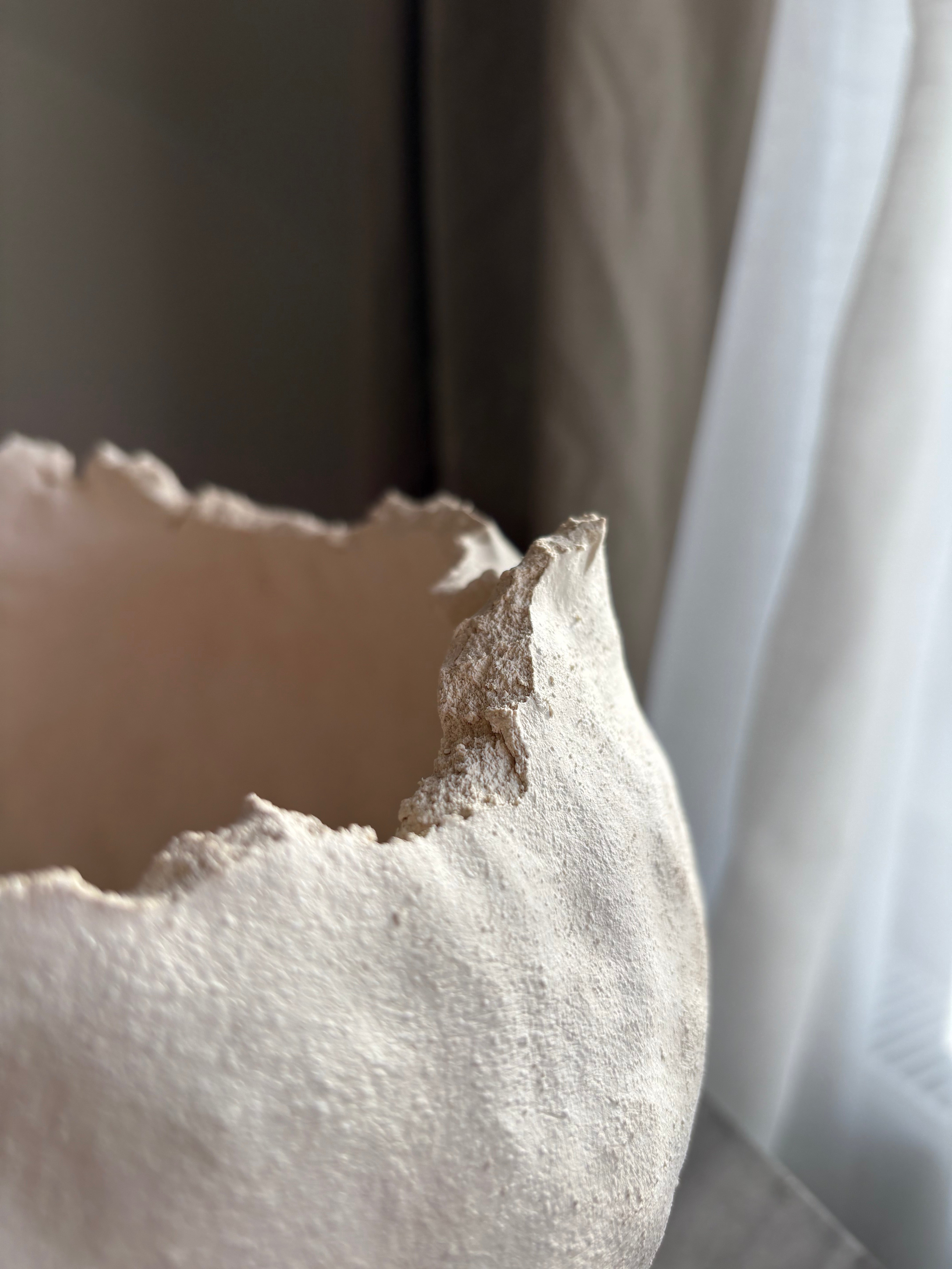 Håndbygget skulptur i hvidler, af Leela Mette. Vasen er uglaseret hvilket skaber både liv, dybde og tekstur.