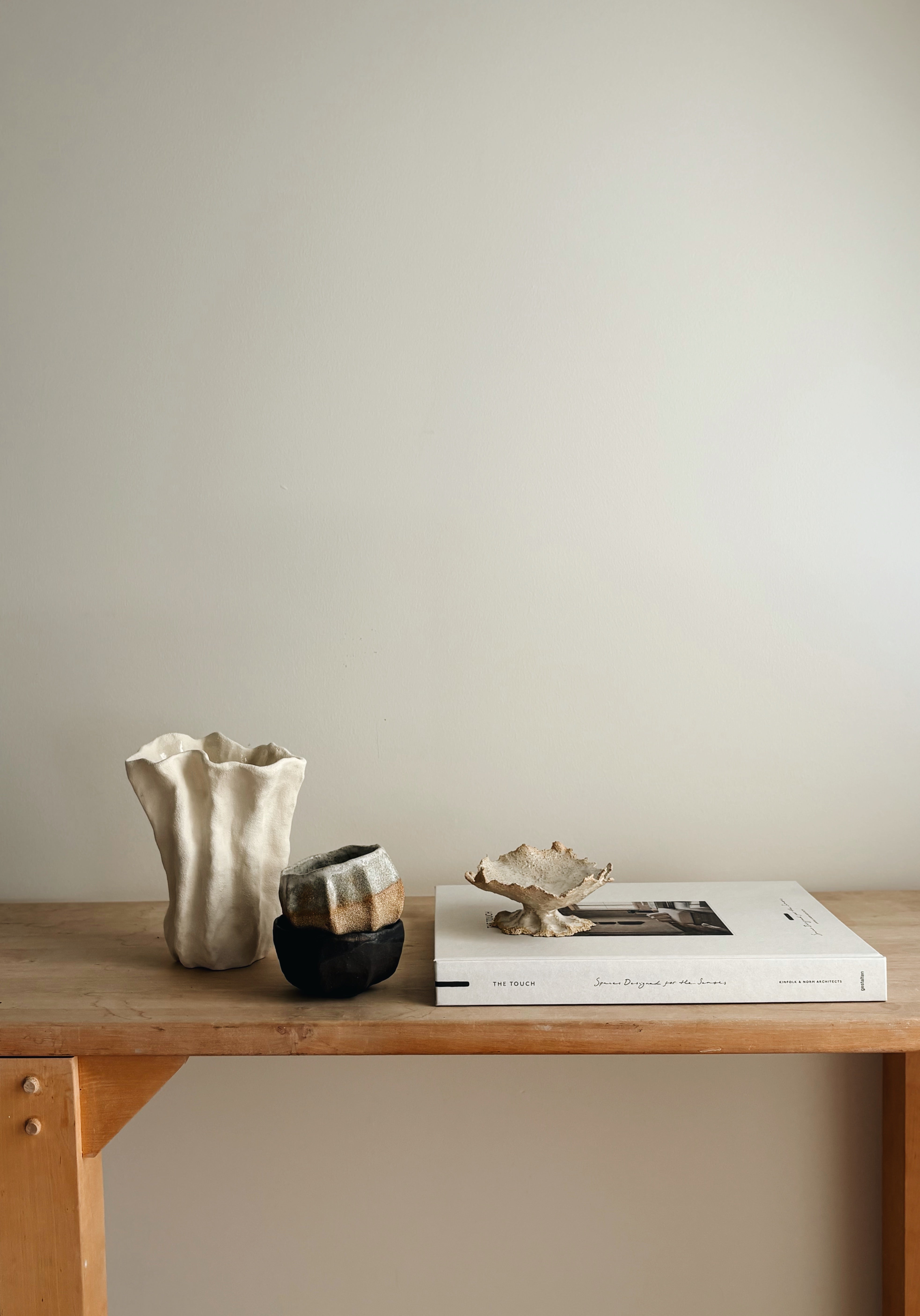 Min tilgang til leret er intuitivt og meditativt. Hver enkelt værk afslører mine hænders aftryk - det vækker dine sanser og bringer nærhed i rummet.