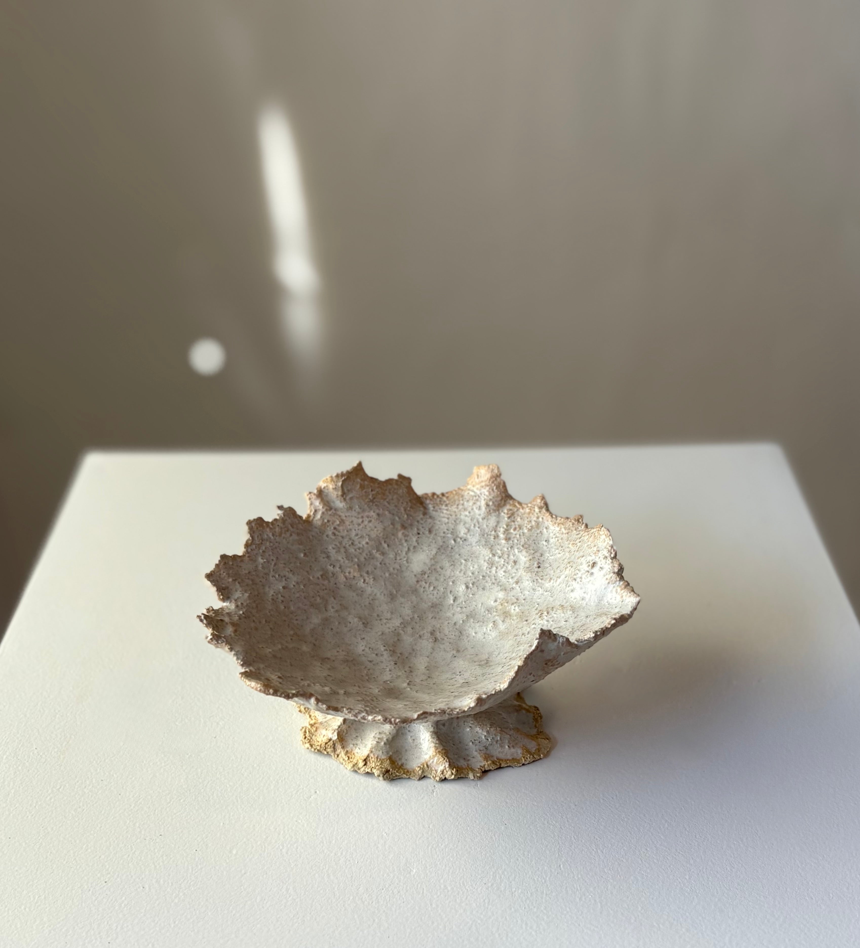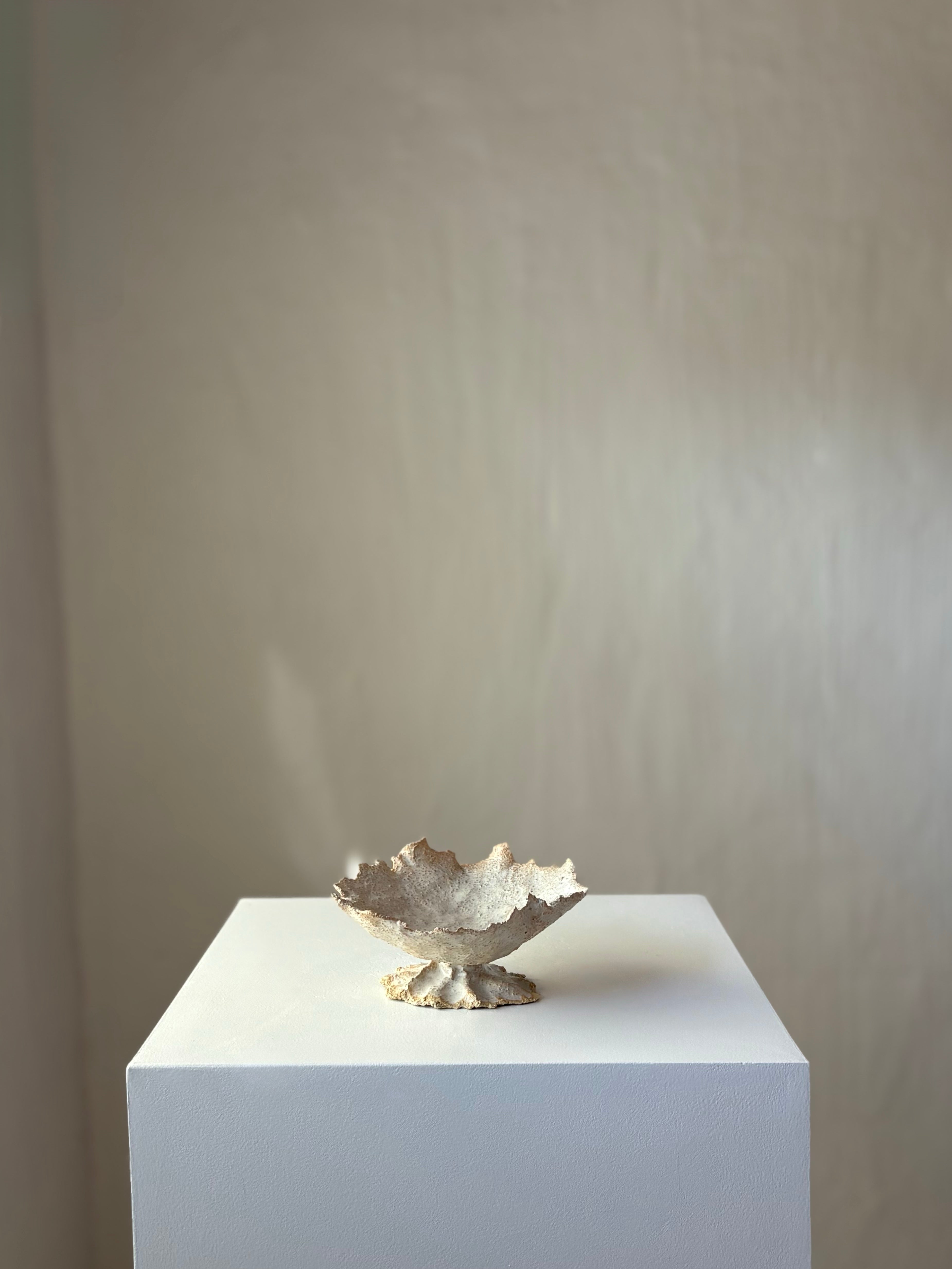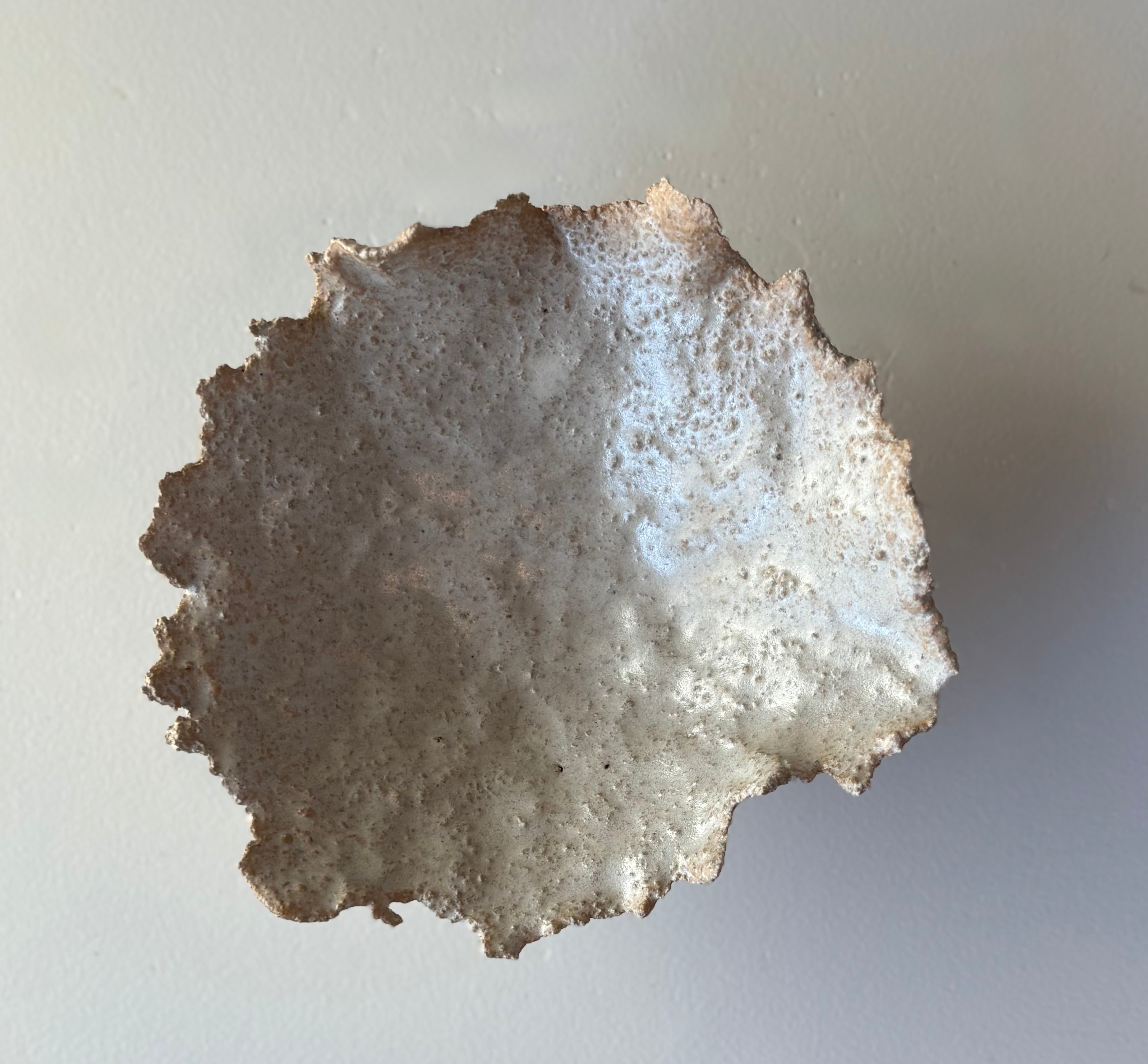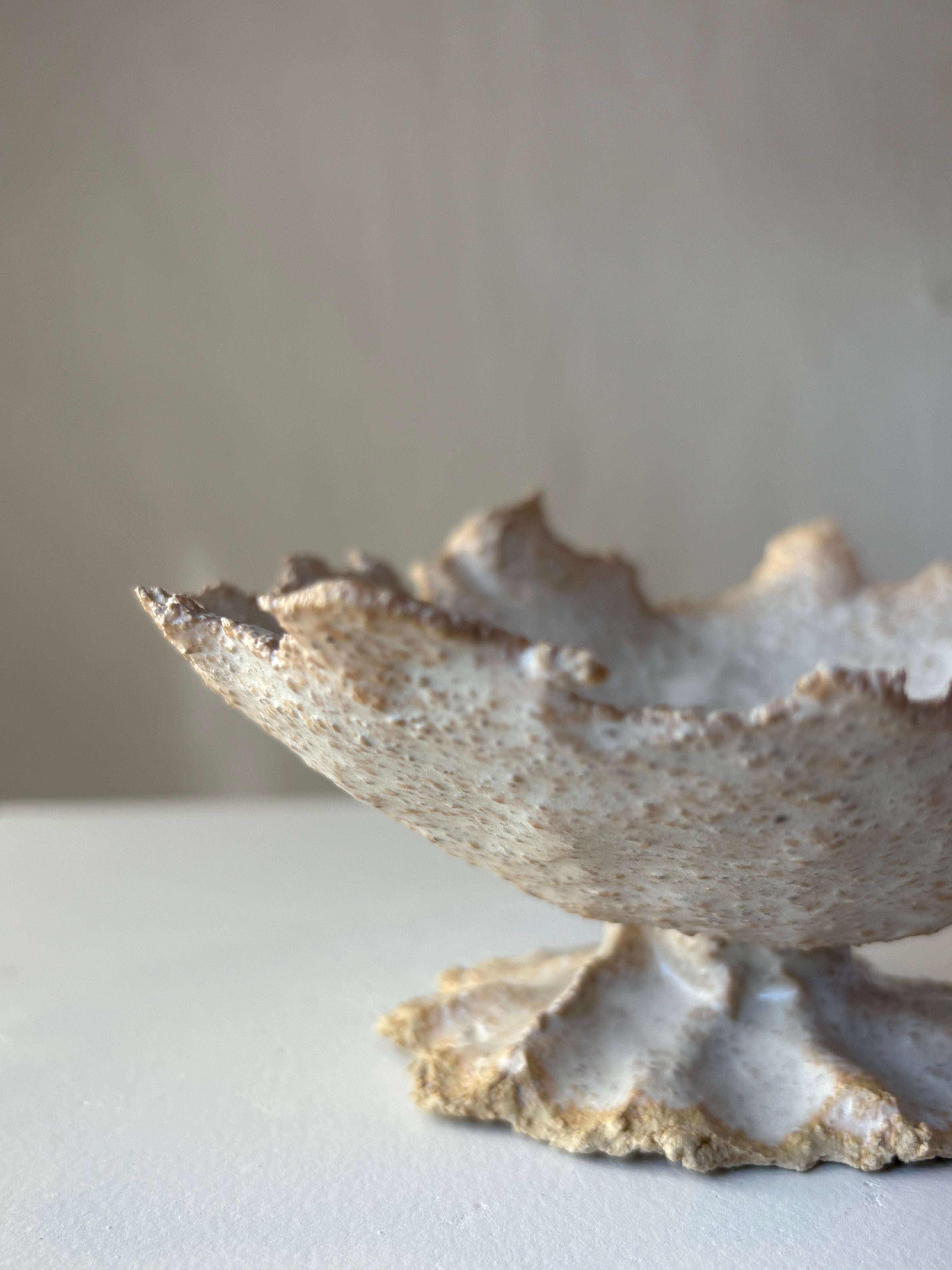 Håndbygget skulpturelt skål med en beige glasur, af Leela Mette.