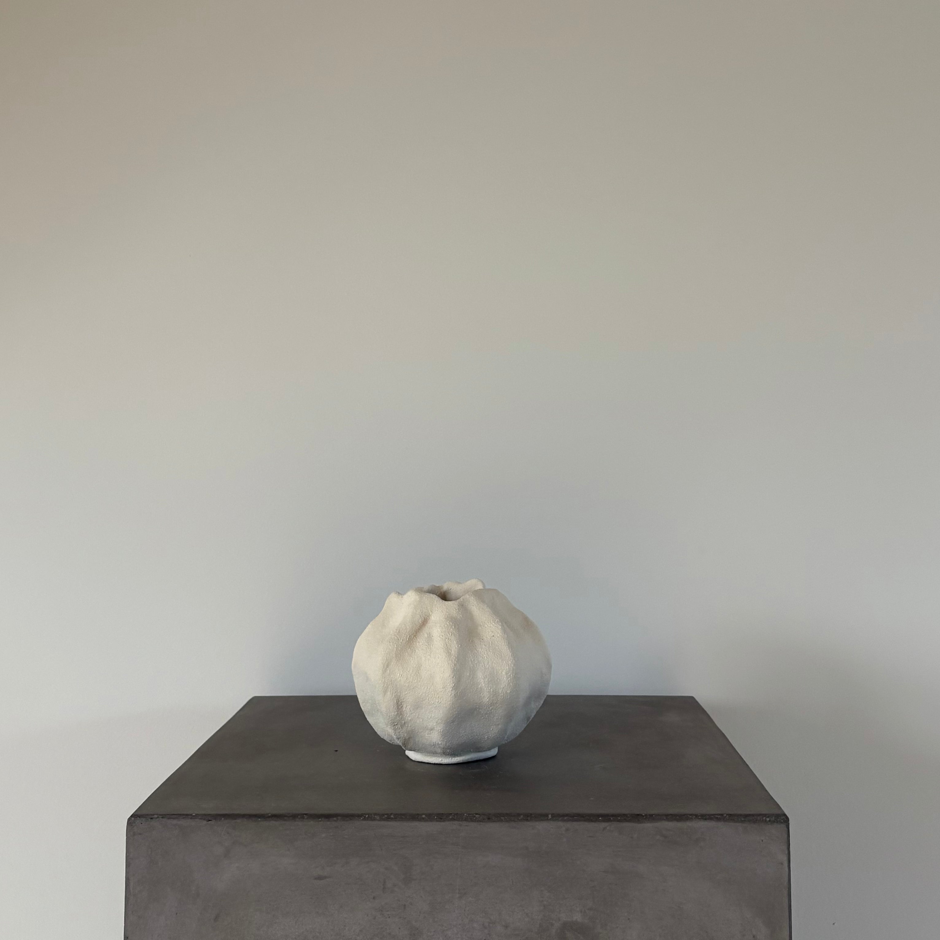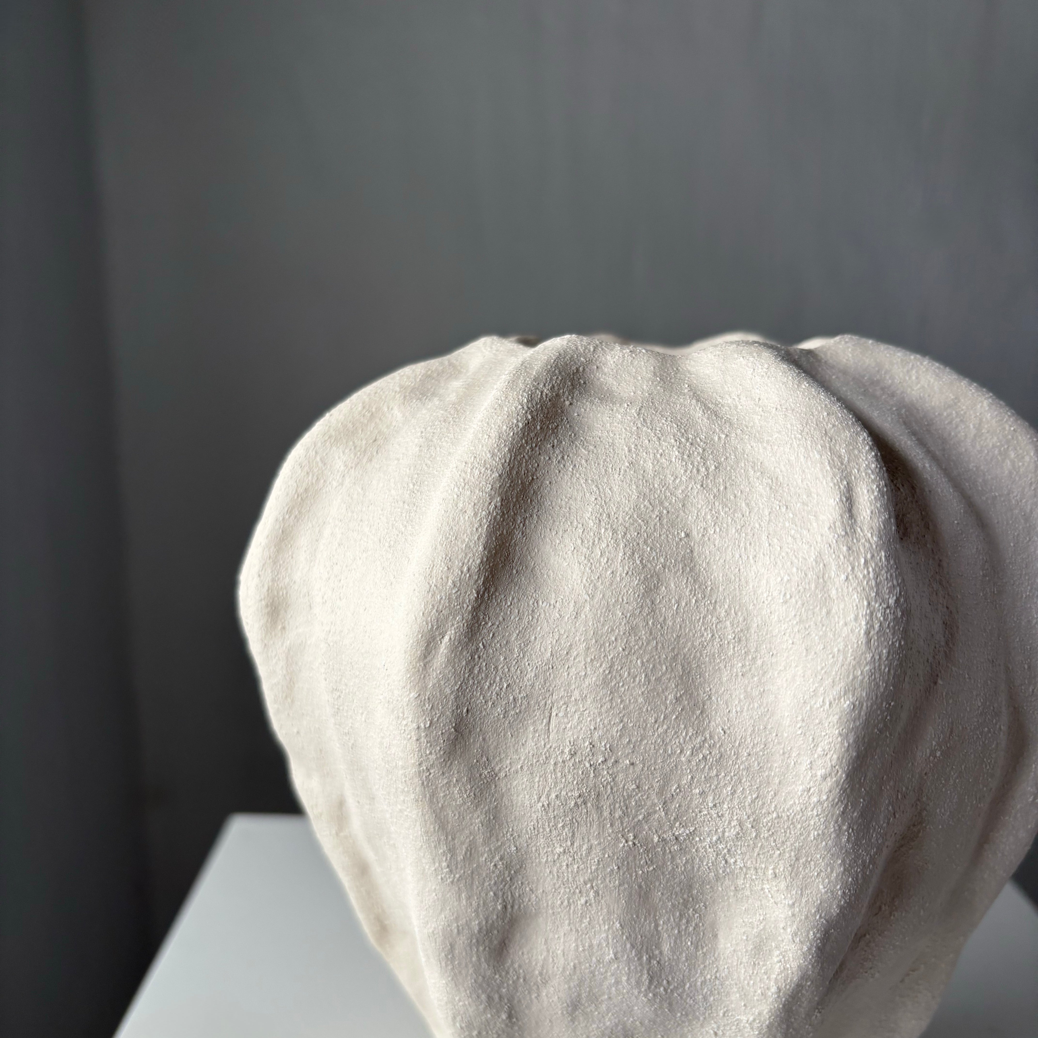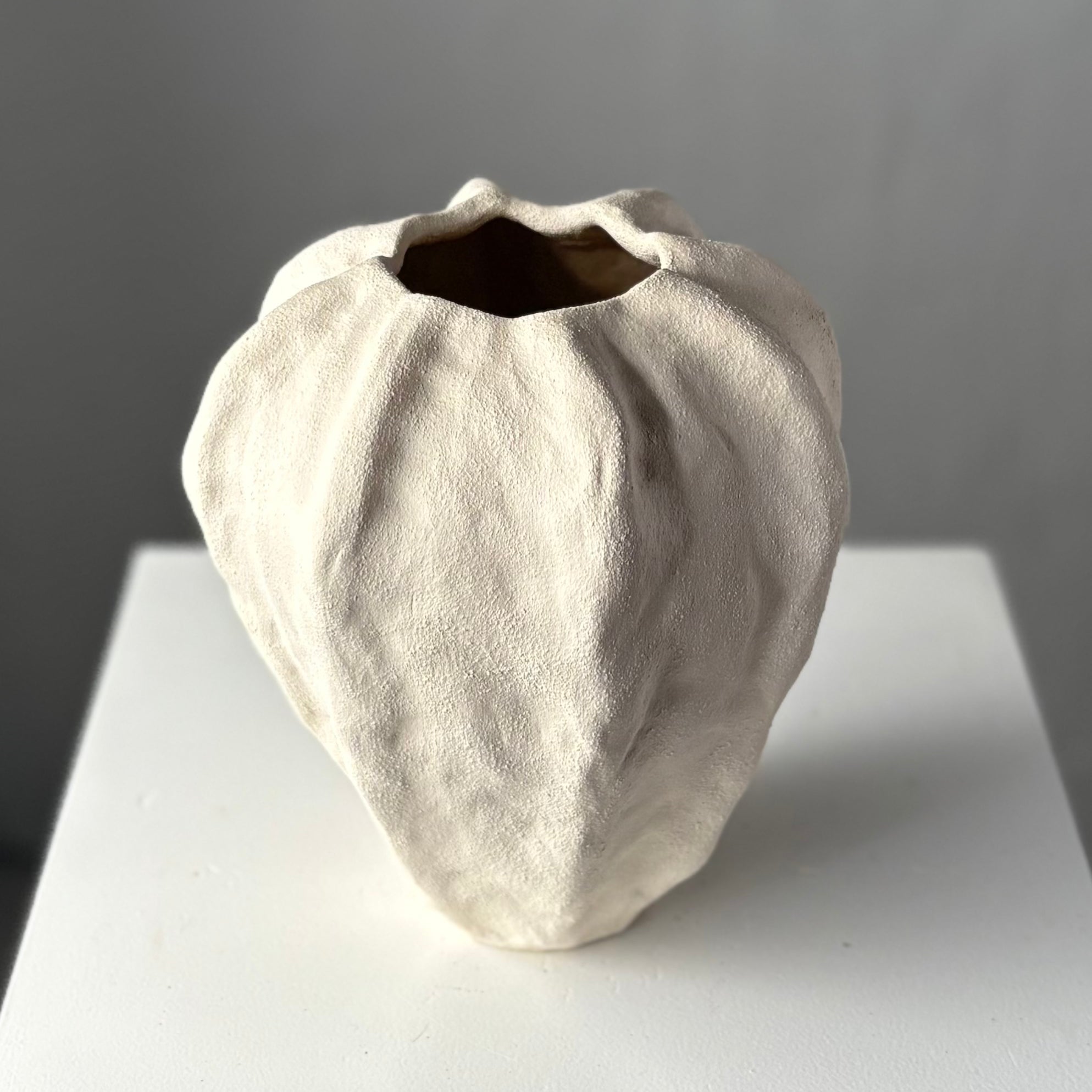 Håndbygget skulpturel unika vase i hvidler, af Leela Mette. Vasen er uglaseret og skaber både liv, dybde og tekstur.