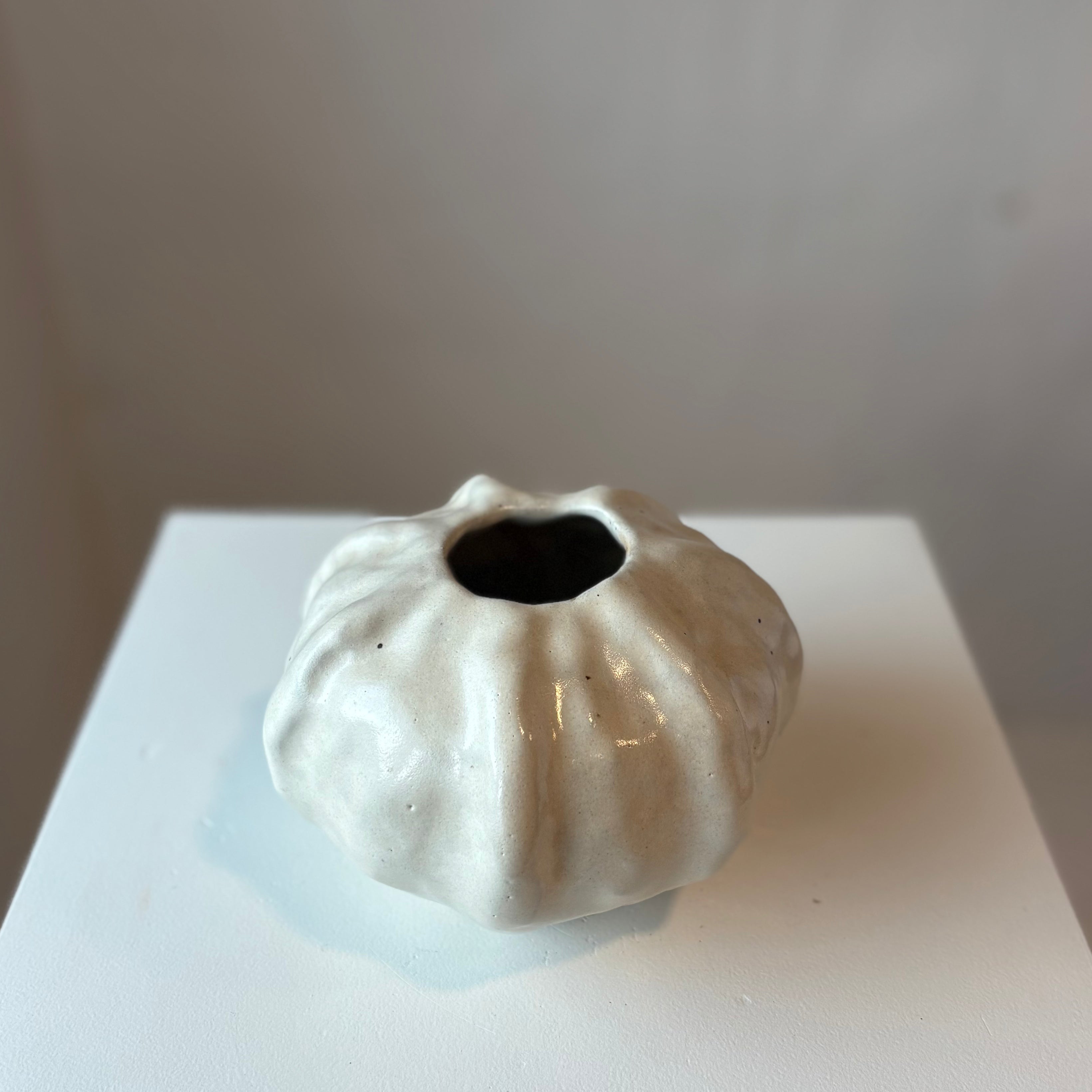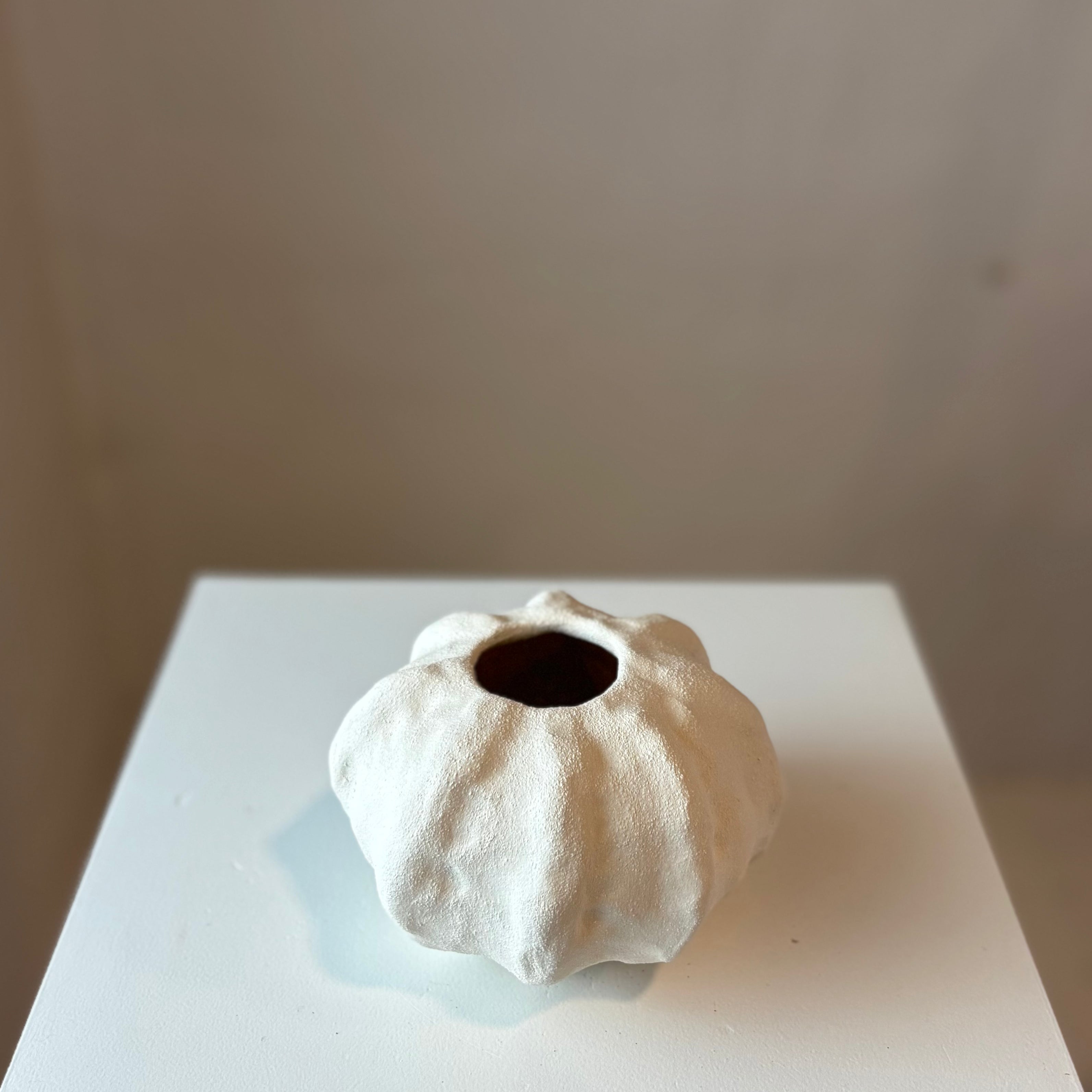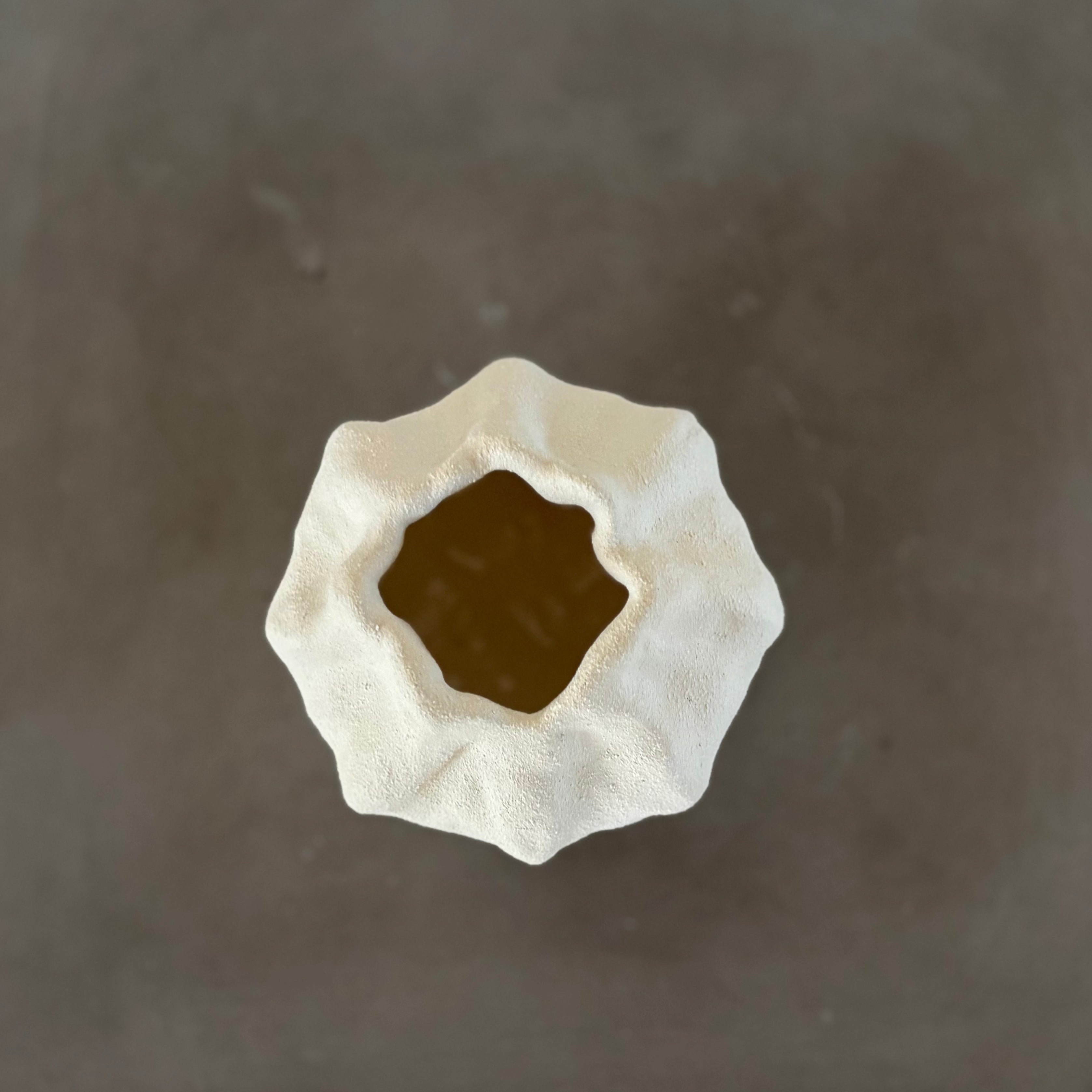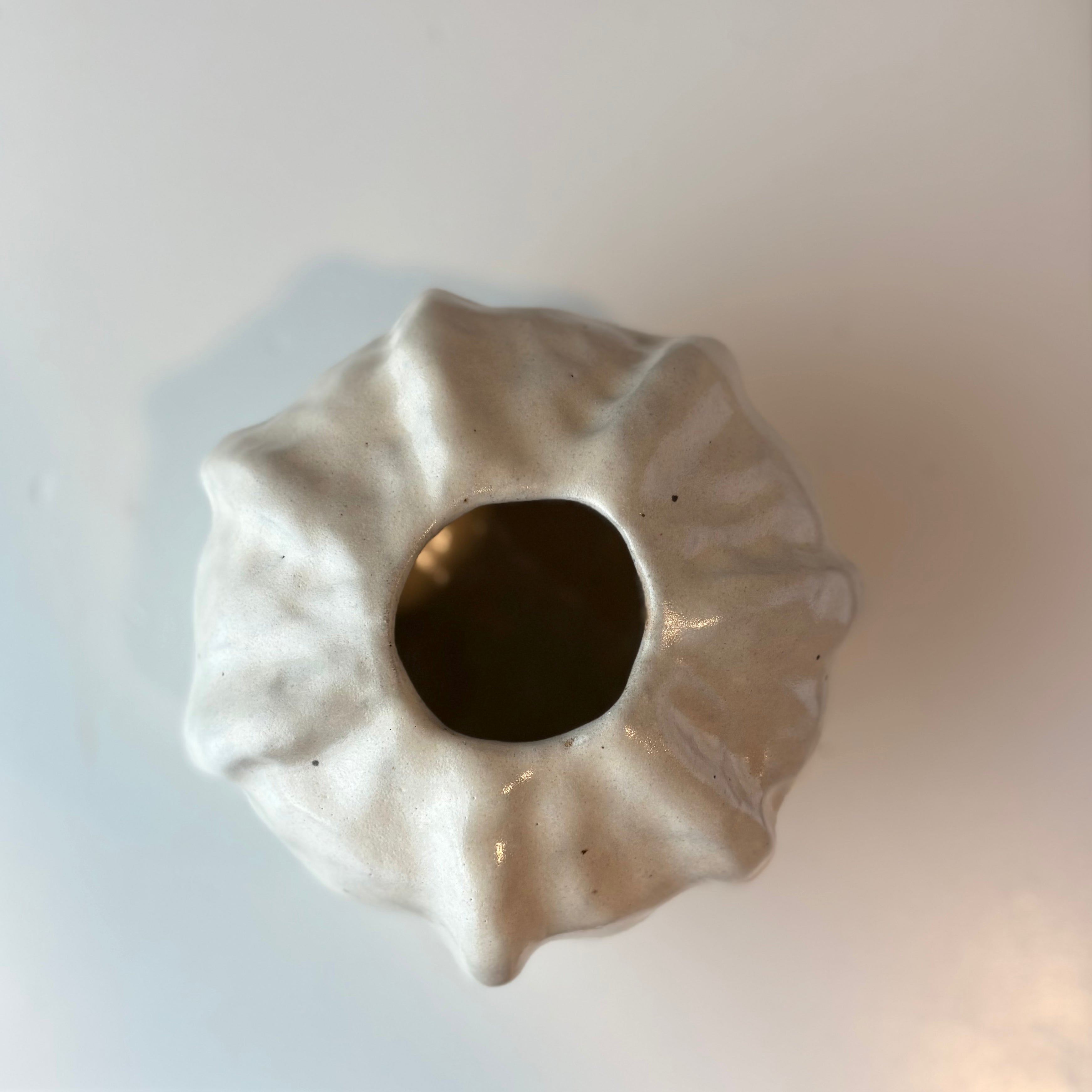 Håndbygget skulpturel unika vase i hvidler, af Leela Mette. Vasen er uglaseret og skaber både liv, dybde og tekstur.