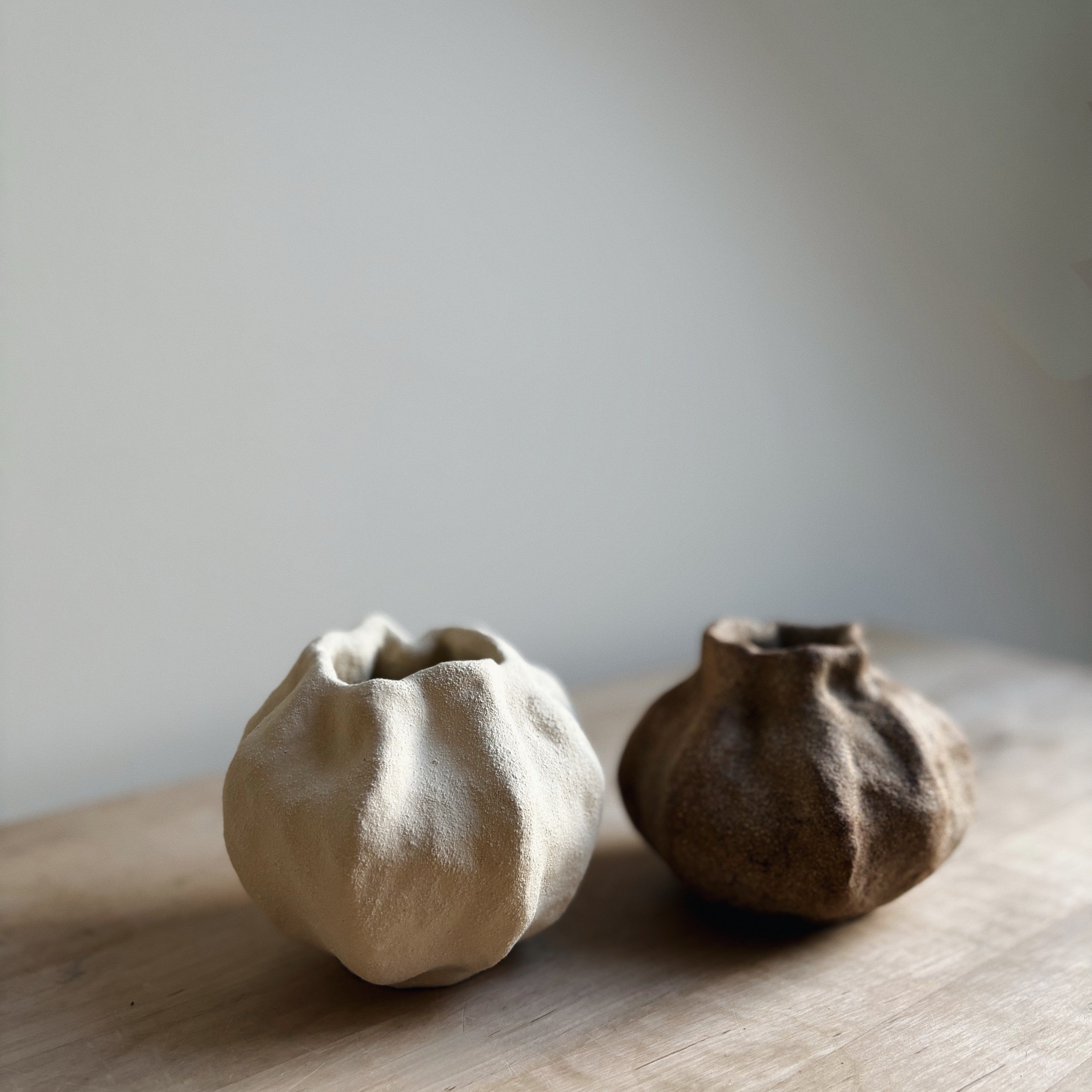 Det håndbyggede ler minder os om værdien af det unikke, det sanselige og det menneskeskabte. Hver vase bærer spor af hænder, der har formet den med omhu – en fortælling i form, tekstur og nærvær.
